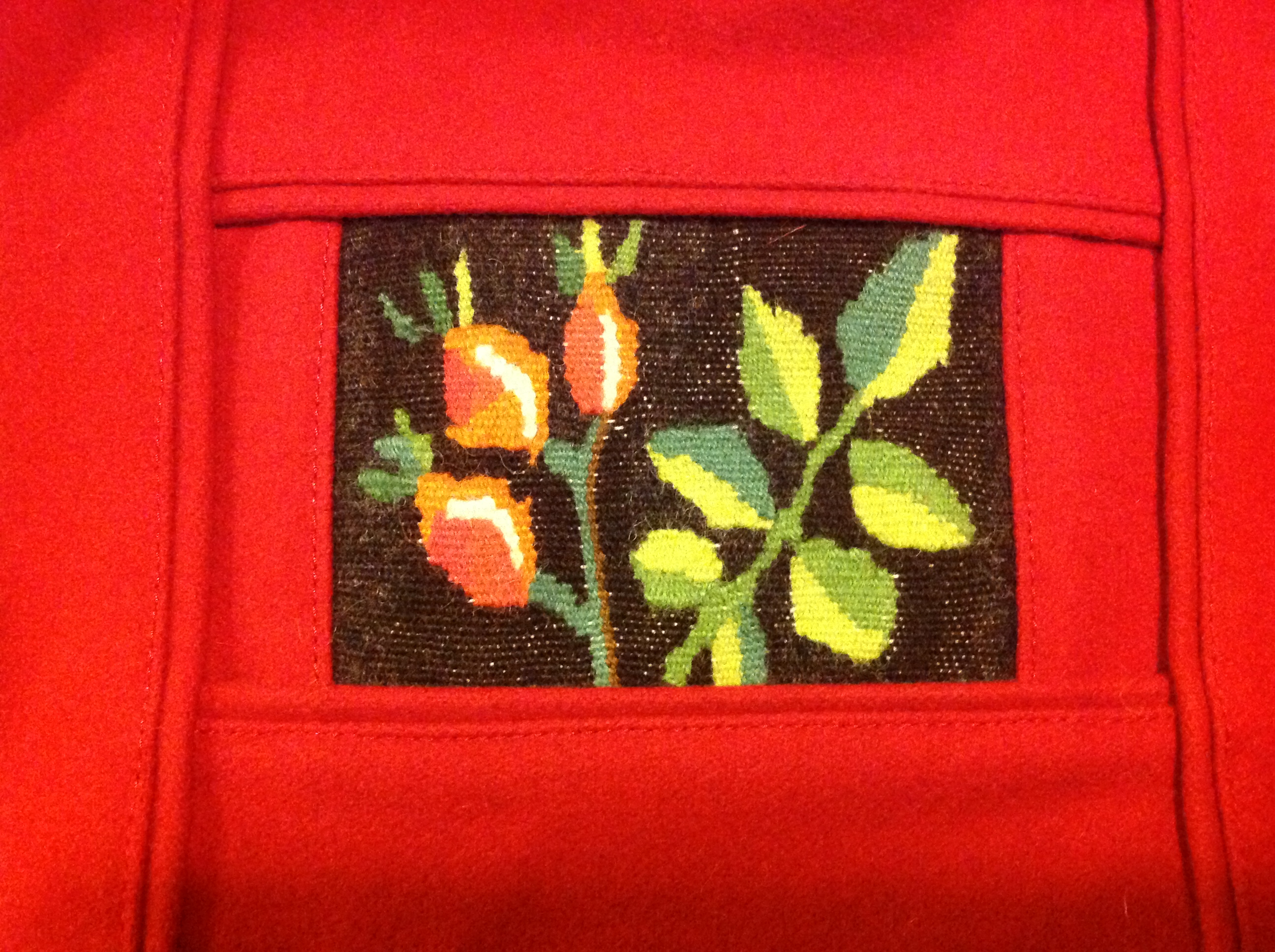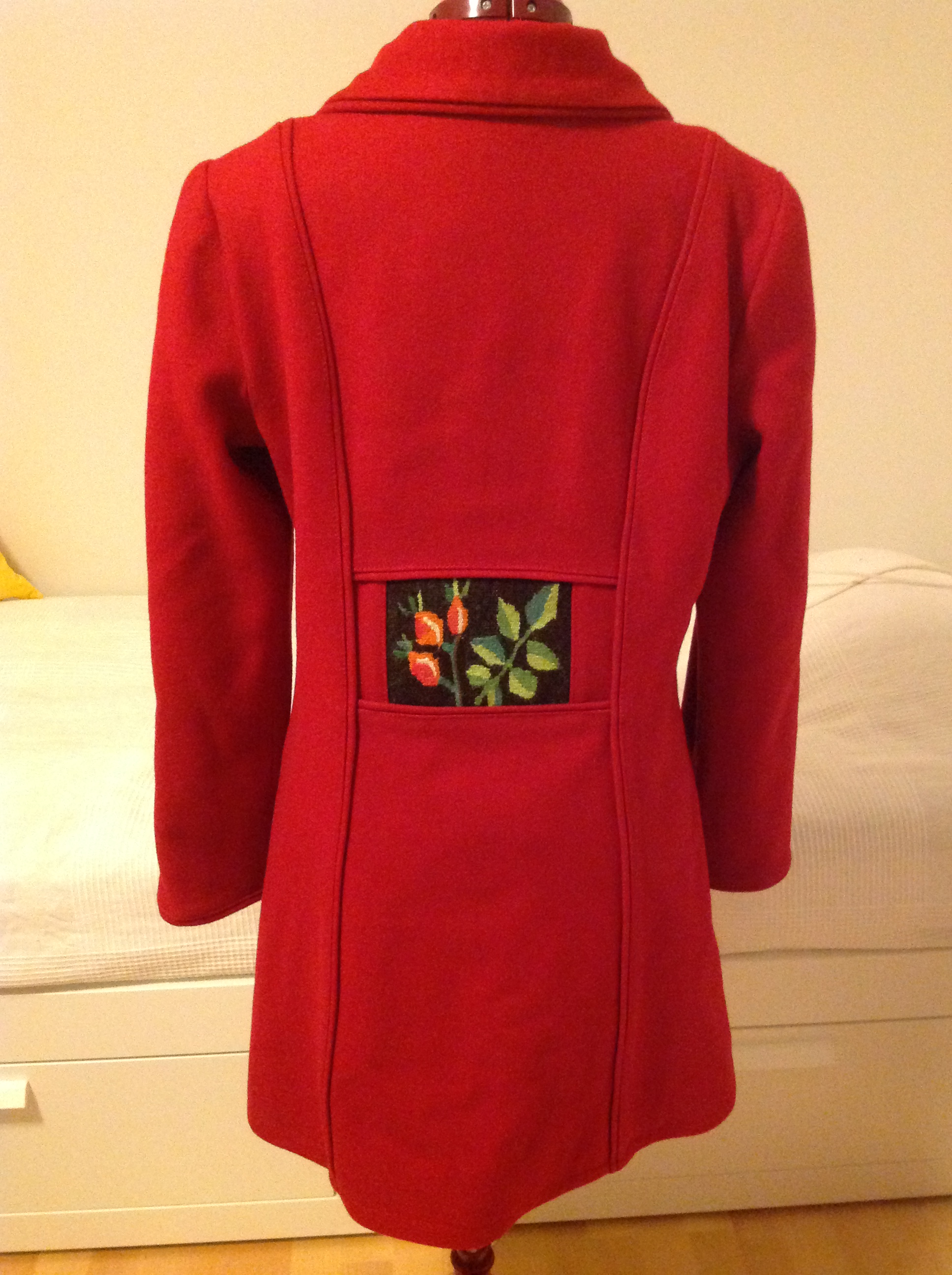 Jag blev helt förälskad i den här vadmalsjackan/-kappan av Kaipa Gunilla Ericsson. Visst är det glädjande att dessa flamskvävda nypon återanvänds och kan beundras igen. Det blir riktigt fint att vända ryggen till när man bär ett sådant här plagg! Du kan läsa om Gunillas designfilosofi på www.kaipa.se.