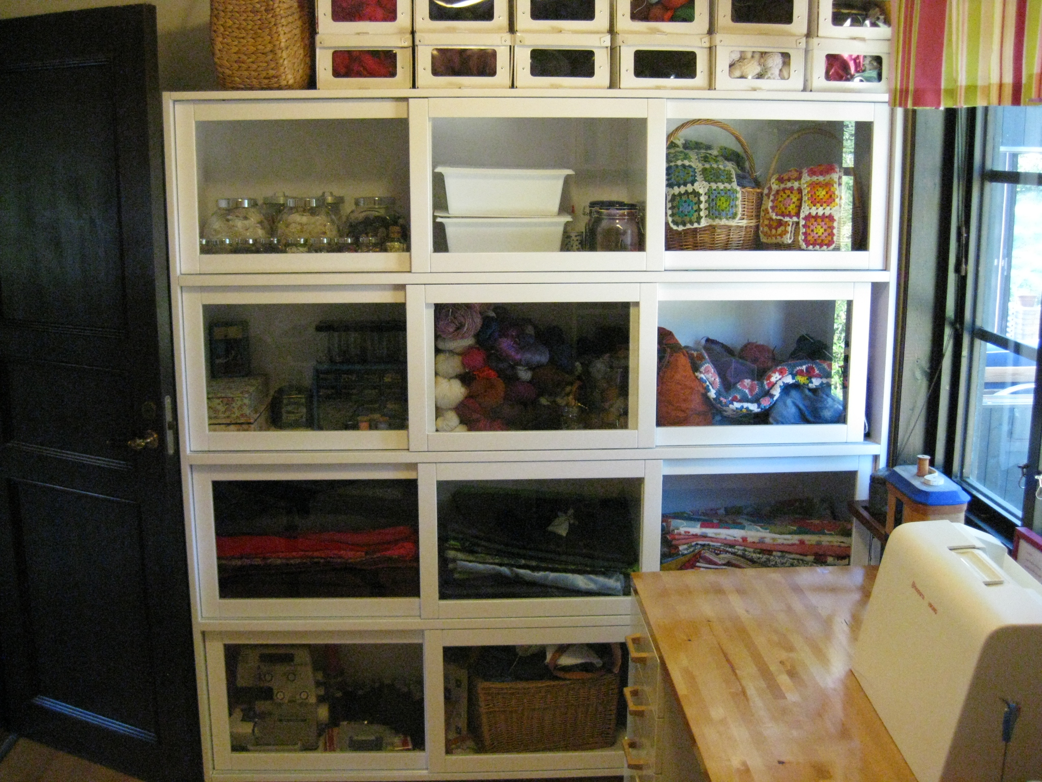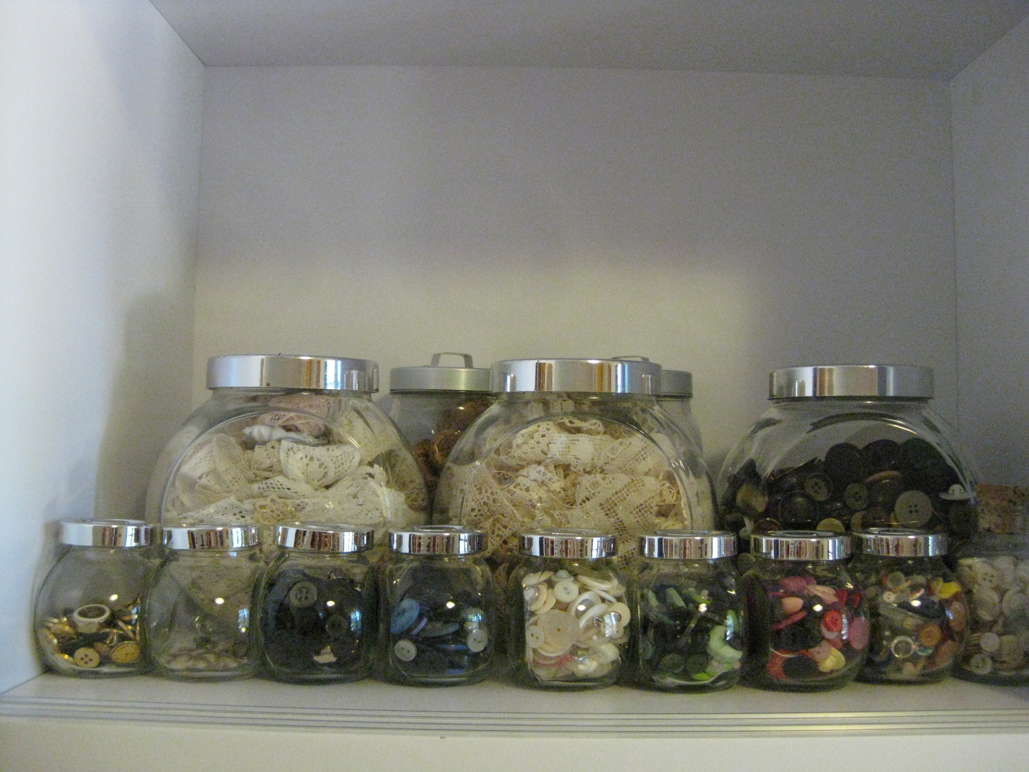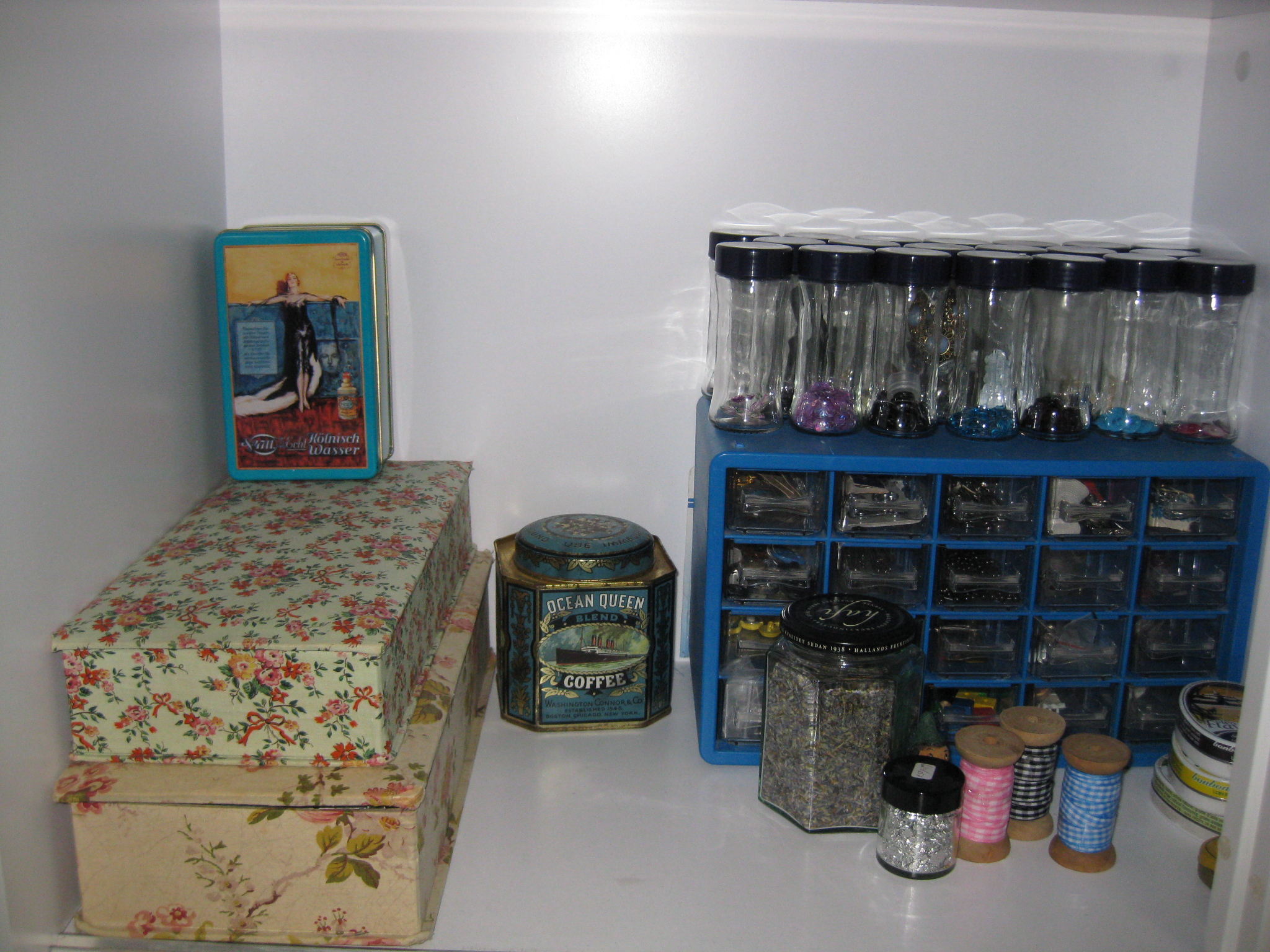 Band i tygklädda lådorna till vänster, knappnålar i gamla kaffeburken och paljetter och knappar i kryddburkar jag sparat.
