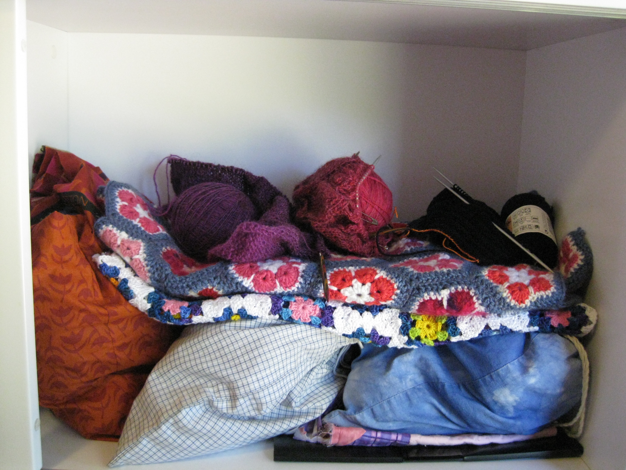 här skulle bringas ordning och reda! Repade till och med upp en påbörjad stickning – inspirerad av Elisabet med bloggen Textila inslag http://textilainslag.wordpress.com/. Garnet blev lite krusigt så jag snurrade upp det på en flaska och fuktade det lite. Man har väl läst ”Mors goda råd om lite av varje” :).