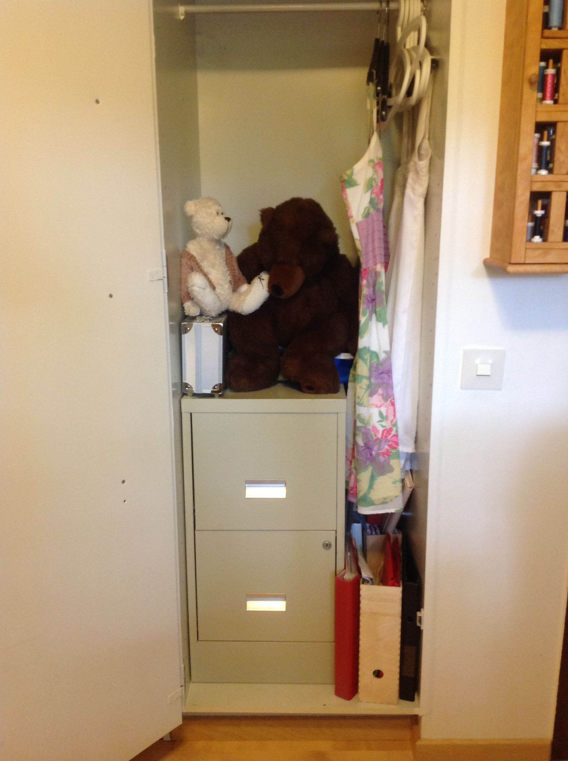 I was fortunate to find this file cabinet in a seconhand shop last year. The hanging folders, which do not appear to be used, came with. It fits in our daughter’s wardrobe. She has moved away from home, but the teddy bears still stay with us …