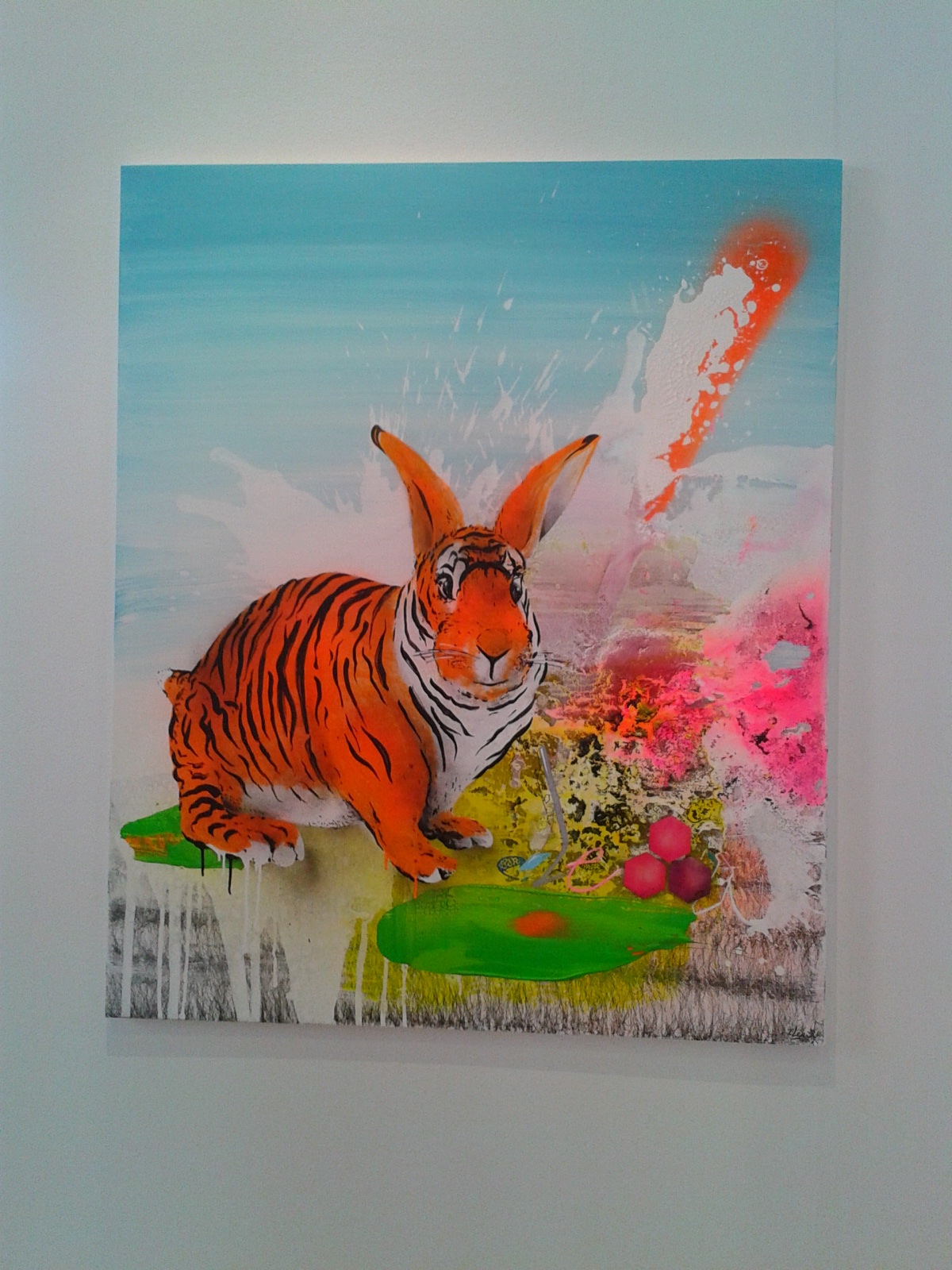 Först såg jag utställningen Graffiti. Fyra av de konstnärer som medverkat i utsmyckningen av Söndrumsskolan ställde ut i Halmstad Konsthall som inryms i biblioteksbyggnaden. Jag fastnade för denna målning – GMO Ralph som väcker frågor kring genmodifierade organismer. Kan inte förklara varför den fascinerade mig så, kanske för att jag har två lejonkaniner själv ;).