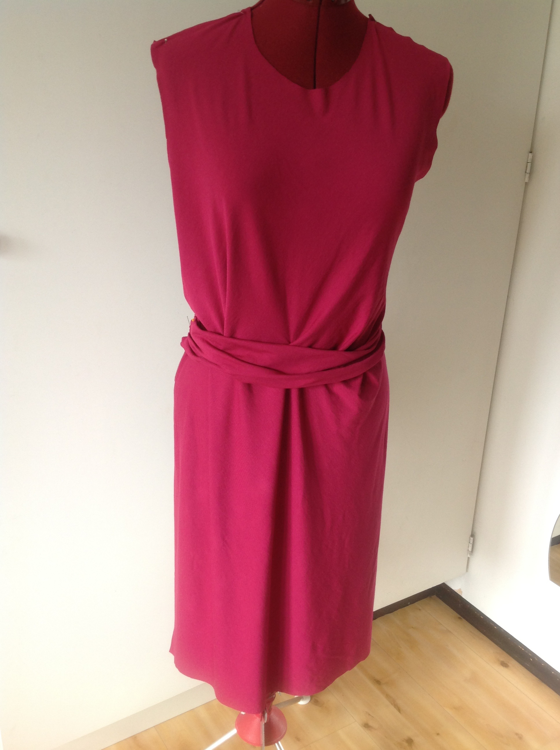 imageNu har jag klippt till framstycket till klänningen och jag tycker det ser ut att bli som jag tänkt mig. Tyget ser ut att räcka till bakstycket och ärmarna också och det är ju bra … Det behövs dessutom tyg till ett innerliv som håller ihop draperingen. Antingen får jag skarva bakstycket till innerlivet eller så får jag köpa mer tyg i alla fall. Det blir inte så snyggt om skarvningen syns igenom bakstycket.