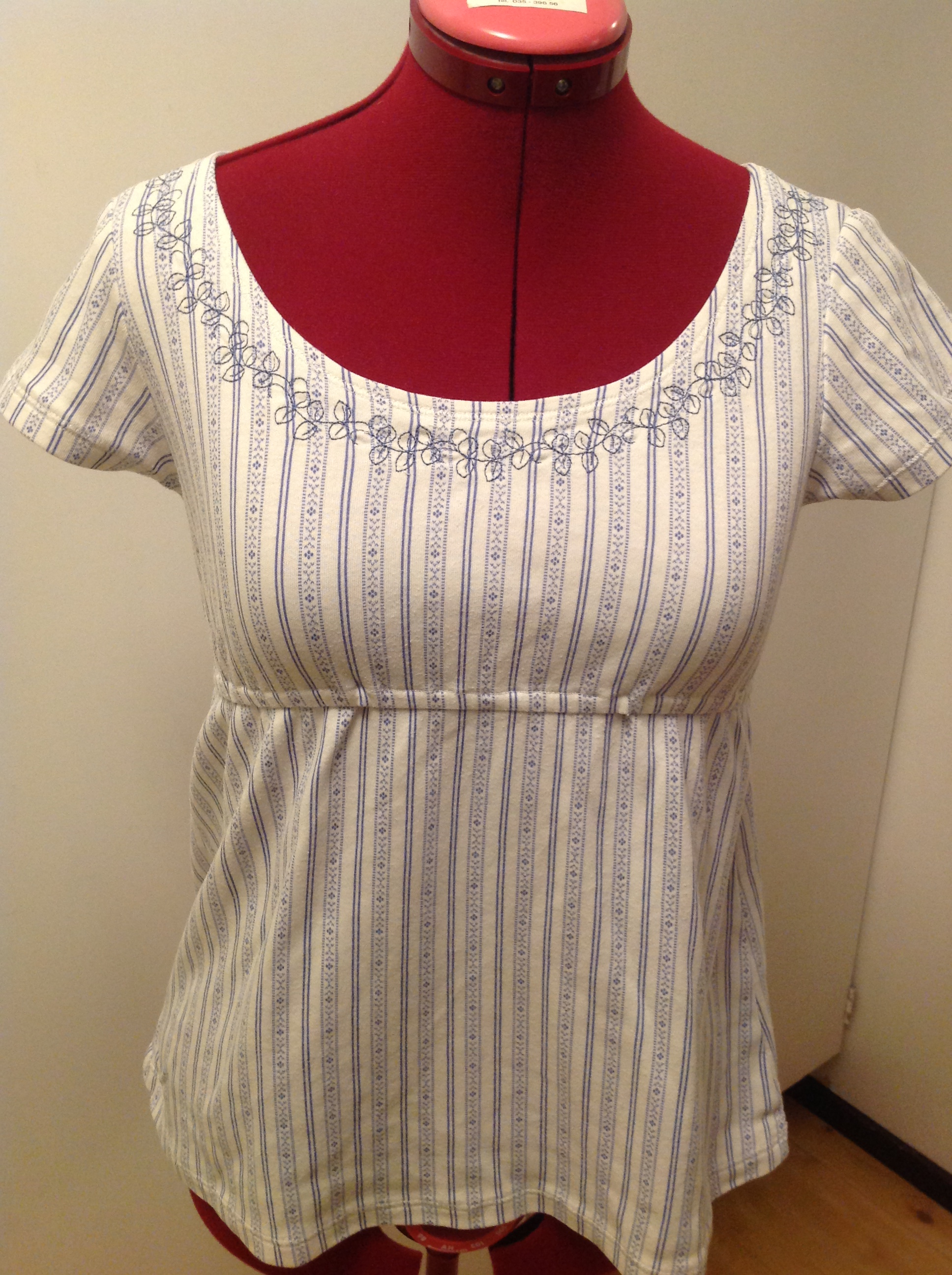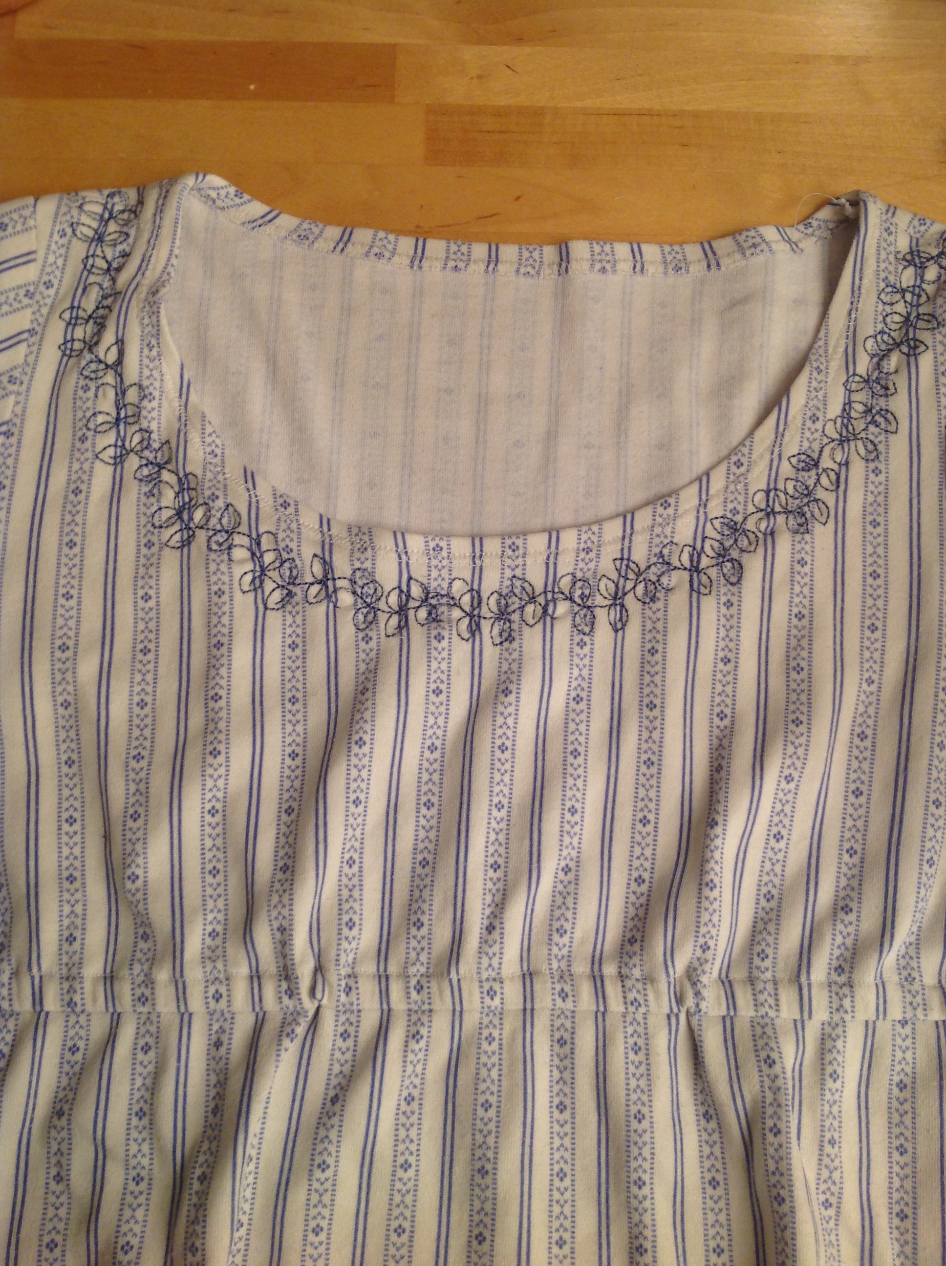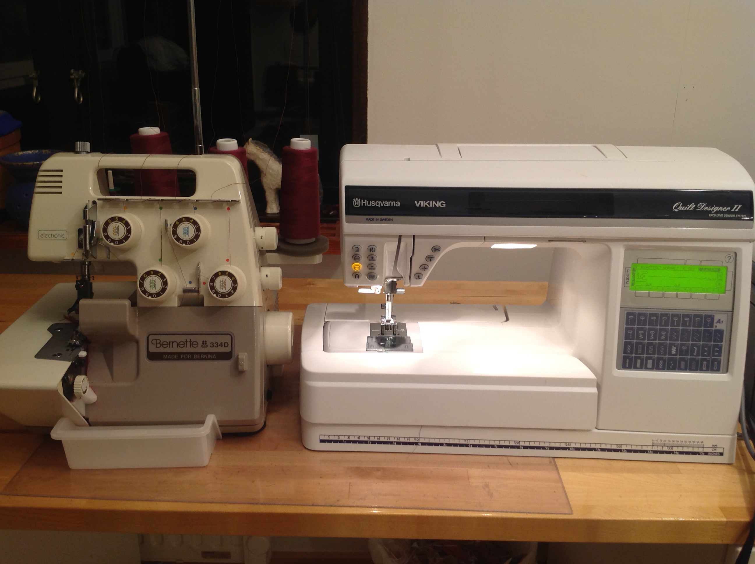 Så kommer vi till symaskinerna.IMG_0363Overlocken har hängt med sedan 80-talet. Den är rejäl, ful som stryk, men står stadigt på bordet. Inga plastdetaljer där inte! Hushållssymaskinen är sju år. Den ersatte en Bernina som jag sytt mycket med och som behövde repareras. Jag bestämde mig för att köpa en ny symaskin istället, hade hemma flera olika innan jag bestämde mig. Jag är mycket nöjd med maskinen, men kanske jag hade haft andra urvalskriterier idag än jag hade för sju år sedan. Då tänkte jag att jag ville ha en maskin som man kunde köpa en broderienhet till, så att man kunde brodera stora motiv med den. Men det skulle jag ha gjort ganska snabbt, för både symaskinsmodell och broderienhet utgick ur sortimentet innan jag kom till skott … Ja, ja,  jag köpte i alla fall några ”kort” från början som gör att jag bl.a. kan sy upp till 4 cm breda bårder. Att maskinen kan sy så brett beror på att den matar även i sidled – känns ganska kymigt kan jag lova! Tack vare detta ska  man också kunna sy fast laglappar på exempelvis byxben utan problem. Man trär bara på benet på friarmen och så kan man alltså sy både framåt, bakåt och åt sidorna. Minns att jag tyckte att det verkade väldigt bra, men har faktiskt inte använt mig av den funktionen. Något som jag använder nästan jämnt är nålstoppsfunktionen. När man slutar sy, stannar maskinen med nålen nere i tyget och pressarfoten lyfts en aning så att man kan vrida tyget runt nålen. Jättebra i hörn! När man sen trampar på gasen igen fälls pressarfoten ner av sig själv. Hands free! IMG_0366Här är en bård sydd med symaskinen ovan. Blev rätt fint, tycker jag.