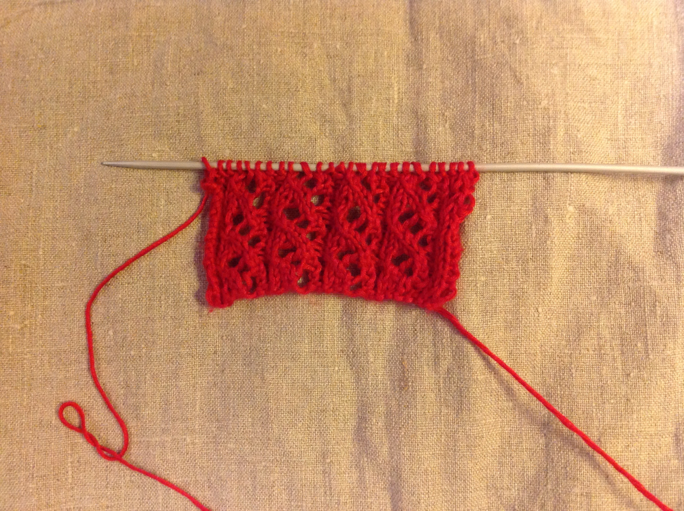 Jag har tagit fram Emelie igen – den röda koftan jag började på förra sommaren. Början gick ju inte så jättebra (om det kan du läsa här), och vi är inte riktiga vänner än, Emelie och jag. Dels har jag kommit av mig vad det gäller mönsteravläsningen, dels har jag valt ett lite svårstickat garn. Garnet är Blend bamboo, 70% bambu och 30% bomull, från Hjertegarn. Det är väldigt mjukt och skönt och jag tycker om den röda nyansen, men garnet delar sig gärna. Det är speciellt irriterande när det händer nu när jag provstickar hålmönstret. Det ligger så att säga i sakens natur att det blir ett och annat misstag när man gör en provlapp, men det kan ändå göra mig lite smått irriterad. När sedan garnet delar sig och trasslar när jag försöker ta upp det som blivit fel genom att ”sticka baklänges” – då blir jag riktigt purken. Trodde att jag äntligen fått till flätpanelen