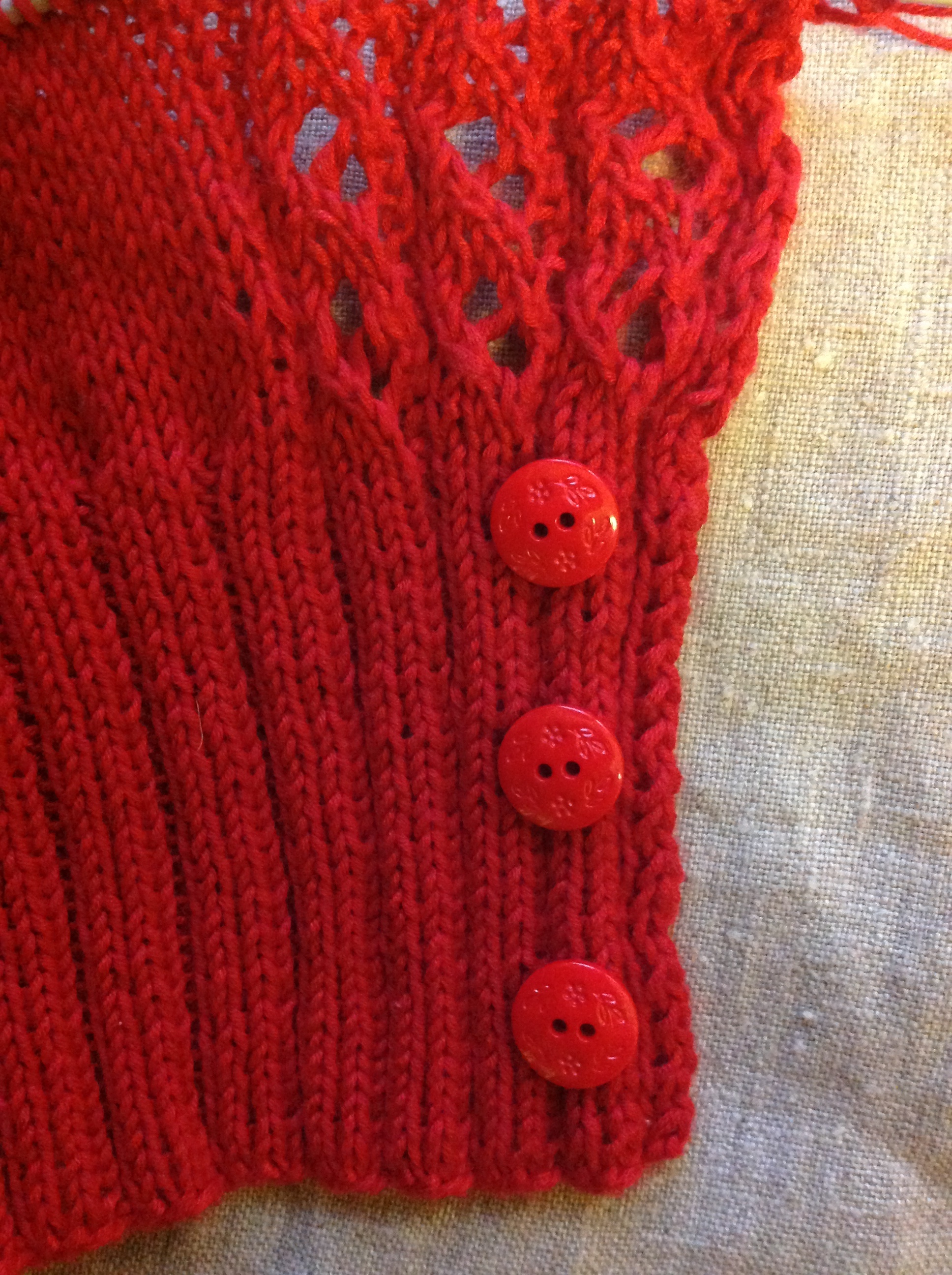 Knapparna till koftan tycker jag inte är för l ljusa. Det är ju modernt att blanda olika röda färger, det kan man ju se på plagg ute i handeln, men du skall ju själv vara nöjd KeA