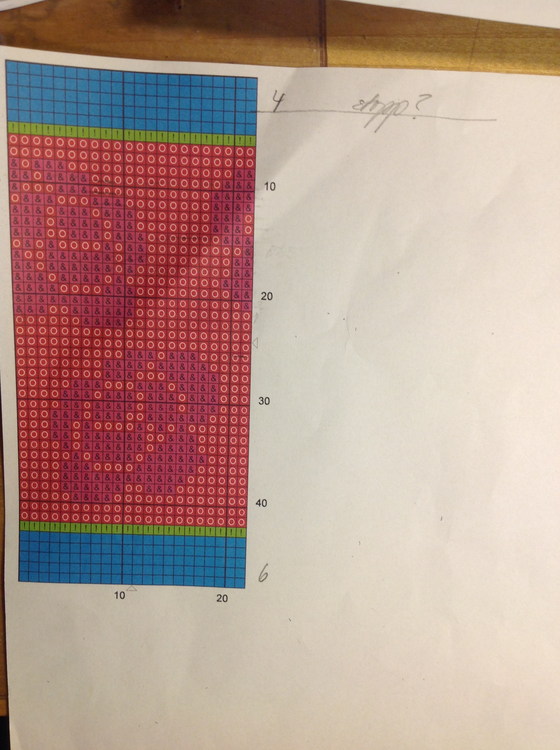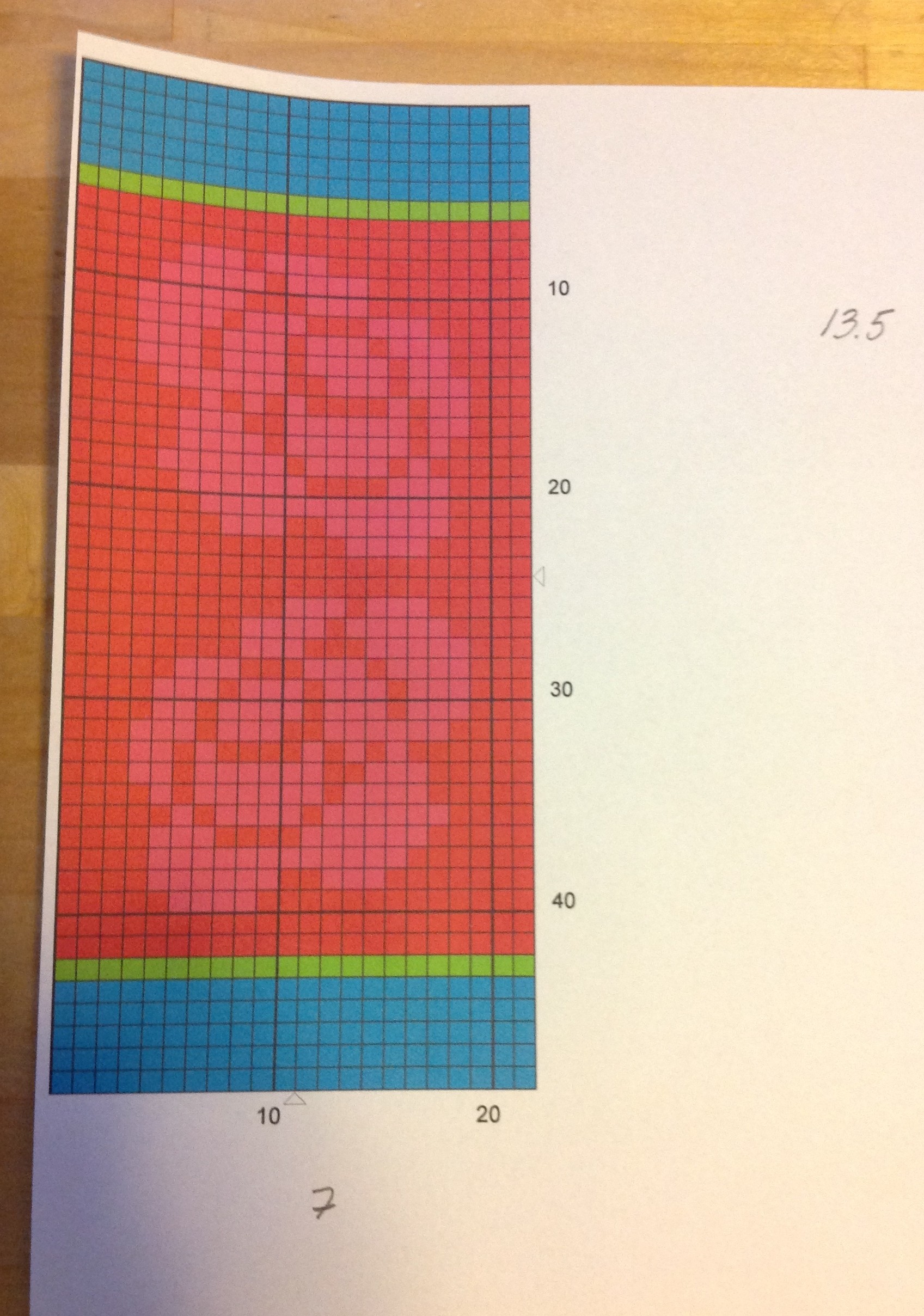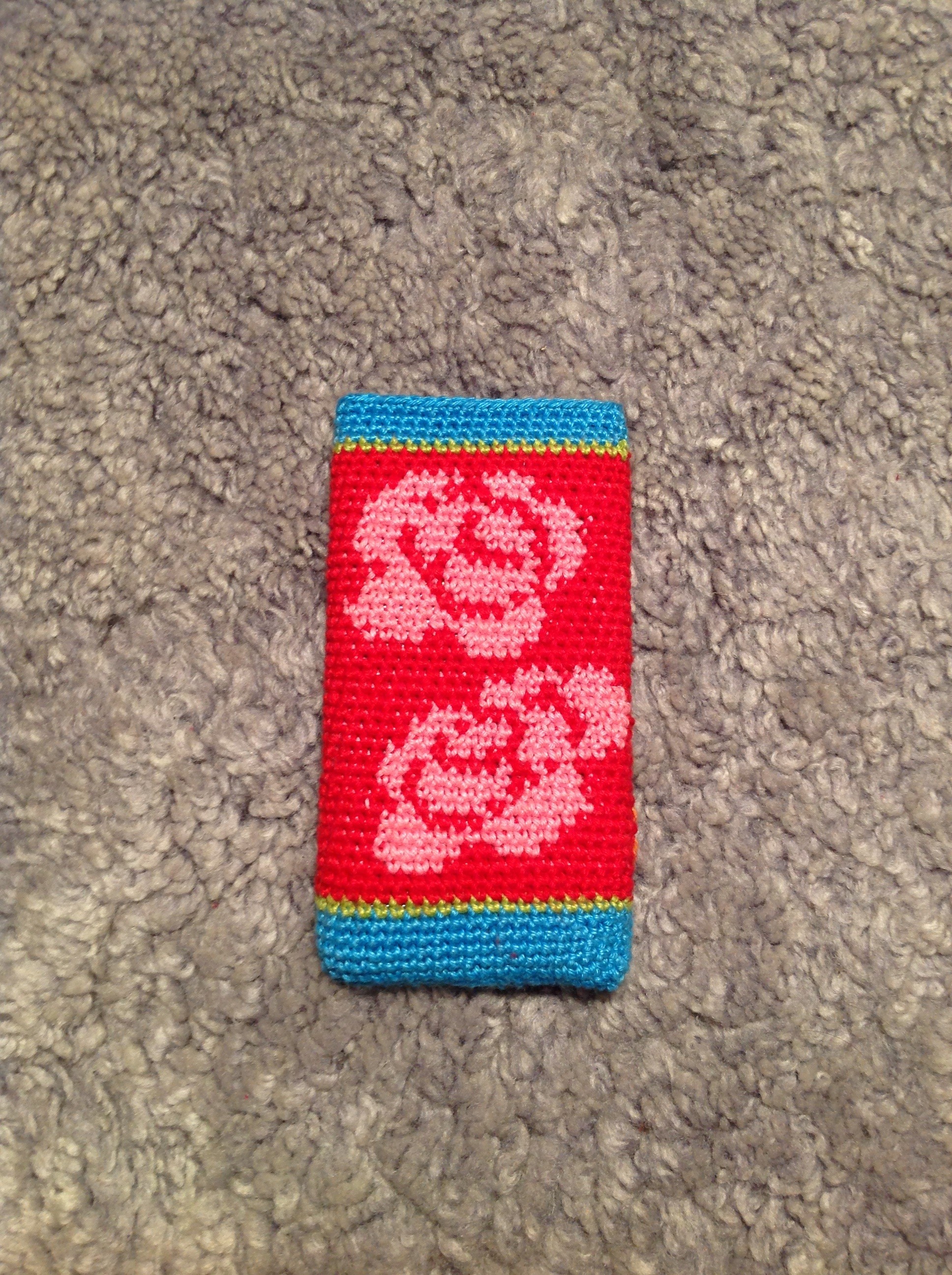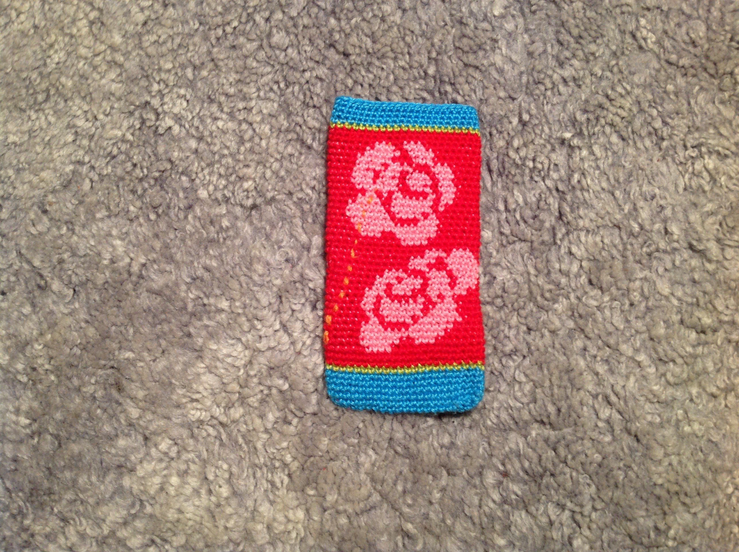 Så här knepigt såg det ut, men det blev ju rätt. Nedersta rosen är ju lite mera ”utdragen” på mobilfodralet men det tycker jag är OK. För mig var det viktigast att blommorna blev placerade rätt i förhållande till varandra och så mitt på fodralet som jag kunde åstadkomma. Och om du undrar så skrev jag denna gång ut mönstret med både färgade rutor och symboler för att se mönstret tydligare.