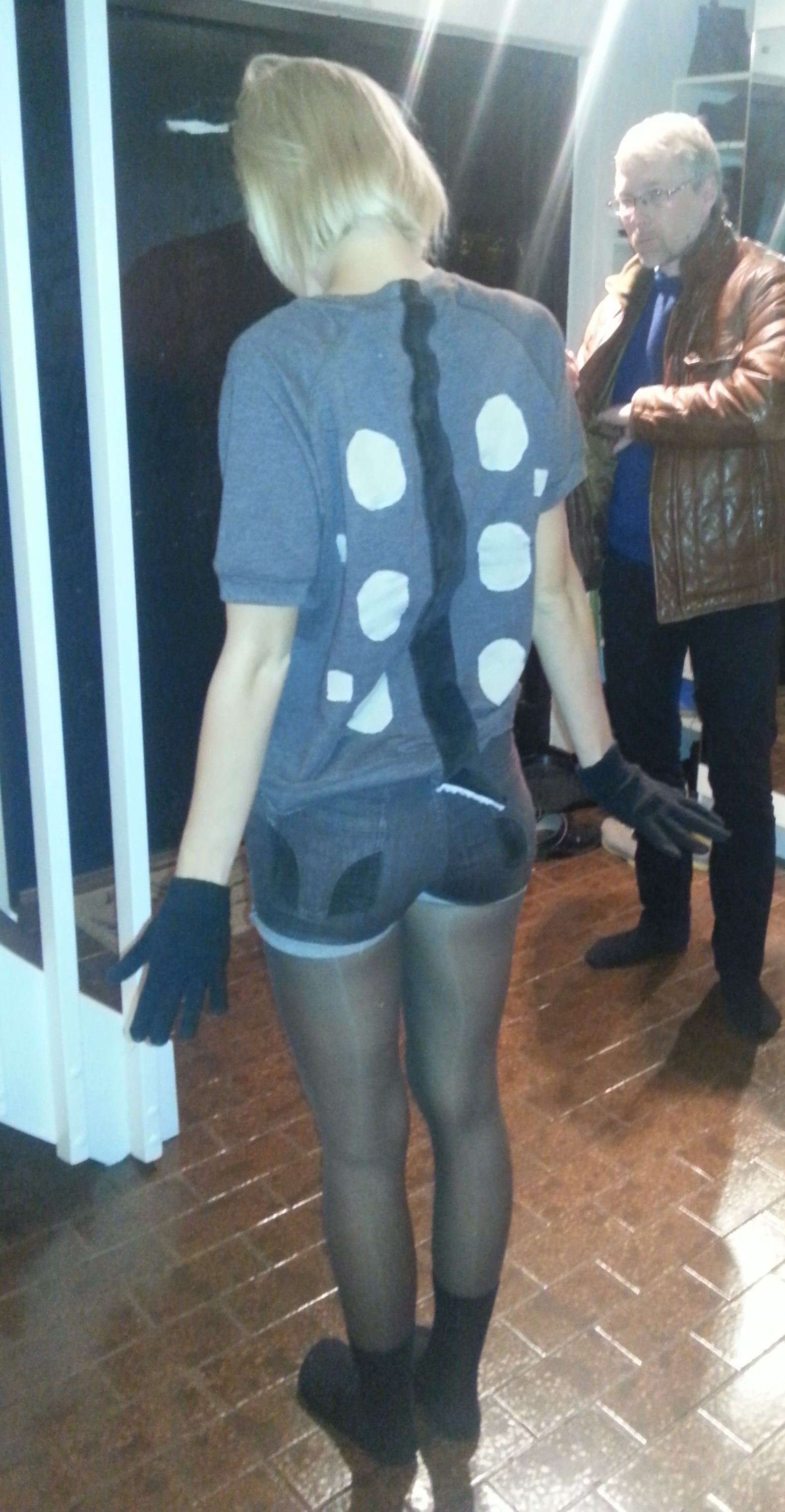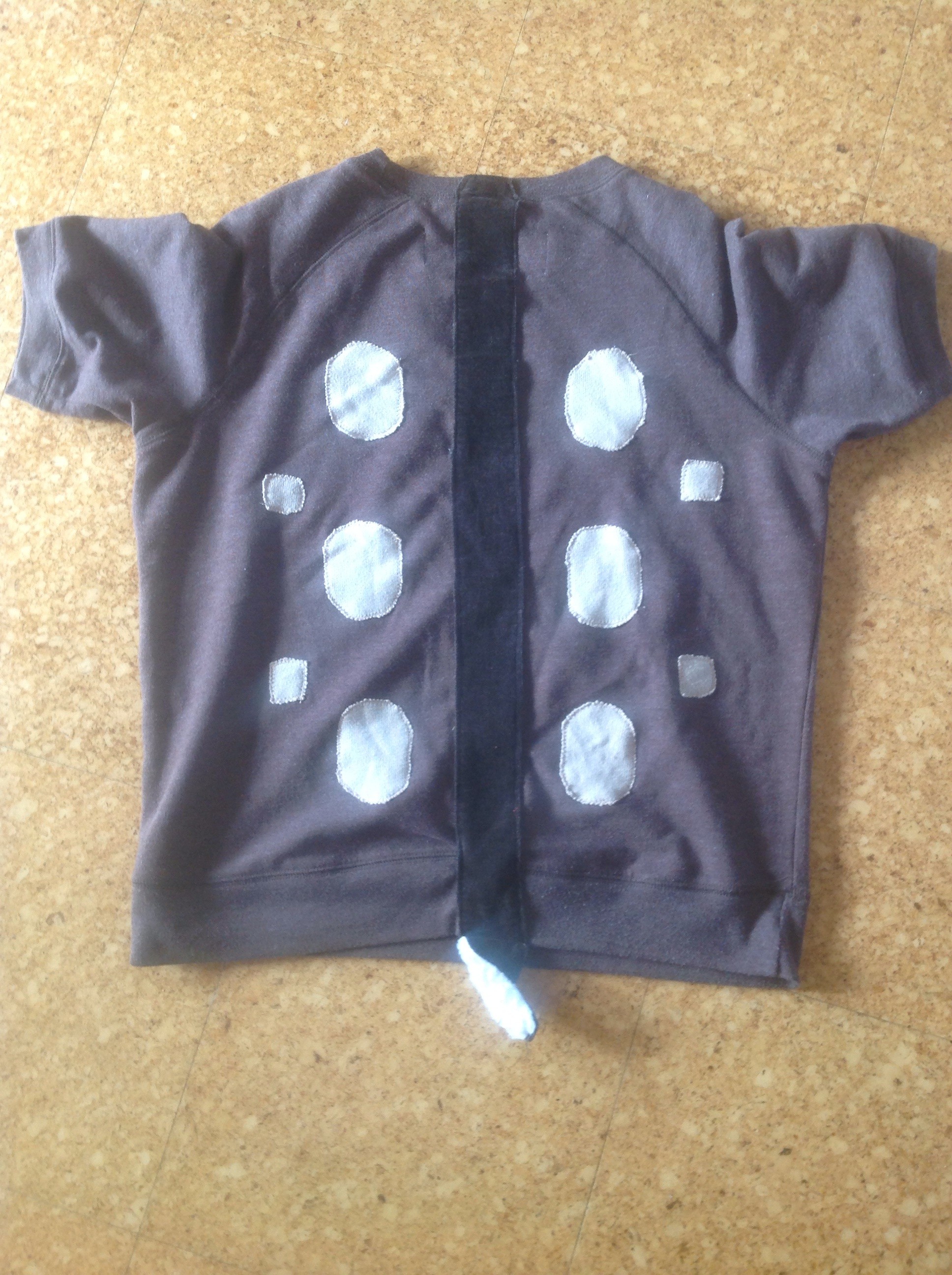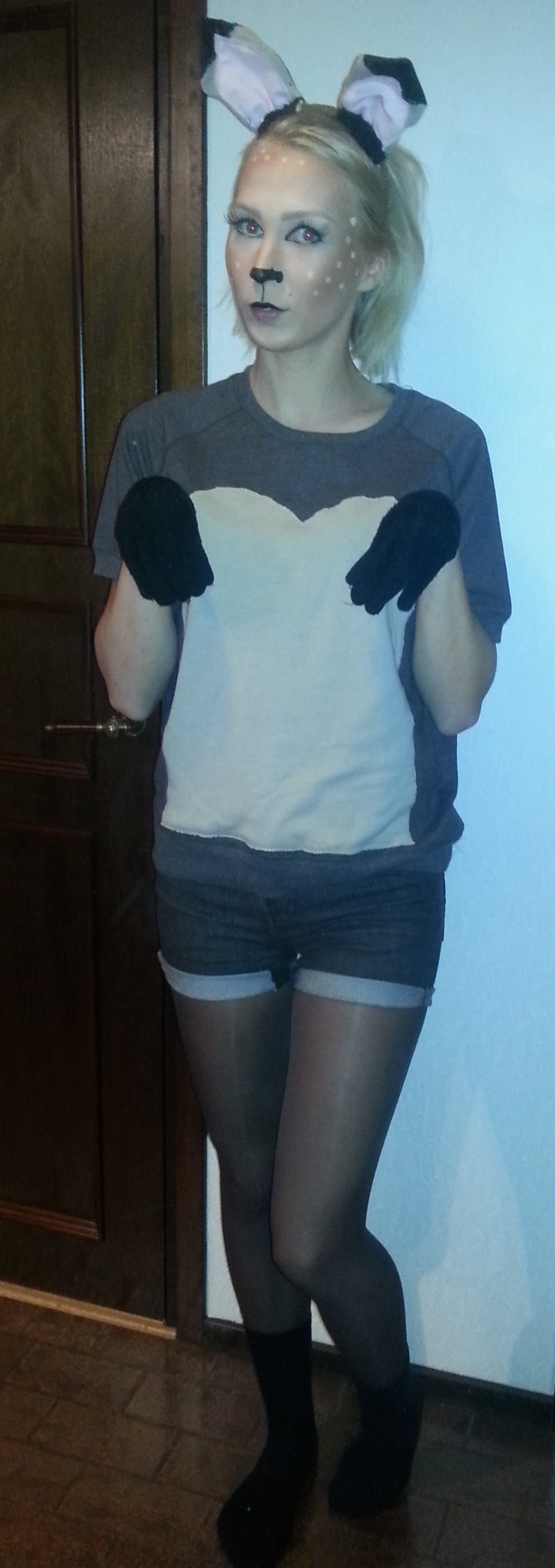 Hon hade ett par bruna byxor med mockaimitation i sidorna. Hon klippte av dem till ett par shorts och med lite sprätthjälp av storasyrran fick hon loss ”mockan”. Den använde hon sedan dels till att sy öronen av, dels till den mörka randen på ryggen som Bambi har på alla bilder. Pappas gamla lammullsväst fick bli det ljusa på magen och fläckarna på ryggen.
