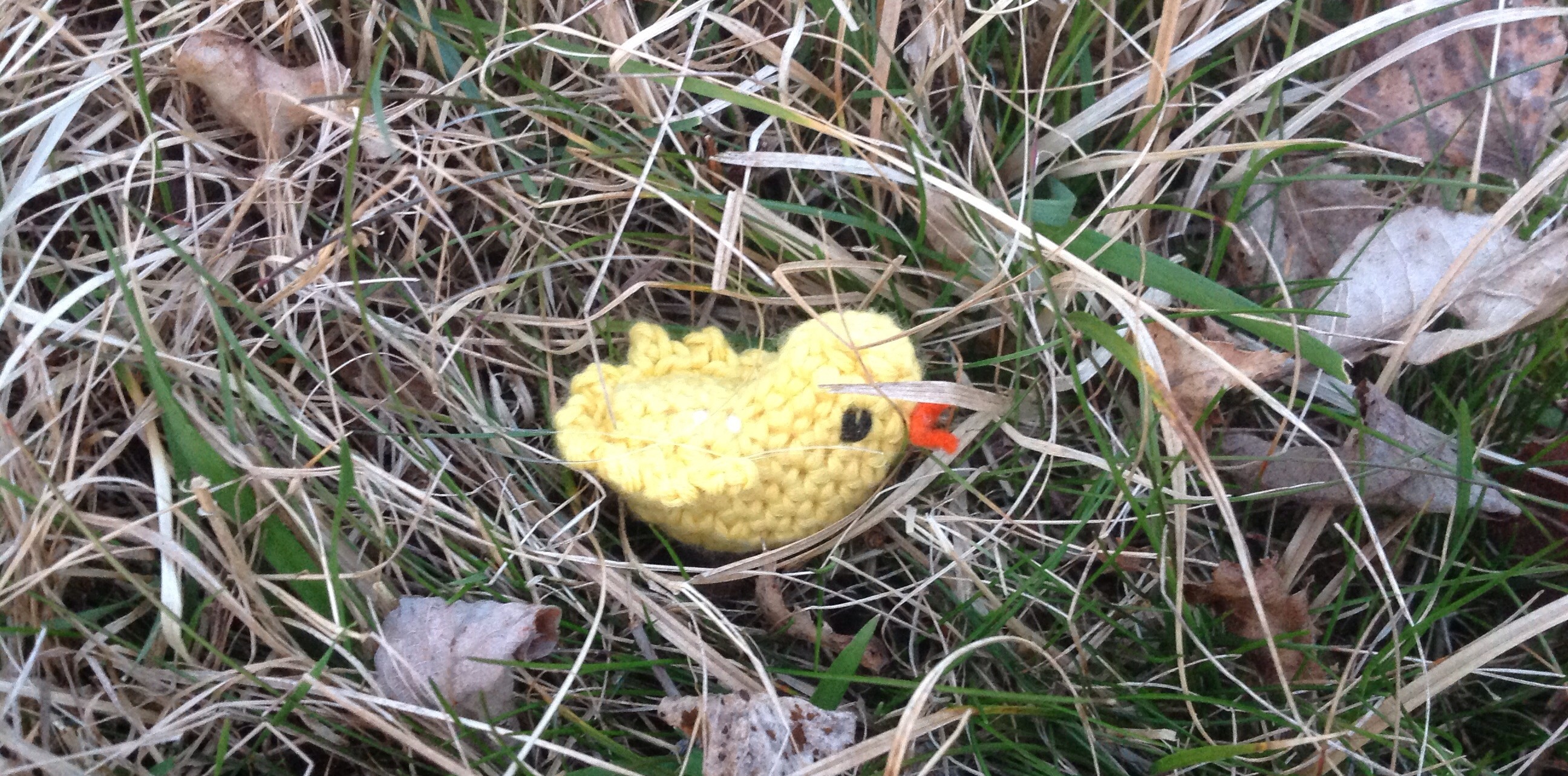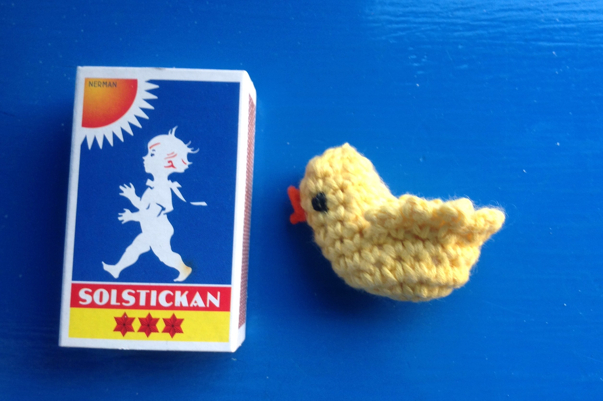 Nu skulle jag ju egentligen koncentrera mig på att sticka klart två koftor som jag haft på gång länge. Så dök det upp en liten virkad kyckling ur gömmorna. Jag köpte den på en basar en gång för att ha som modell och inspiration – kanske till eleverna i skolan. Men jag har inte tagit mig tid att fundera ut hur den är gjord. När den nu kom fram lagom till påskförberedelserna tänkte jag att en liten kyckling kunde jag väl ändå försöka mig på. Och nog blev den liten alltid …