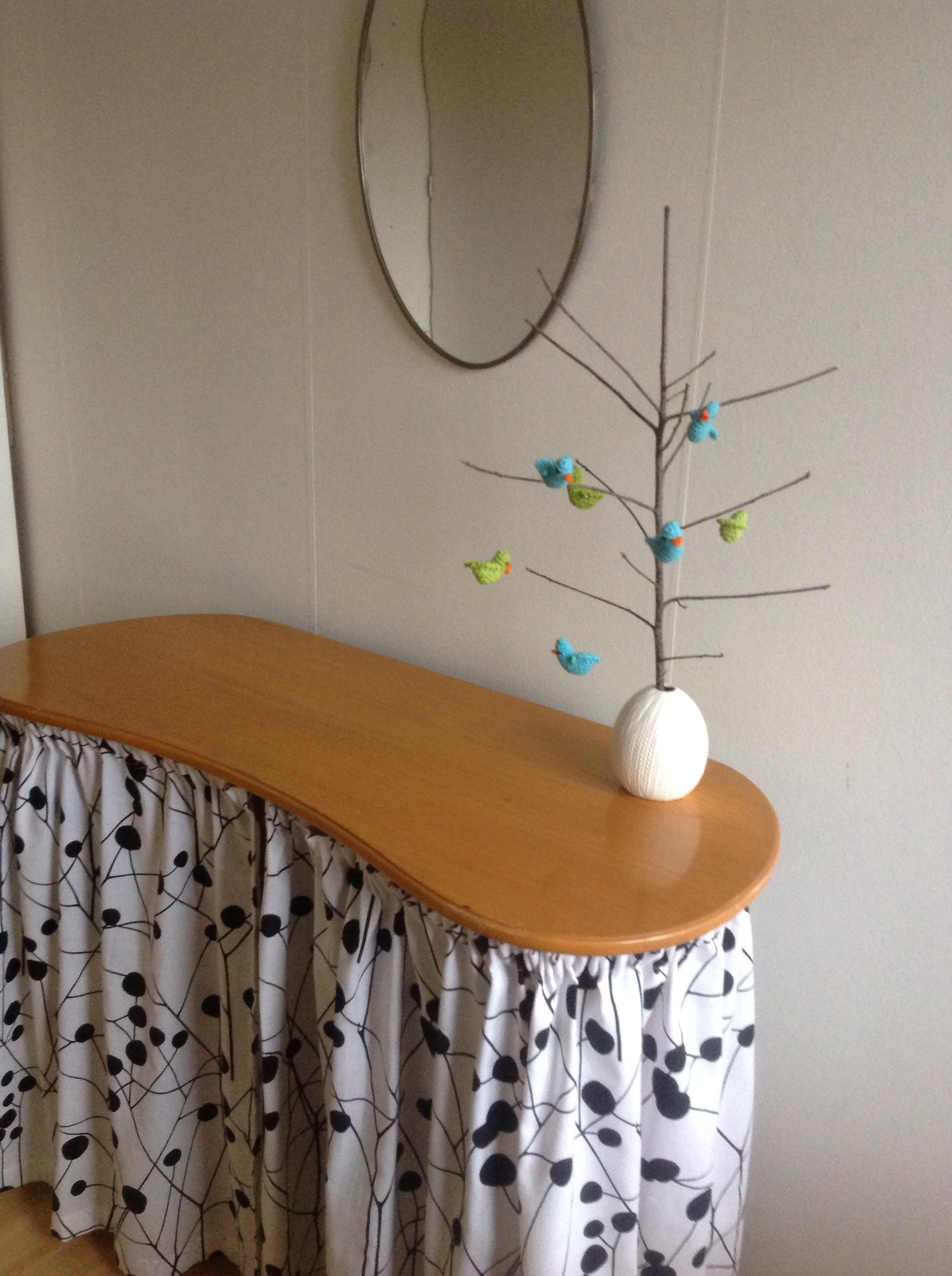 Ida får turkos och limegröna kycklingar – eller är de kiwigröna? Här ser man förresten hur toalettbordet blev med ”kläder på”, det som jag skrev om strax innan jul. Någon ny spegel har jag inte köpt, utan hängt upp mormors gamla. Nu saknas bara en schysst belysning – så att man verkligen vet hur man ser ut när man fiffat sig.