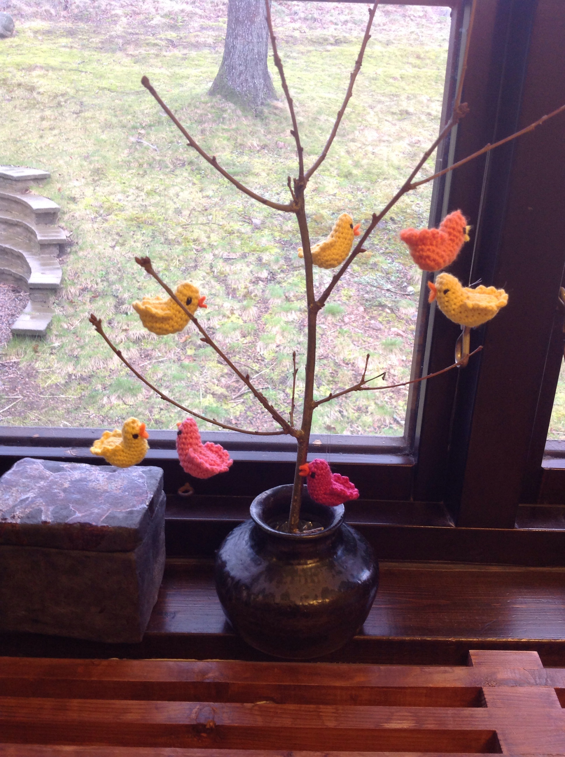 För en vecka sedan fick jag ju för mig att jag skulle virka en påsk-kyckling. Det var riktigt roligt, så det blev flera … och ännu flera … Nu har jag virkat en uppsättning till vardera dotters rum.
