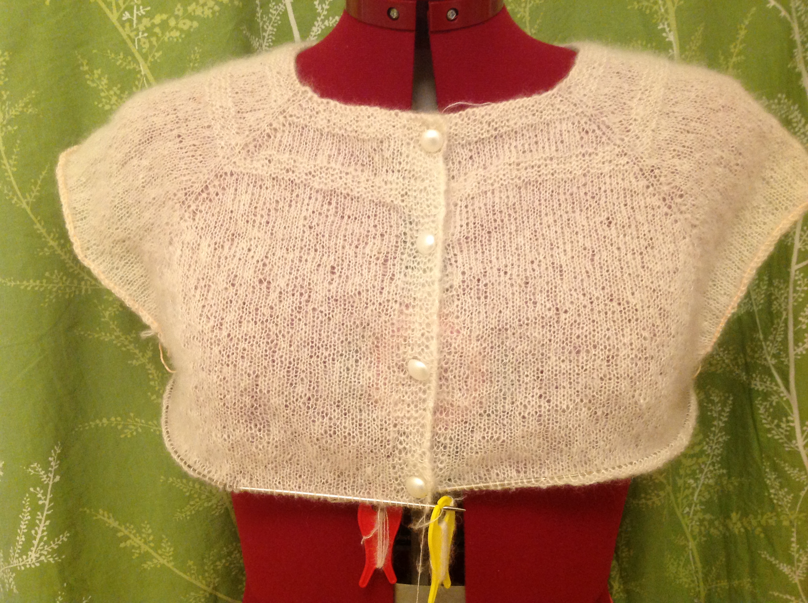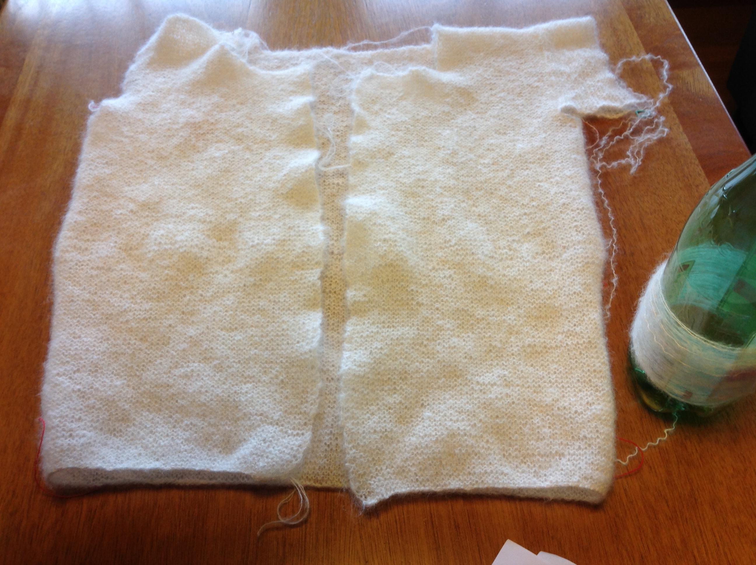 Ungefär så här långt hade jag kommit när mor provade koftan och den visade sig vara lite väl tight. Så … upprepning igen, men bara till ärmhålen den här gången. Det är ju egentligen helt otroligt att jag har repat upp den här stickningen flera gånger och garnet har ändå behållit sin luddighet. Överhuvudtaget har det släppt ifrån sig väldigt, har inte ”hårat av sig” nämnvärt när jag stickat med det heller. Garnet är Drops Kid-Silk och är av 75% Mohair Super Kid och 25 % silke.
