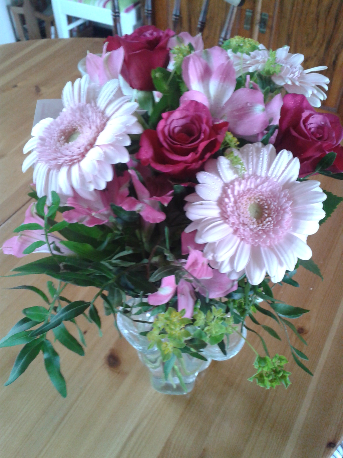 Nu måste jag bara få visa vilka fina blommor jag fick av mina döttrar till Mors dag. De kom med bud igår. Visst är de vackra!
