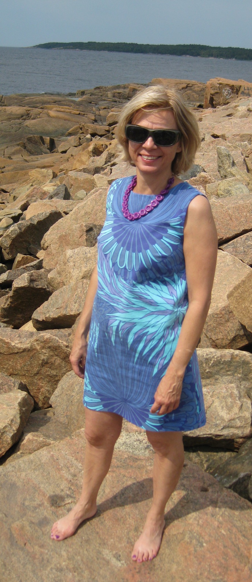 Bilderna är fotograferade vid Grötviks hamn där det var hamnfest idag. Det var som en svensk variant på de där gemytliga engelska tillställningarna man ser i olika TV-serier. Så här gulliga fiskebodar finns nere vid hamnenIMG_1550Sedan åkte vi till Skallkroken vid Haverdal för att prova på kajakpaddling. Eftersom jag var lite osäker på hur jag skulle kunna hantera kajaken hade jag inte kameran med. Men det var inte så svårt, åtminstone inte att svänga åt ENA hållet, det var värre åt andra. Men vi kom in till stranden igen. Sjön suger som bekant (kan detta uttryck möjligen missförstås nuförtiden?) så nästa anhalt blev Särdals kvarn där vi åt räkmackor ochIMG_1552tittade på konst- och fotoutställning och köpte lite presenter. Sedan åkte vi  och badade. Det var uppfriskande, ja, jag kan till och med sträcka mig till att säga att det var skönt. Men jag var inte i särskilt länge. Inga bilder från badet, dock. Var glada för det! Avslutar istället med ännu en bild av duk-klänningen som blivit en Djungel-klänning.IMG_1540Lägg märke till färgmatchningen med halsband (som jag INTE gjort, har fått det av min dotter) och nagellack. Jag har faktiskt köpt ett till som kanske matchar ännu bättre, ett turkos, men jag får samla mig lite innan jag kan använda turkos nagellack. Är riktigt nöjd med hur jag fick till det med mönstrets placering.