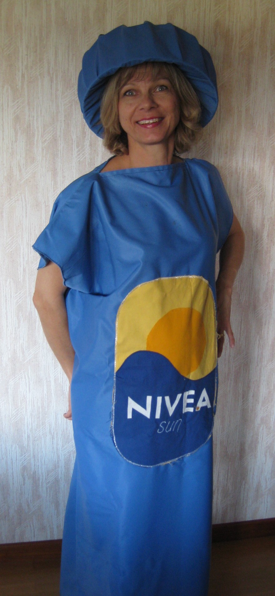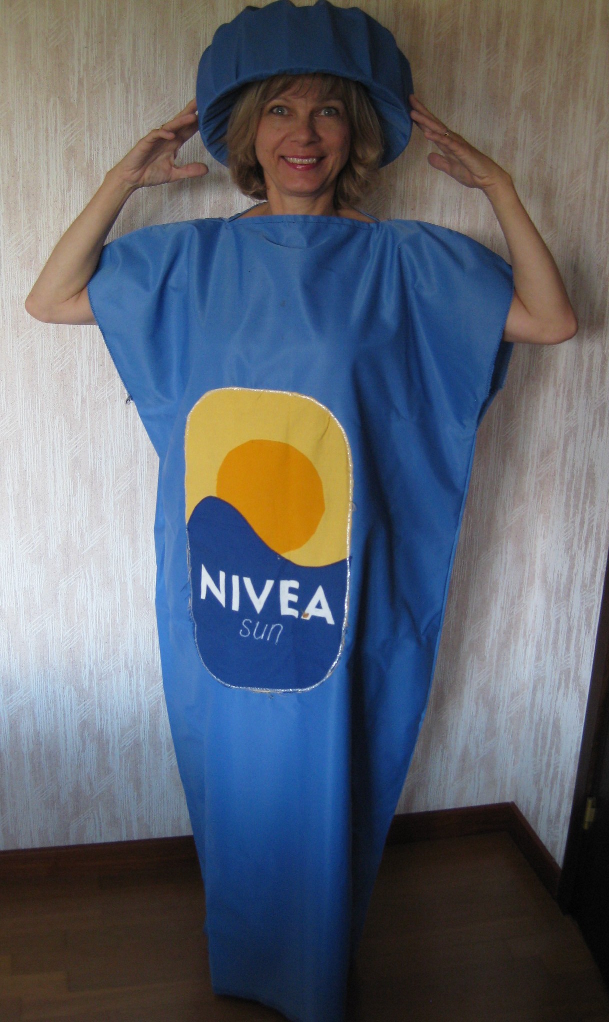 Hej Jennie! Jag lade mönsterpapper på en Nivea-flaska och ritade av loggan. Sedan la jag den avritade loggan i en kopiator och förstorade till önskad storlek. Jag klippte ut en hel logga i ljusgult och strök sedan fast sol och blå våg på den gula biten med hjälp av vlisofix. Bokstäverna har jag klippt ut i dekorationsfilt och limmat fast med textillim. ”Sun” sydde jag med tät sicksack, likaså sydde jag fast hela loggan med silvertråd och tät sicksack på dräkten. Själva dräkten är två hopsydda rektanglar med hål för huvud och armar. Jag hade s.k. bävernylon hemma i rätt blå färg. Hoppas du är nöjd med svaret, annars får du höra av dig igen! Vänliga hälsningar Ewa
