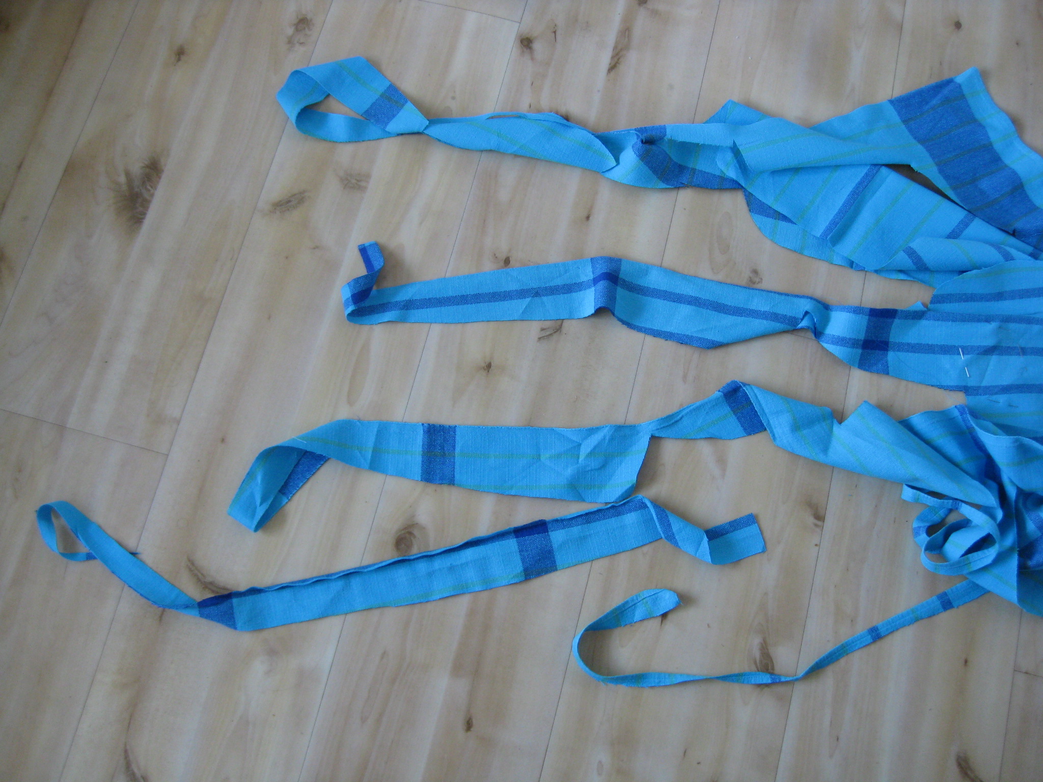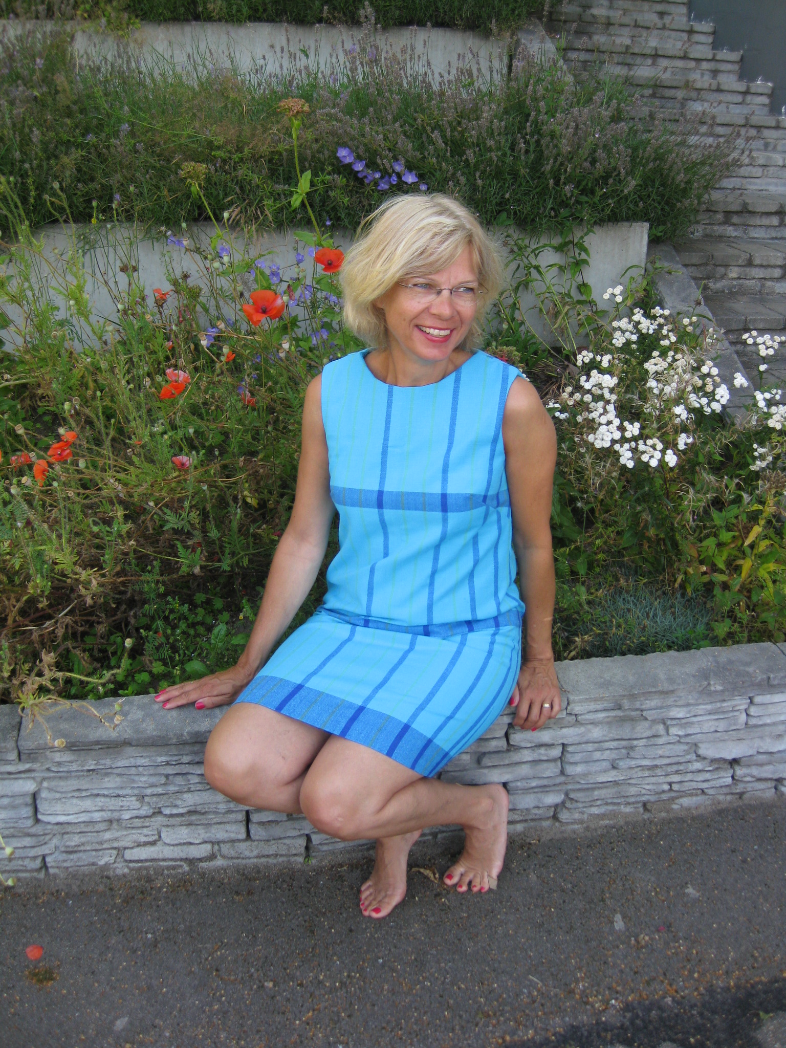 av tyget när jag klippt till delarna till denna sommarklänning. Tyget är en duk som jag köpte på Erikshjälpen förra veckan. Men jag kunde i alla fall göra den lite längre än den förra klänningen jag sydde av en duk. Och jag kunde undvika fläcken som fanns, men som jag inte såg när jag köpte duken. Ränder och rutor kunde trots fläcken placeras som jag först tänkt när jag såg duken så jag är nöjd.