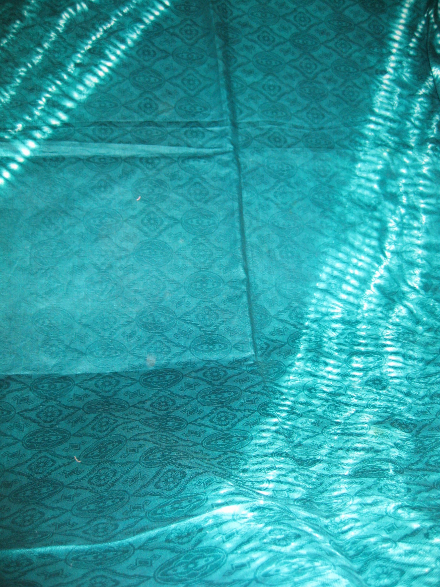 Tyget är ännu en duk, inköpt på Myrorna för några veckor sedan. Jag fastnade för att det ger så olika intryck i olika ljus: