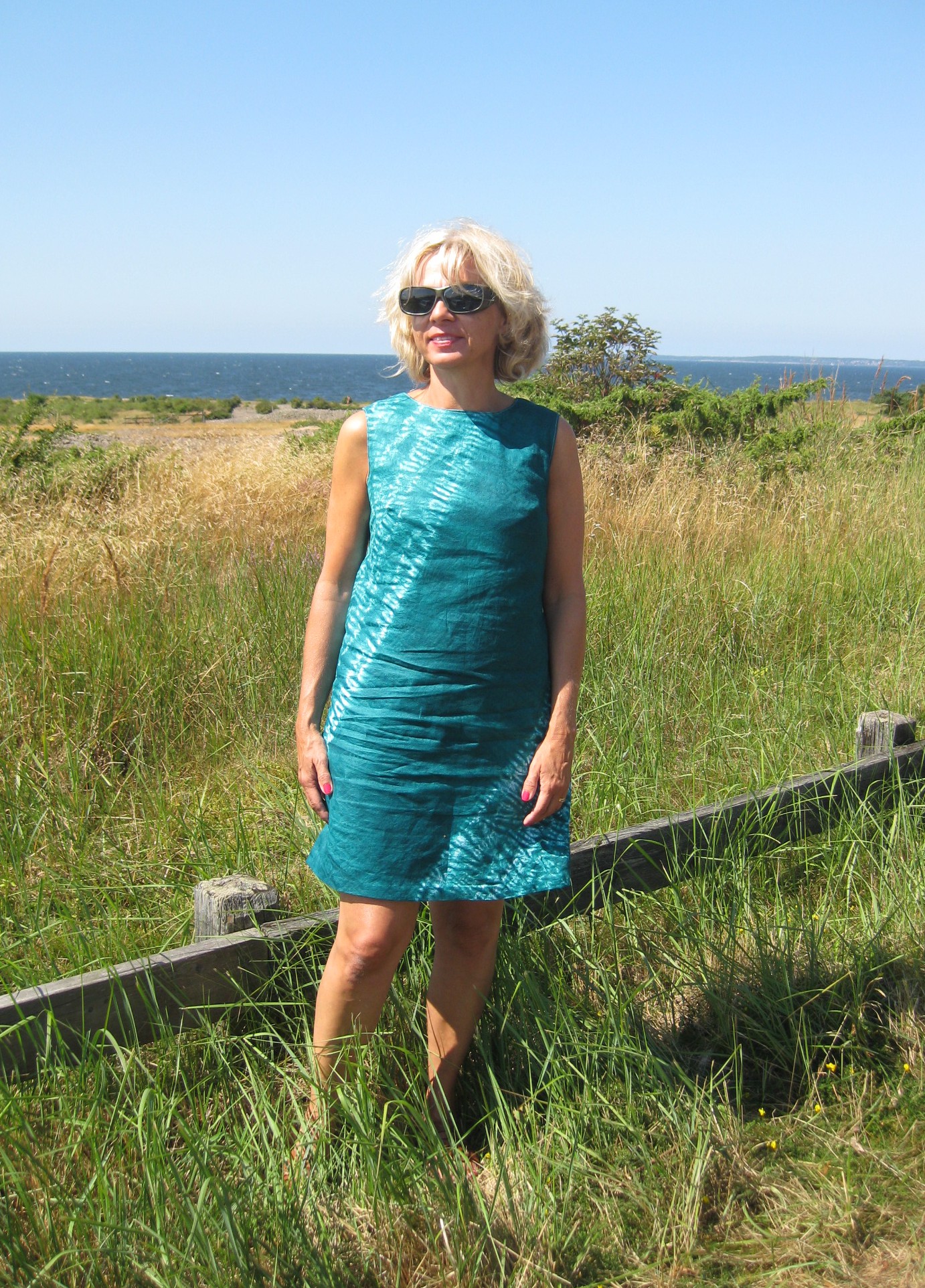 Grönt är inte heller så vanligt i min garderob. Nu har den alla fall utökats med en grön, otroligt skön, linneklänning som jag sydde färdigt imorse och invigde när vi åkte för att bada idag.