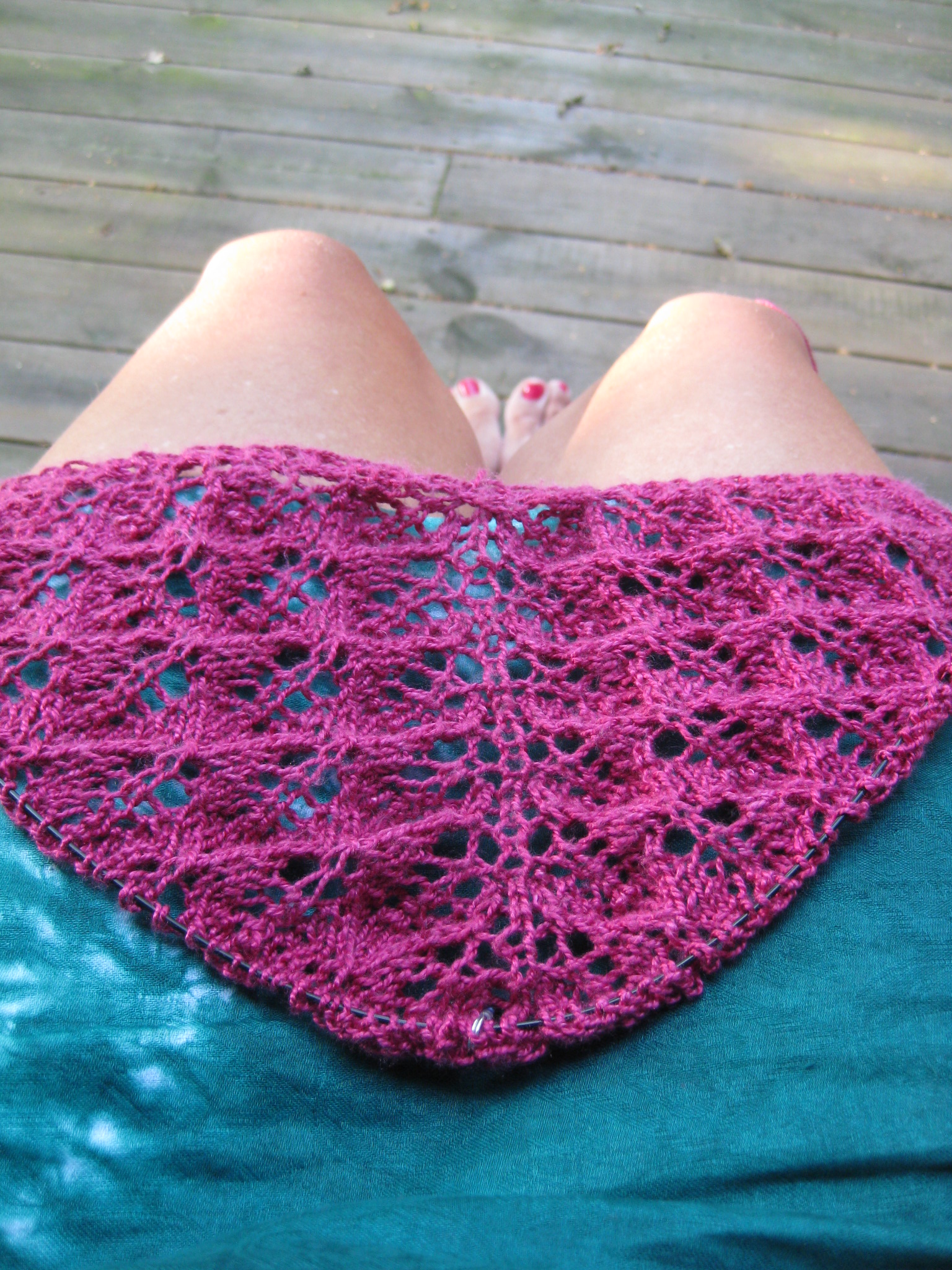 Det är början på en Haruni-sjal i silkegarn. Mönstret är väldigt lätt att följa och själva stickningen lagom varierad för min smak. Efter några varv har man fått kläm på det, stickar på ett tag och sedan händer det något nytt. Jag vet egentligen inte vad jag ska ha sjalen till, men jag tycker att både garnet och mönstret är vackert och det räcker väl som anledning för att göra en, eller?