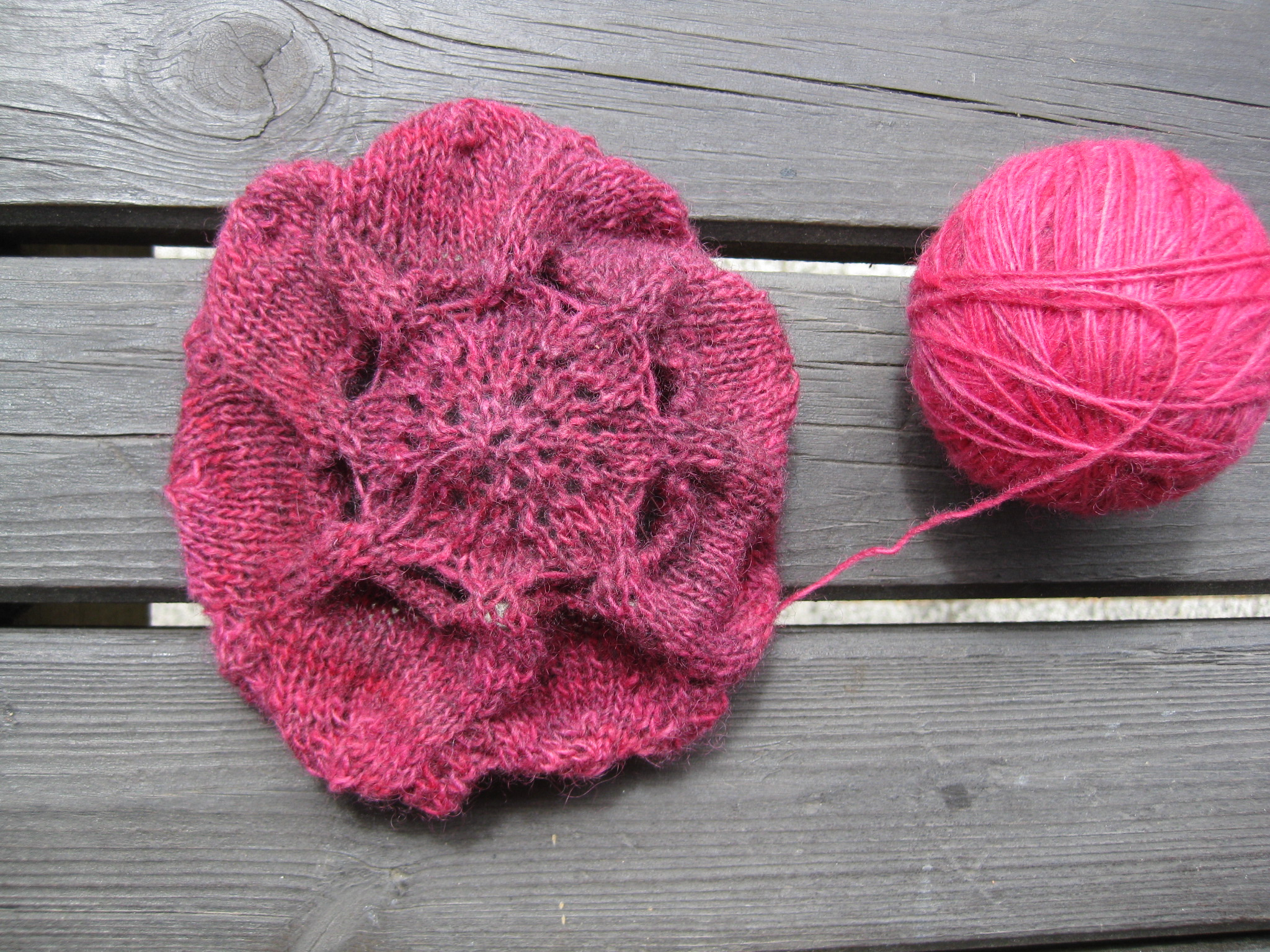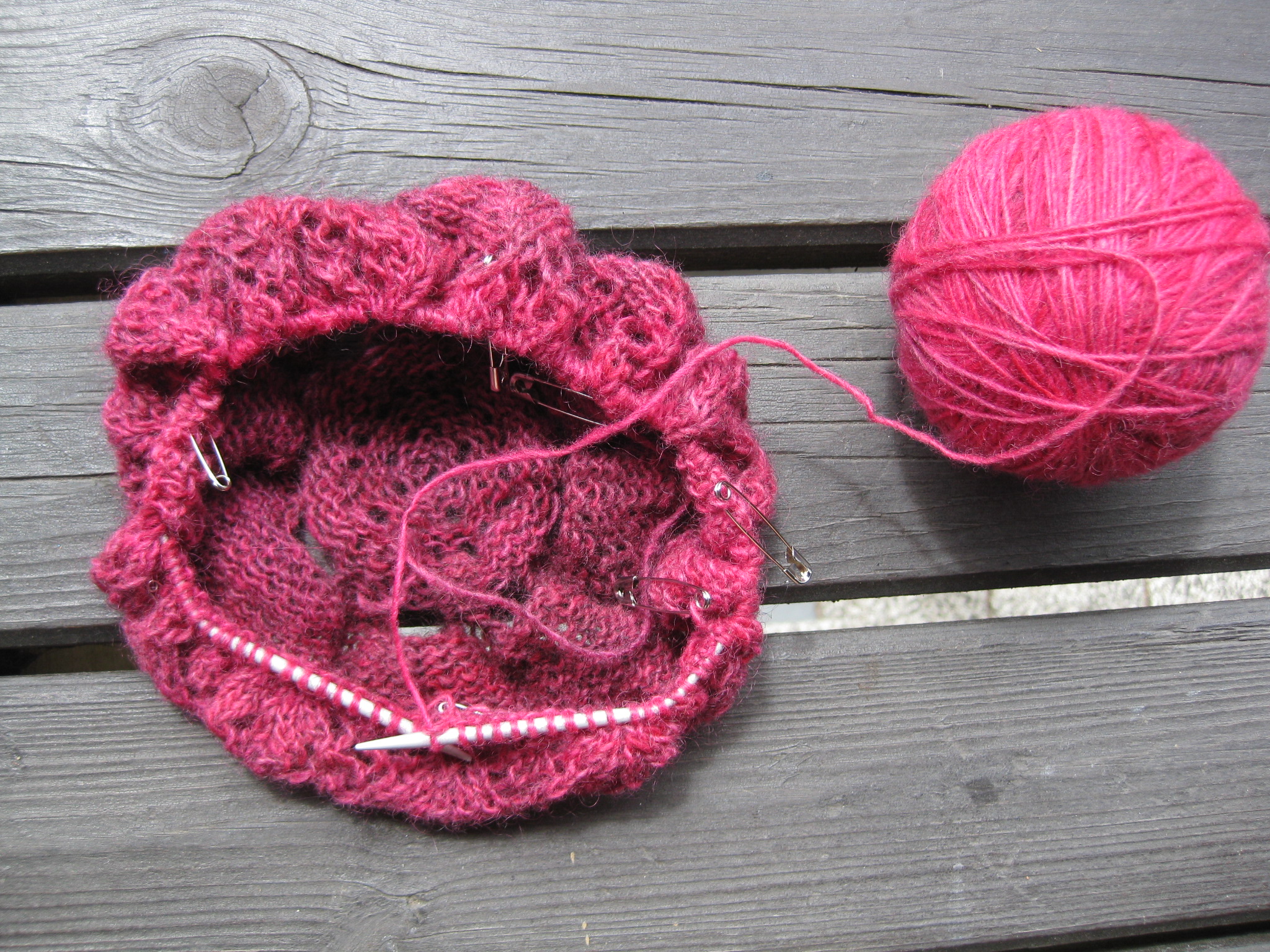 Det här var ju utslagsfrågan, och det ska – tro det eller ej – bli en kofta! Just nu tvivlar jag nästan själv, får helt enkelt lita på beskrivningen från Hedängens Ull och Garn. Jag såg modellen uppstickad i vit-grå-svarta toner i deras monter på Vävdagarna i Glimåkra häromåret och tyckte om den. Och så blev jag lite fascinerad av själva sticksättet. Det som syns på bilden är mitt bak på ryggen. Det ska bli som en stjärna som växer utåt och bildar hela ryggen. Sedan stickar man vidare på ett framstycke i taget. Men det är inte någon TV-stickning precis. Man måste vara fullt fokuserad hela tiden.