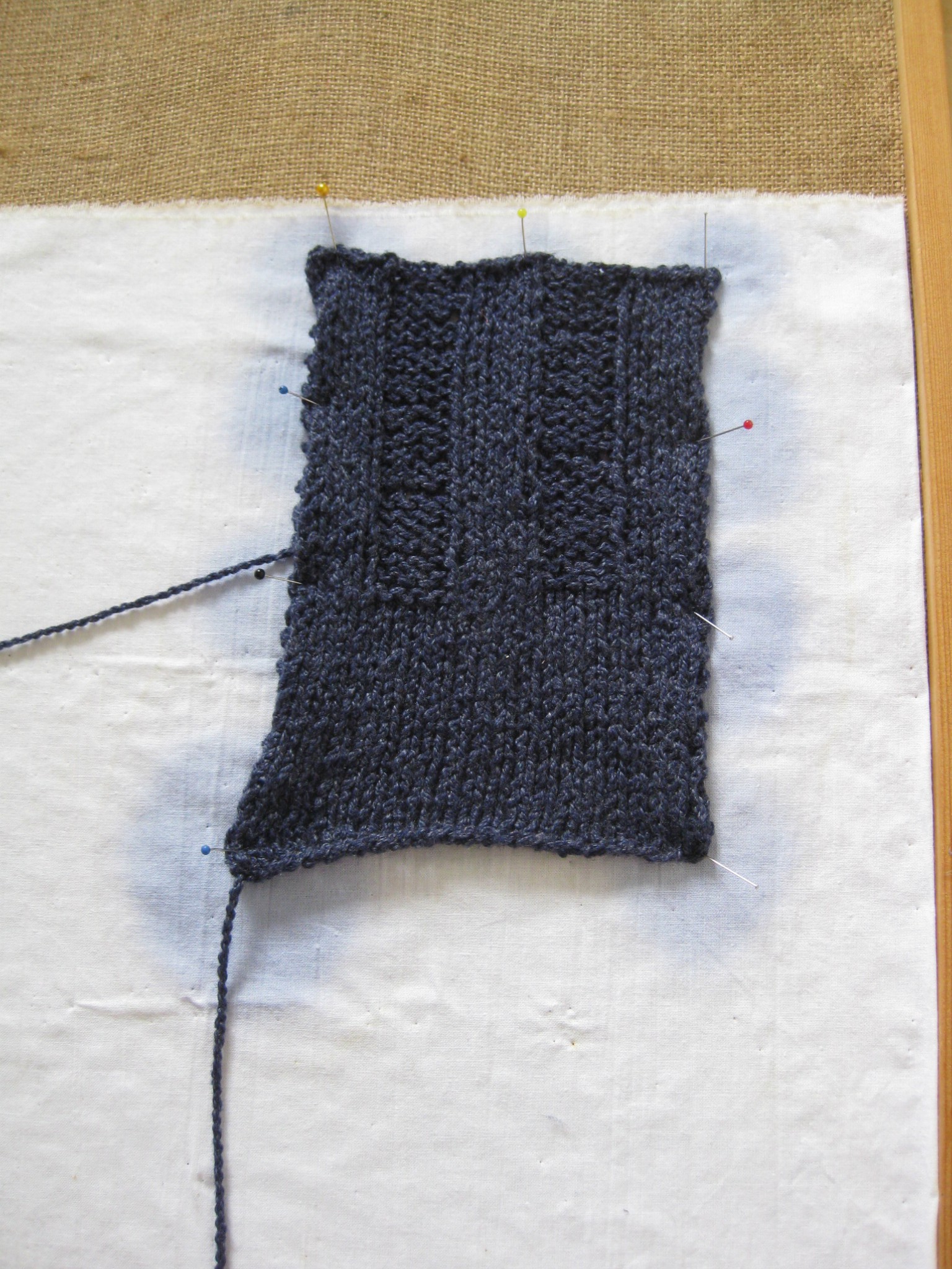 Häromdagen när jag letade runt bland mina garner hittade jag istället ett vackert denimblått blandgarn med lite knottrig textur som skulle bli fint tillsammans med knapparna. Jag stickade en provlapp (!) men blev inte så mycket klokare av det, för hur mäter man egentligen en resårstickade provlapp? Den töjde sig och drog ihop sig om vartannat, så måtten blev ganska olika vid olika mätningar. Jag spände upp provlappen för att se om det blev lättare att mäta efter blockning. Jo, det blev det, men då hade istället detta fenomen inträffat:
