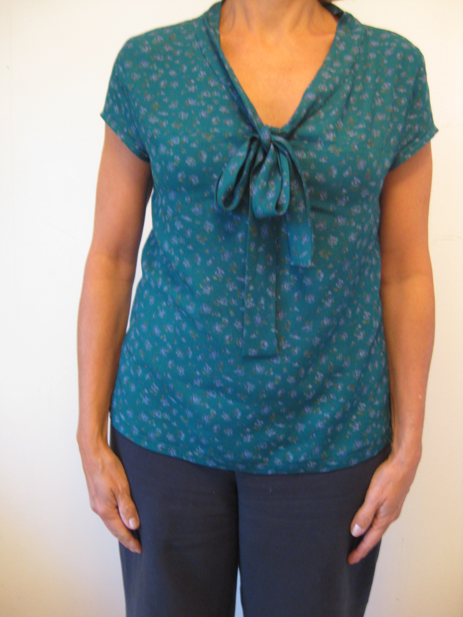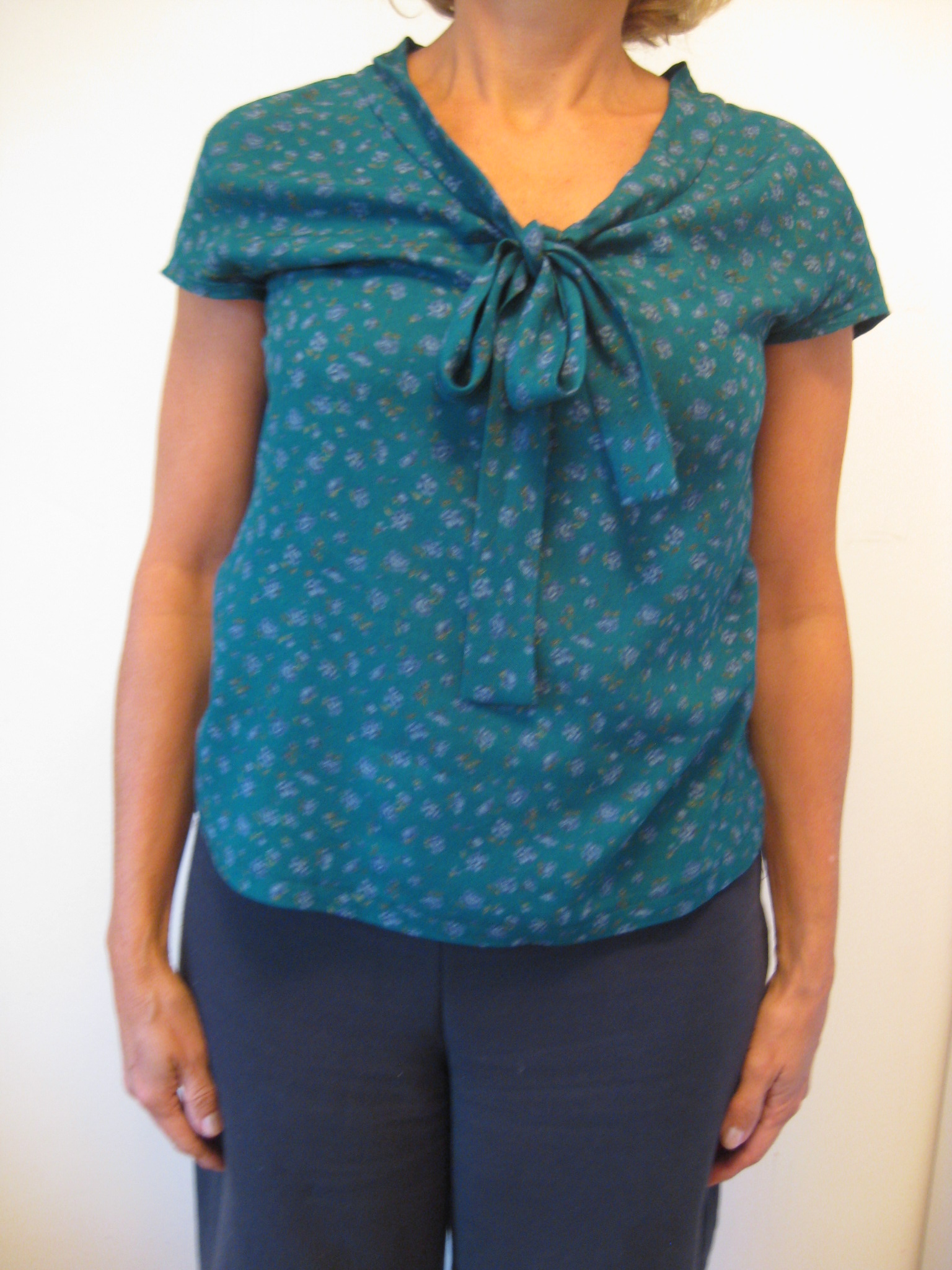 Lösningen med att sy fast knytrosetten på en separat okdel fungerade bra. Men jag hade nog inte tänkt färdigt innan jag valde mönster att utgå från. Jag utgick nämligen från ett mönster med ganska djupt ärmhål. Orginalmodellen hade inte en hel ärm utan någon slags halvärm som inte gick runt hela ärmhålet och ärmhålet var ovanligt djupt vilket jag inte tänkte på. För att få till en ärm med samma omkrets som ärmhålet prövade jag att rita av en ärm från ett grundmönster och göra den större, men den blev FÖR stor. Jag ritade av ärmen igen utan att göra den större och då passade den faktiskt in i ärmhålet. Men när jag använder blusen är det något som gör att blusen inte sitter riktigt bra. Den liksom fastnar uppe på bysten när jag rör mig, och det bildas veck. Kanske kunde jag gjort ärmarna LITE större ändå, och sytt i en hållningstråd … men egentligen är det nog bara att konstatera att jag skulle utgått från ett grundmönster helt och hållet, avsett för isydd ärm, och ritat av både ärm, fram- och bakstycke. Sedan kunde jag delat av framstycket i ok och nederdel. Vet inte varför jag gjorde som jag gjorde, riktigt bra blev det ju inte. Blusen går att använda, men förmodligen kommer jag att gå och dra i den för att vecken inte ska synas. Min dotter skulle fått mönstret om det blev bra, men hon tyckte inte heller om ärmisättningen. Hon hade velat ha ärmarna längre in på plagget.