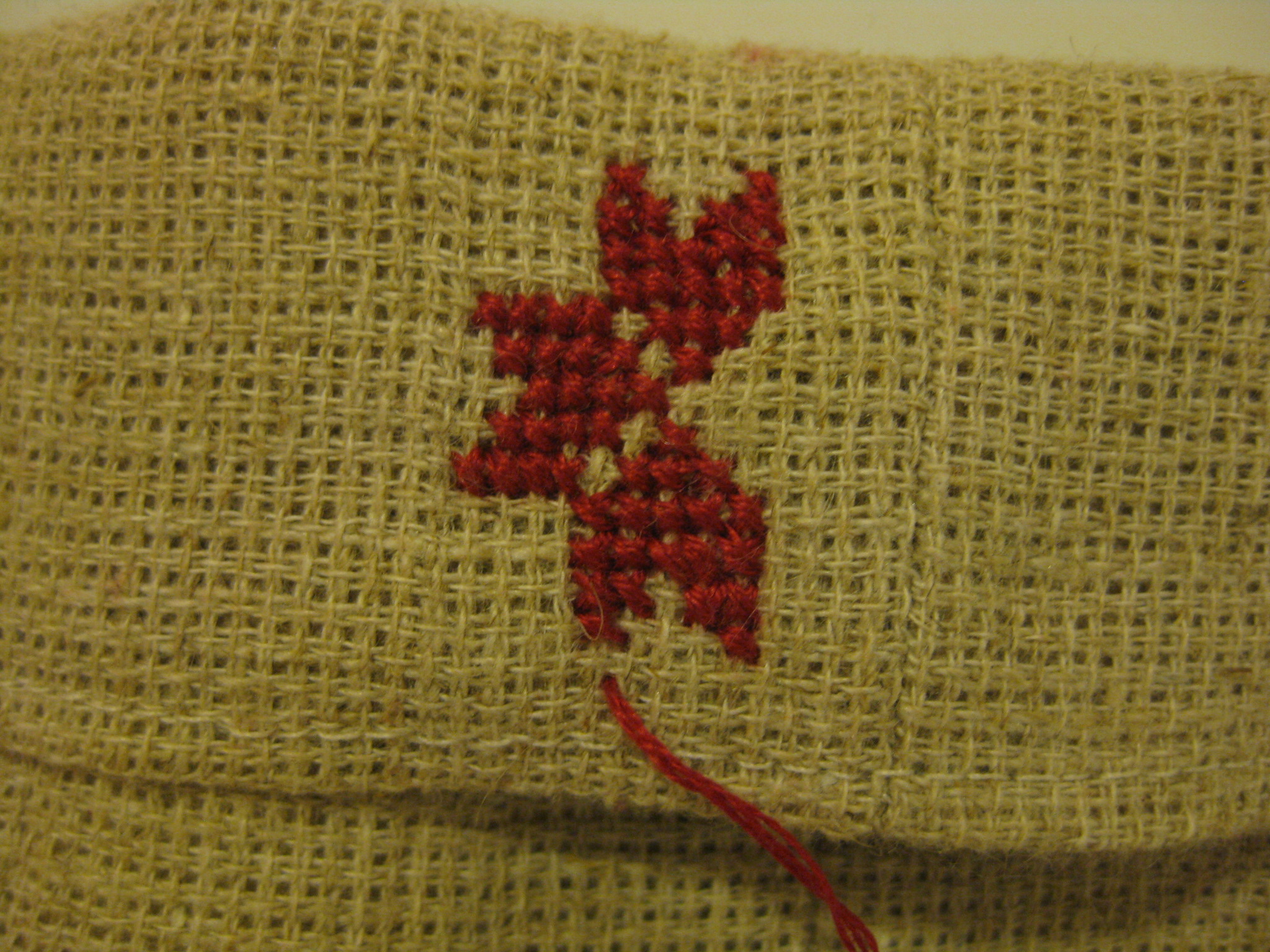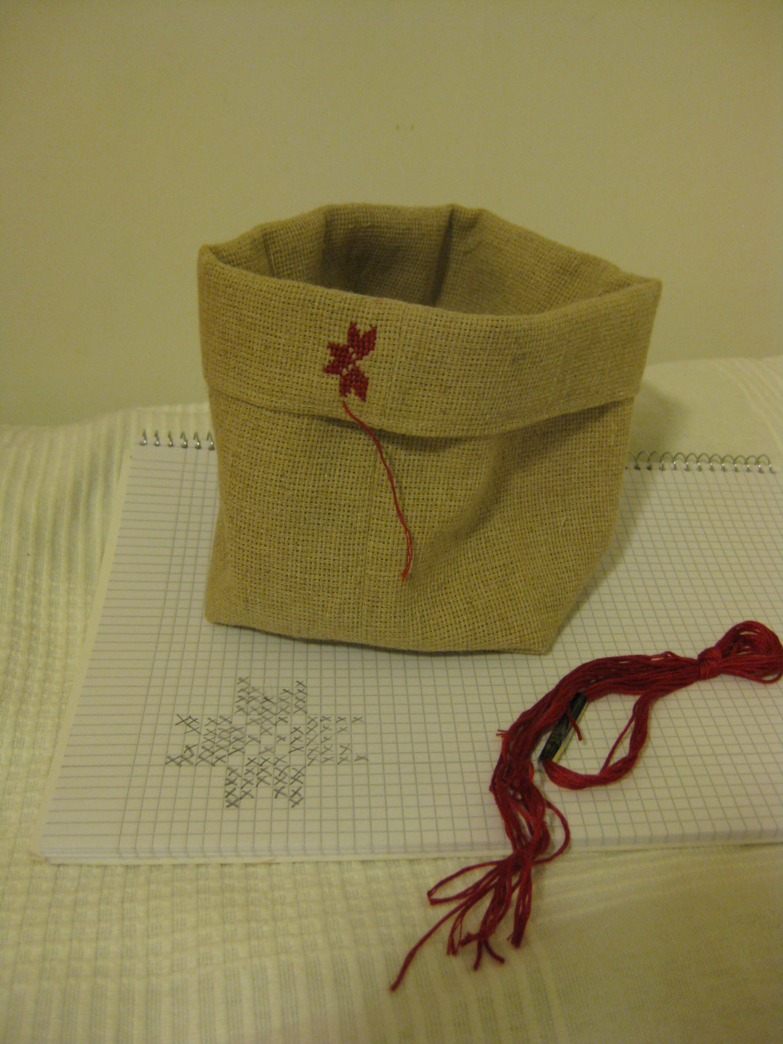 Så kom augustiutmaningen i Sew for a change och den handlade om återbruk. Jag tänkte: ”Yes. Nu ska mina gamla säckvävsgardiner få en andra chans – och jag ska kamma in lite poäng i Sew for a change . Jag bestämde mig för att sy ytterkrukor av gardintyget och sydde efter den här beskrivningen. Jag ville göra dem lite extra fina, och beslöt att utnyttja den aidaliknande strukturen till korsstygnsbroderi. Nu har jag testat att idén håller. Krukorna kommer att bli fina med en bård av stjärnor runt hela ovankanten. Men eftersom de är väldigt julaktiga känner jag mig inte motiverad att göra ens den första färdig just nu. Så här långt har jag kommit: