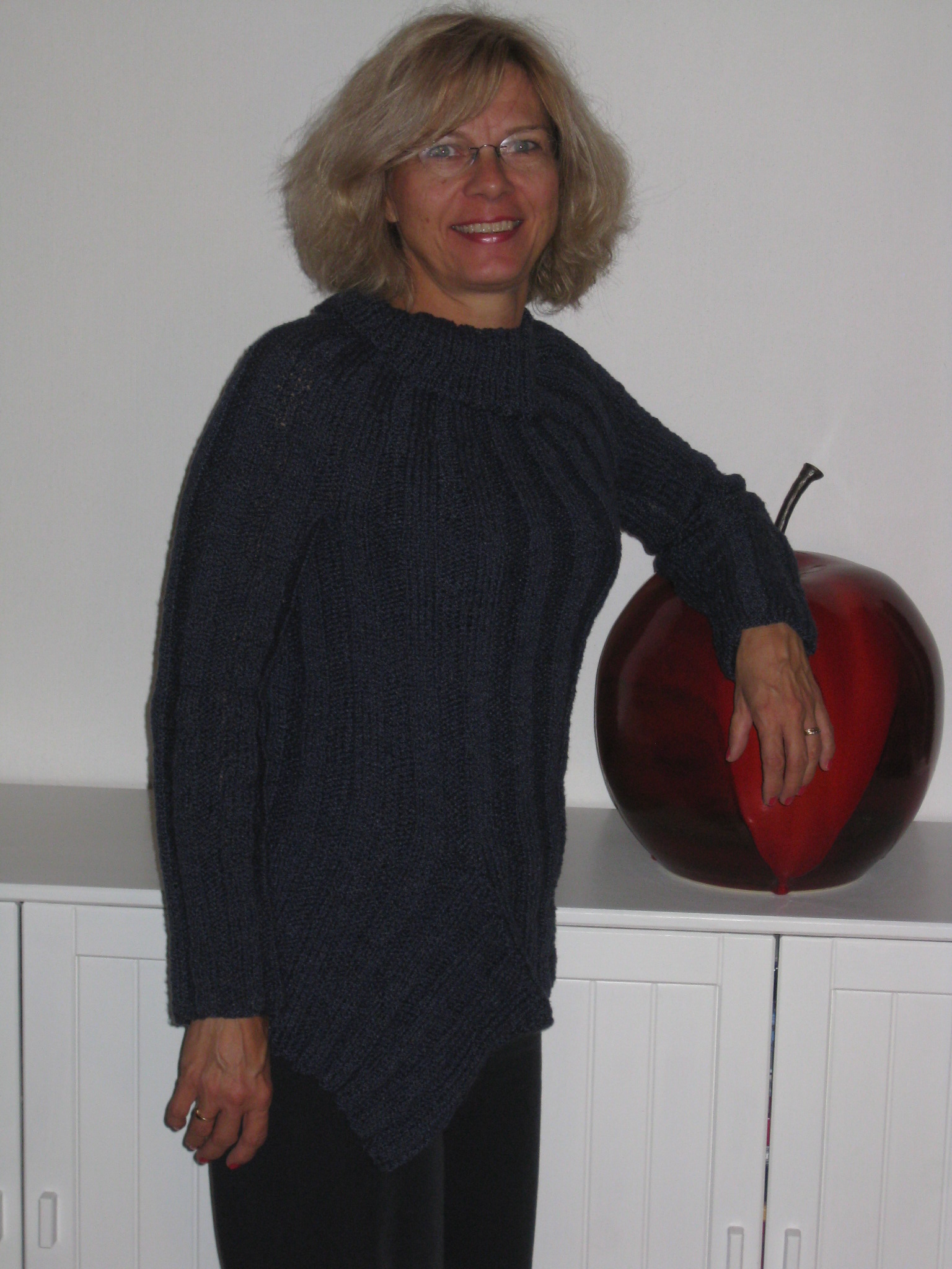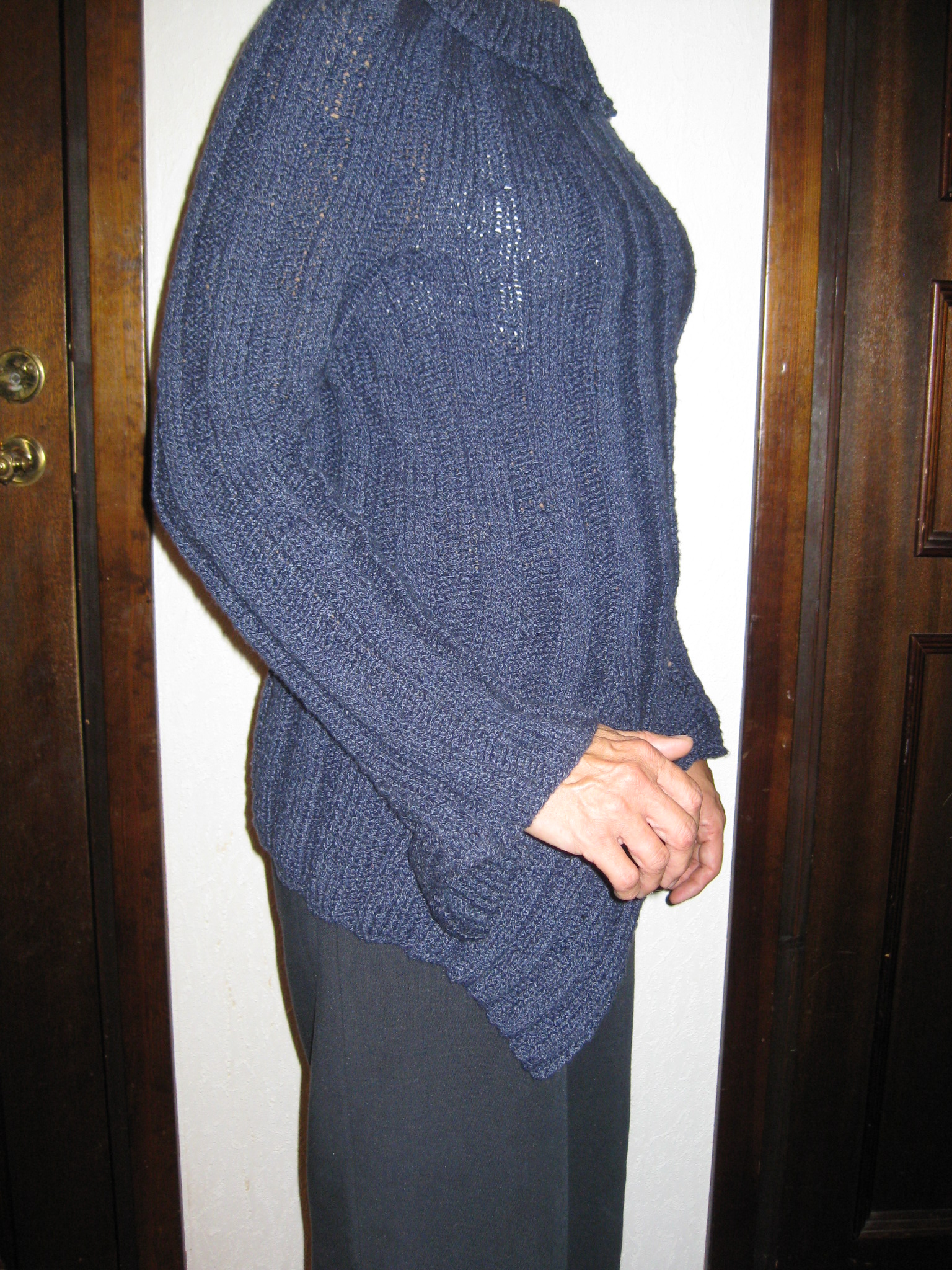 Nu är den klar, tröjan som kom till på grund av några knappar jag köpte för några år sedan.IMG_1945 Det speciella med den här tröjmodellen var de infällda ”kilarna” i nederkanten fram och på ärmarna. Jag hade tänkt mig att ”kilarna” på ärmarna skulle komma på ovansidan av händerna. Som jag läste beskrivningen skulle det till och med bli så wild and crazy att ena ärmen hade kilen på ovansidan av handen, andra ärmen skulle ha den på undersidan. Nu blev det så att BÅDA kom på undersidan. IMG_1941Det blev inte lika effektfullt. Det skulle kunna fixas till genom att repa upp tröjan uppifrån och ner till ärmarna, ta loss dem, vända dem ett halvt varv (eller bara ena ärmen om jag ville ha ett mer assymetriskt utseende). Men när jag hade tröjan på mig kändes det inte bra med kilarna överhuvudtaget. Garnet är ganska tungt så ärmarna kändes klumpiga med det där extra nertill. Så jag klippte bort kilarna och sydde ihop till vanliga ärmar.IMG_1954
