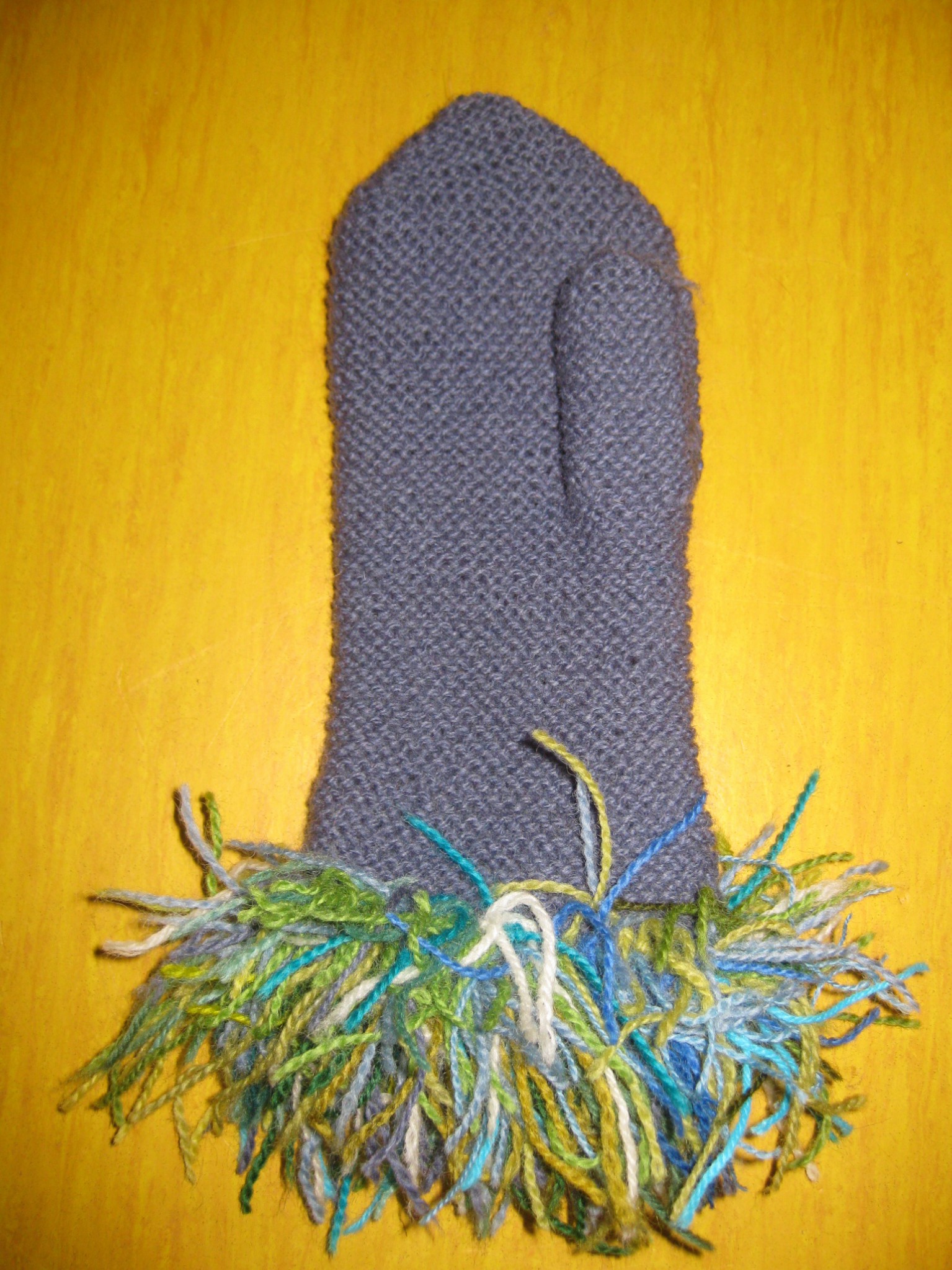 Så här såg vanten ut innan jag blött ner den med varmt vatten och lite såpa. Jag gnuggade den och ruggade den lite också, med en diskborste, både på ut- och insida. Den blev mjuk och go´ och väldigt smidig.