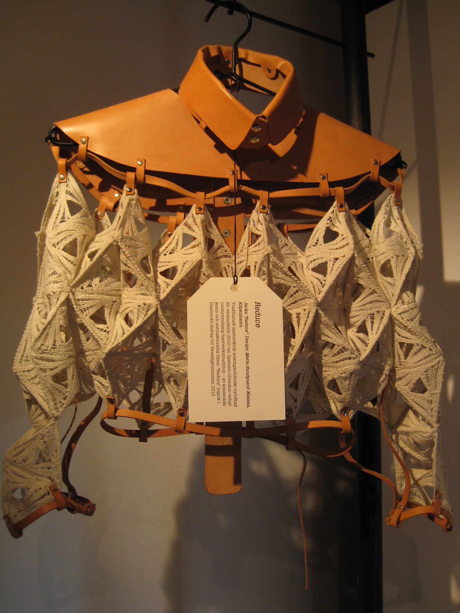 De här två plaggen är helt otroliga – knypplad spets och läder i kombination – designade av Mette Bundgaard-Nielsen. Jackan på undre bilden representerade Danmark på Venedigbiennalen förra året. Materalet i spetsen är bl.a. kasserade jeans. Fantastiska, men inget för mig. Jag skulle troligen fastna någonstans och dra sönder hela härligheten. Och vad skulle man säga om ”fröken” kom till skolan i läderkorsett?