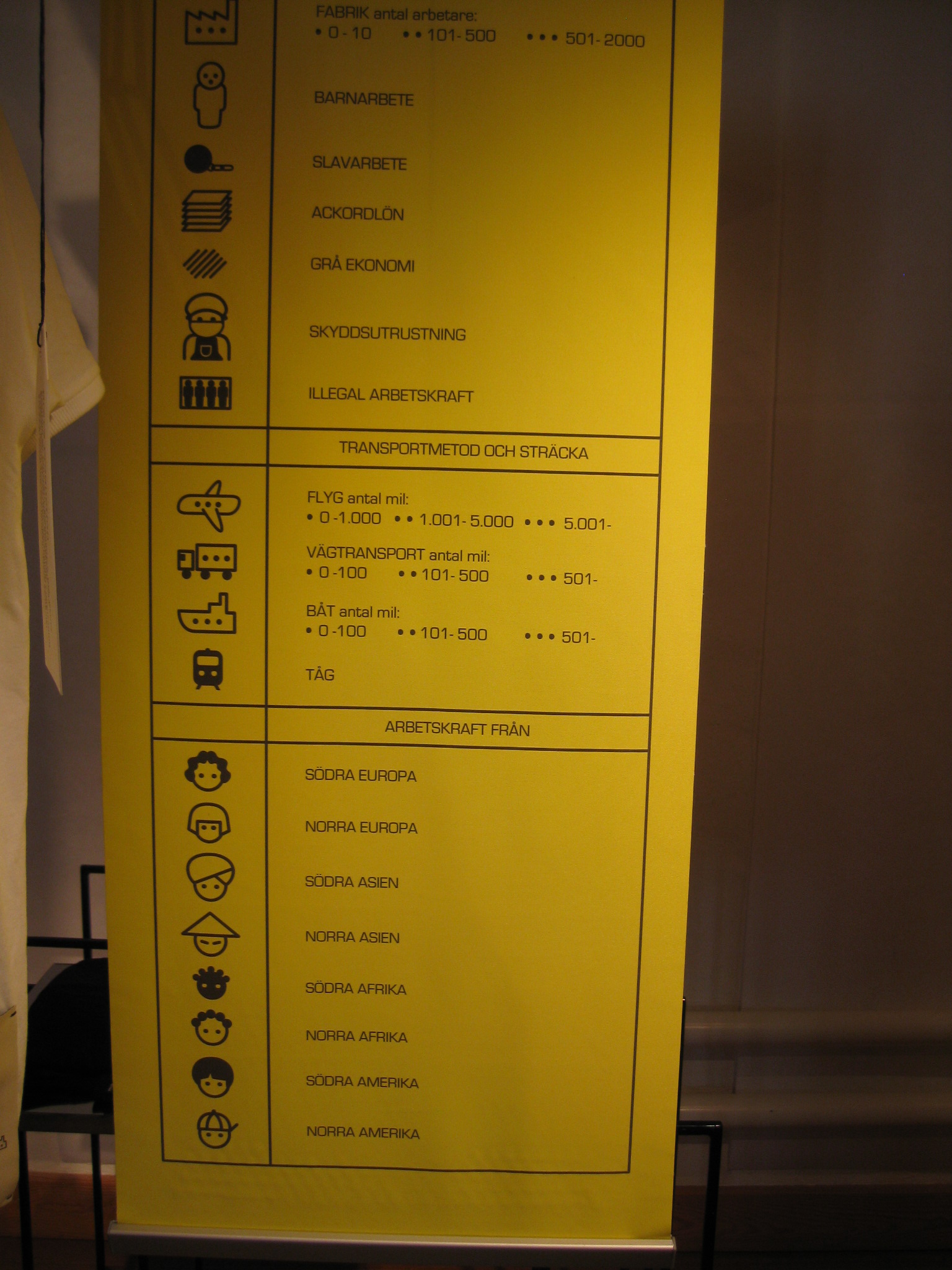 Det här är ett förslag till alternativ märkning av plagg som fanns med i utställningen Shop Show. Vem vill köpa ett plagg som är märkt med ”tillverkad av barnarbetare”?