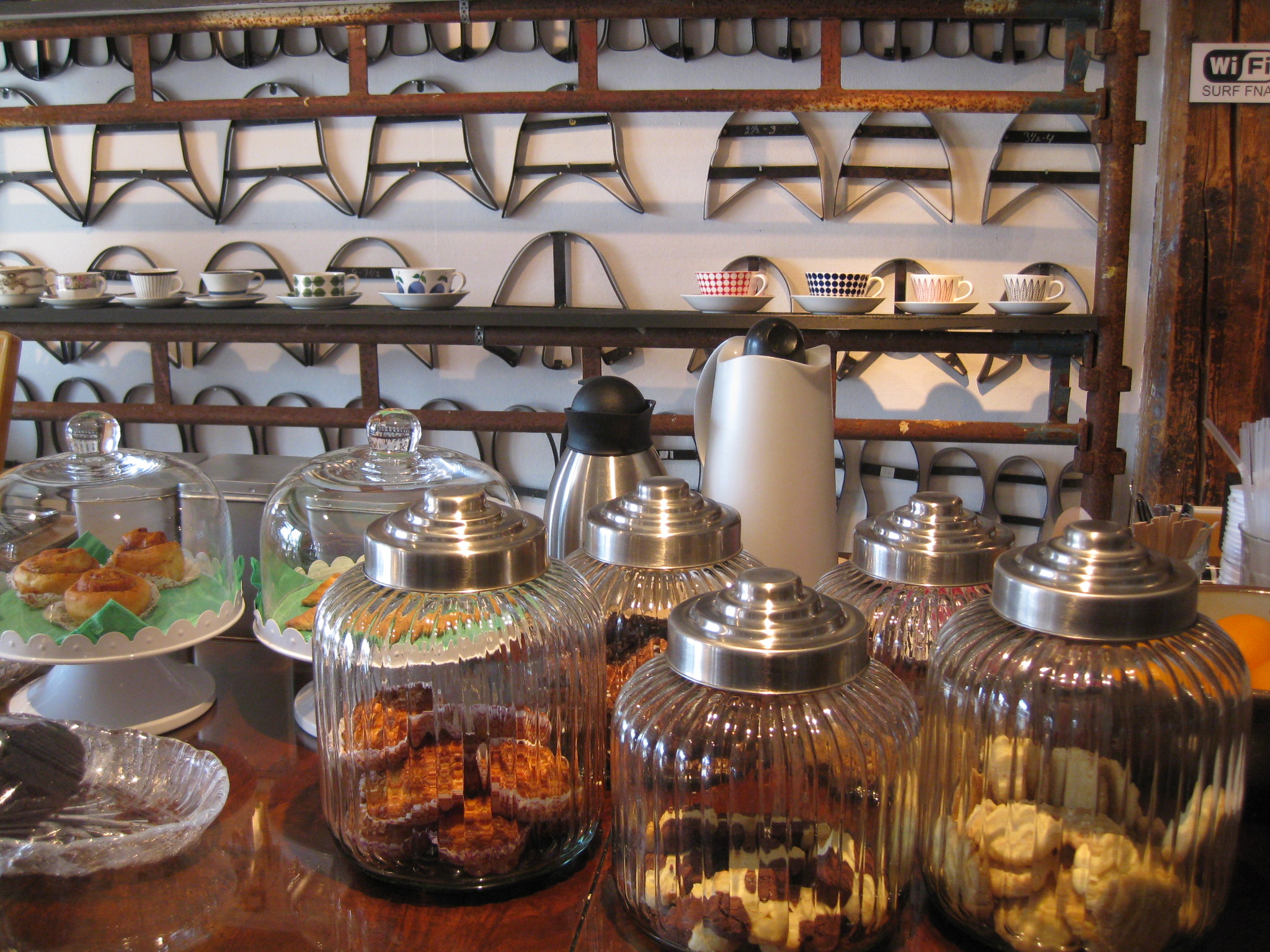 Man får välja kopp från hyllan bakom disken. Jag valde den här med fin, blå blomma från Gustavsberg. Någon som vet vad den heter?