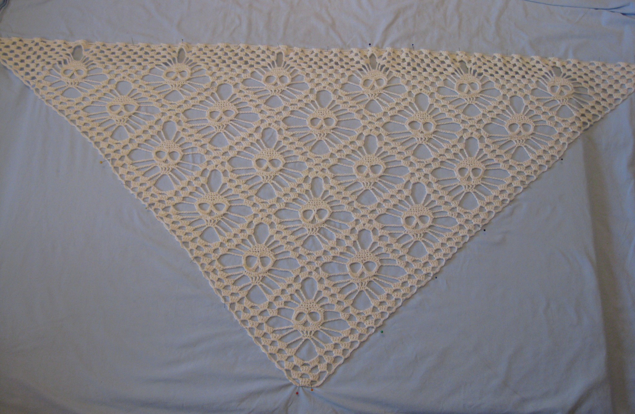 När jag skulle blocka sjalen hade jag inget som var tillräckligt stort för att spänna upp sjalen på. Anslagstavlan i någon slags spånskiva som jag brukar använda var både för kort och för smal.Jag hittade lösningen på en annan blogg: jag la helt enkelt anslagstavlan på ett liggunderlag, lite omlott, och så ett lakan på det. Vips – en mycket större blockningsyta. På samma blogg läse jag tipset om att spänna upp sjalen med hjälp av en tvättlina. Väldigt smidigt – lätt att sträcka om på ställen där det behövs utan att behöva flytta en massa knappnålar. Jämnt och fint blir det också!