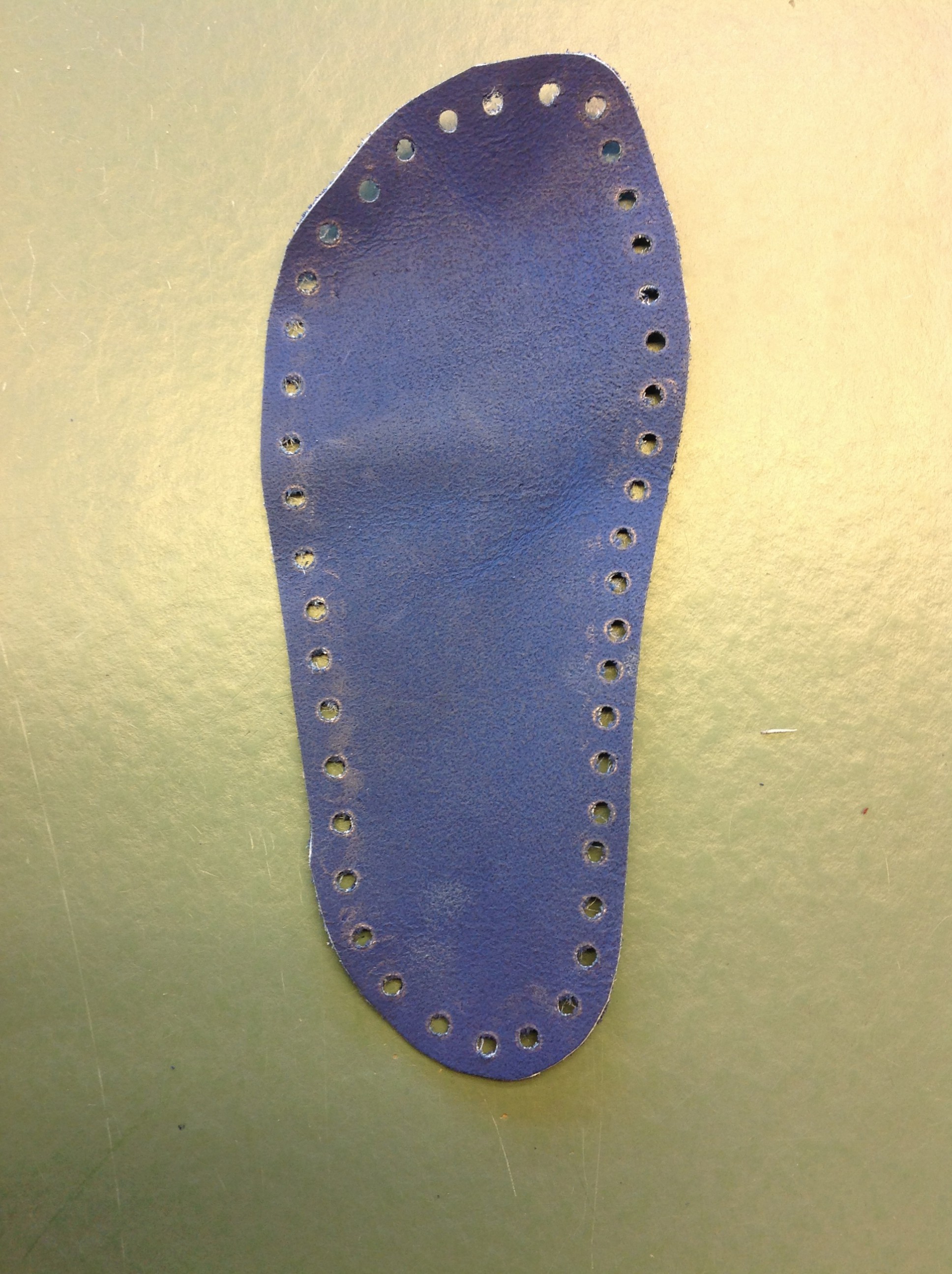 Jag ritade av min fot på en bit läder och klippte hål med en håltång, 1/2 cm in från kanten. Det är ungefär 1 cm mellan hålen.