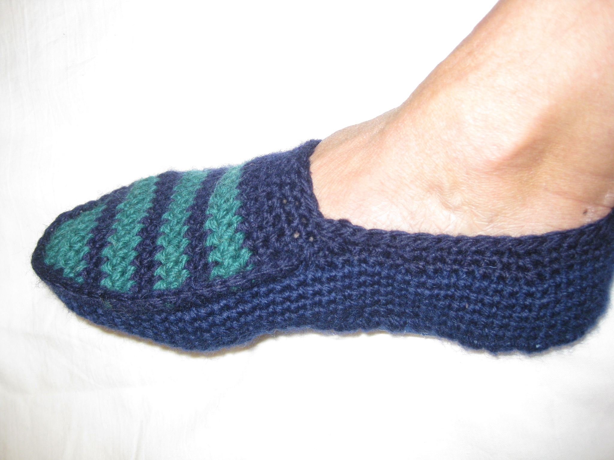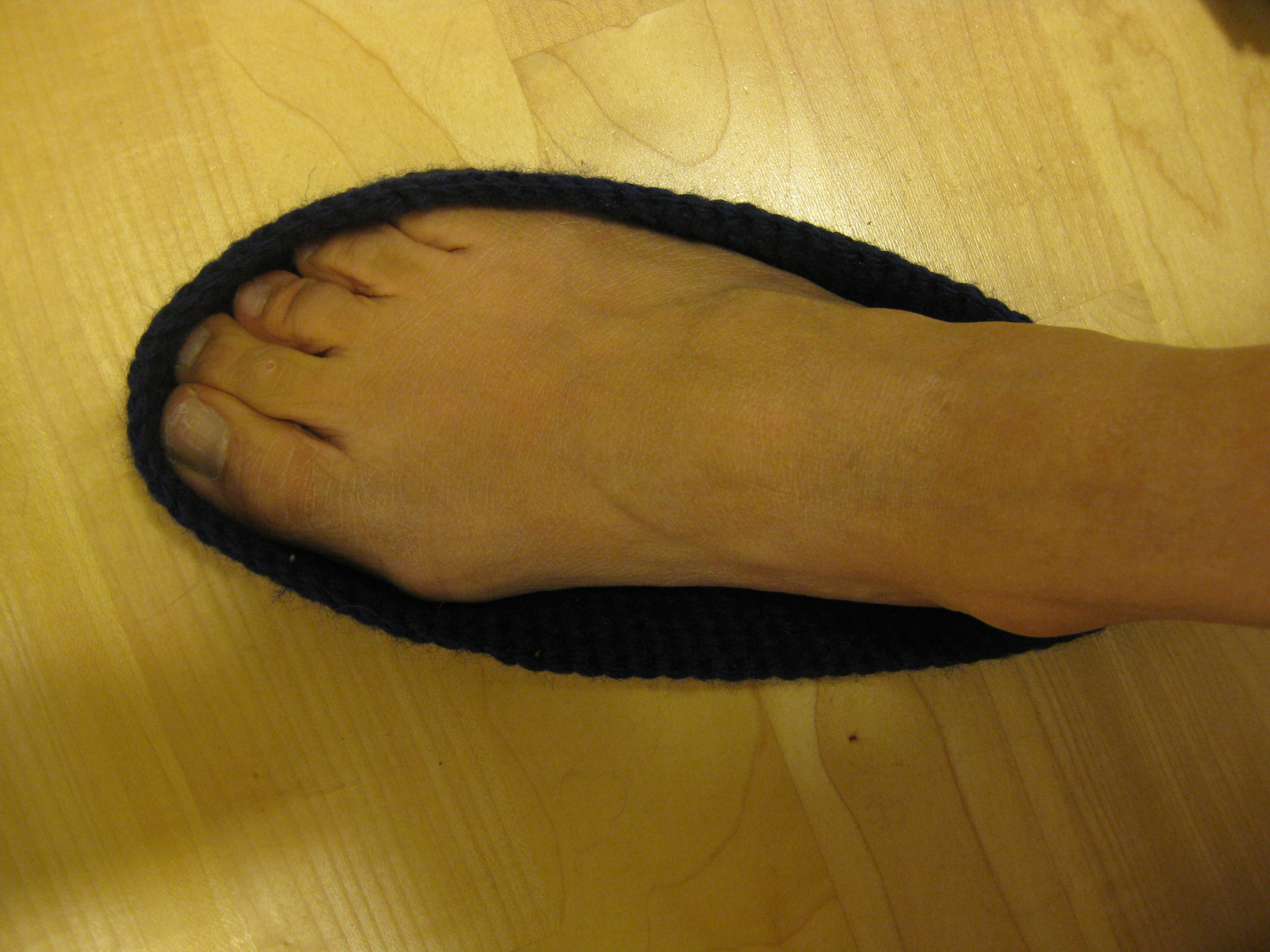 Om du vill testa så får du här lite hållpunkter: jag har använt mig av ett ullgarn lämpligt att sticka med stickor 5, men jag har virkat med virknål nr 4. Jag har skostorlek 36 och det blev 84 hål runt min fotsula.