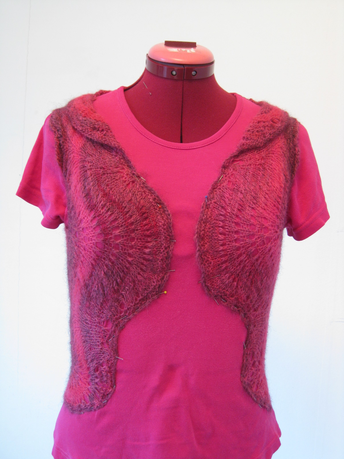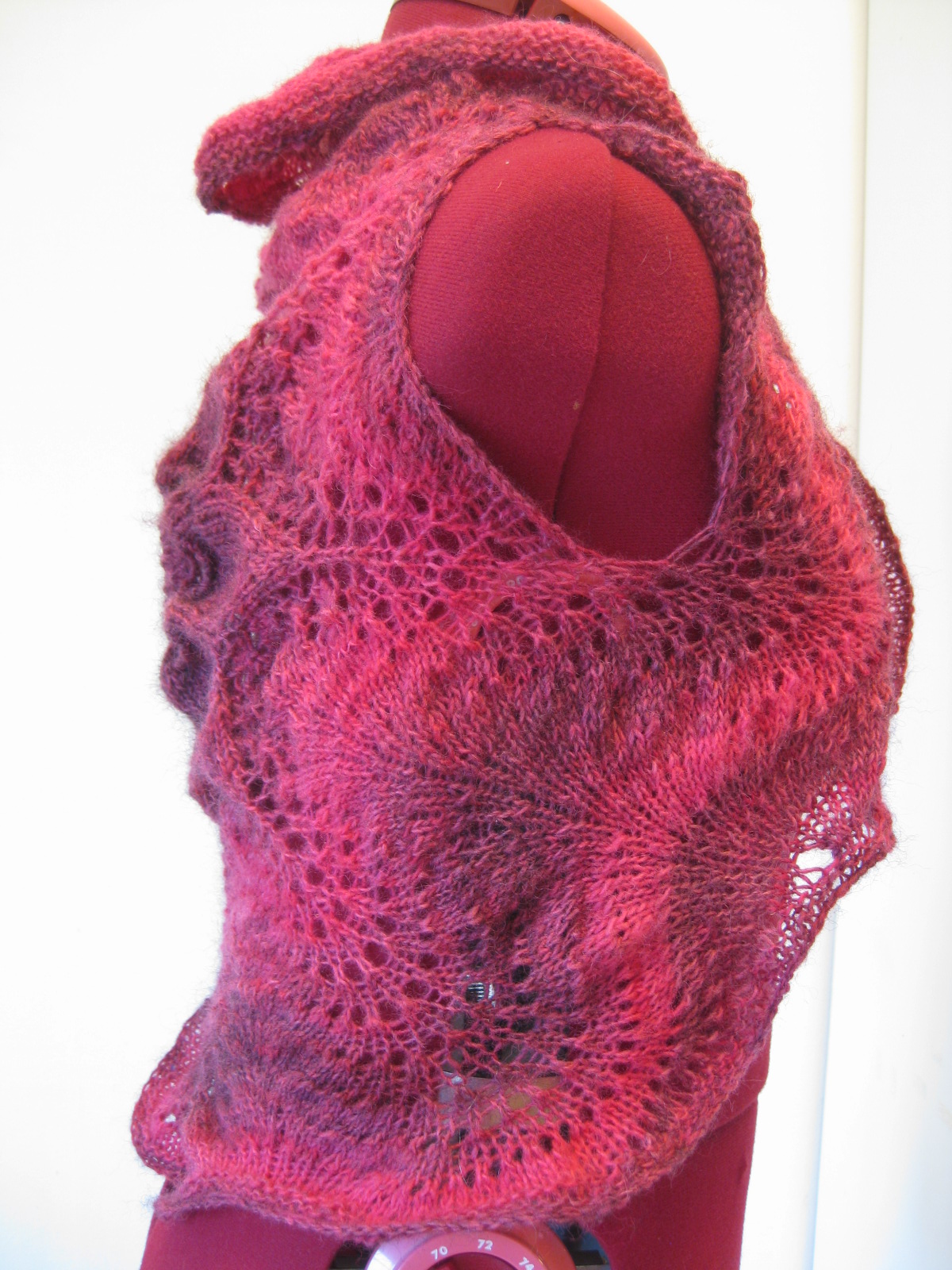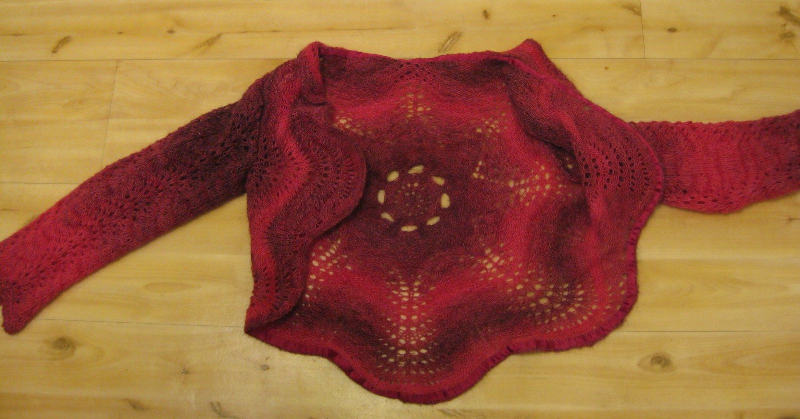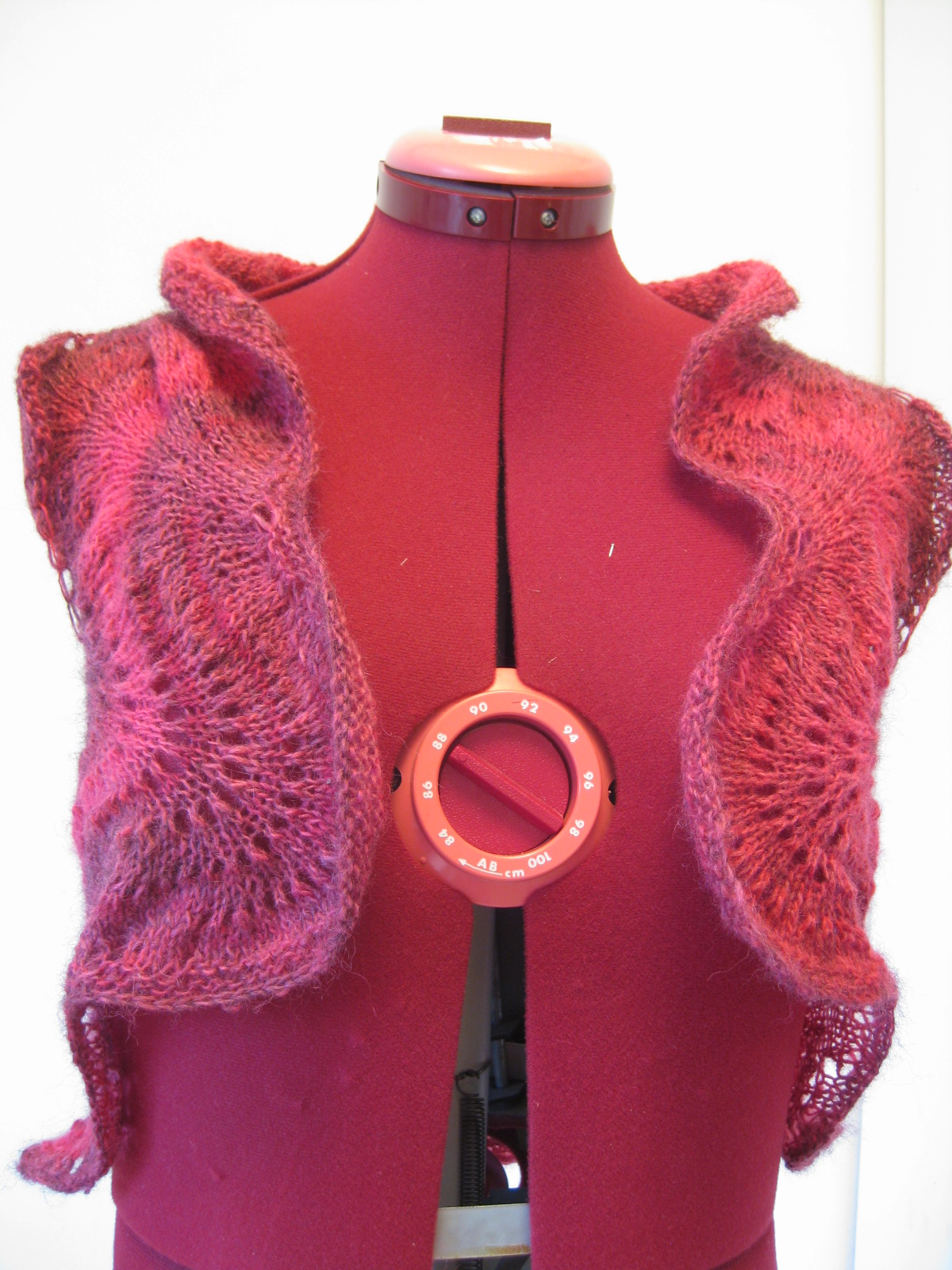 Det blev ingen kofta. Det blev en bolero. Som sådan är den helt OK. Men vilken resa det varit! Stundtals har jag tvivlat på att det överhuvudtaget skulle bli något, se här och här. Upprepade upprepningar och mot slutet övervägde jag ju till och med att repa upp hela koftan. I måndags bestämde jag mig för att göra den färdig i den ursprungliga modellen, tog ett djupt andetag och doppade själva koft-delen i ljummet vatten, kramade ur den och spände upp den på min provdocka. Det stod i beskrivningen att stickningen skulle vara mycket elastisk så jag tänjde och drog rejält, nära nog till bristningsgränsen skulle jag vilja säga. Så här såg den ut innan blockning: