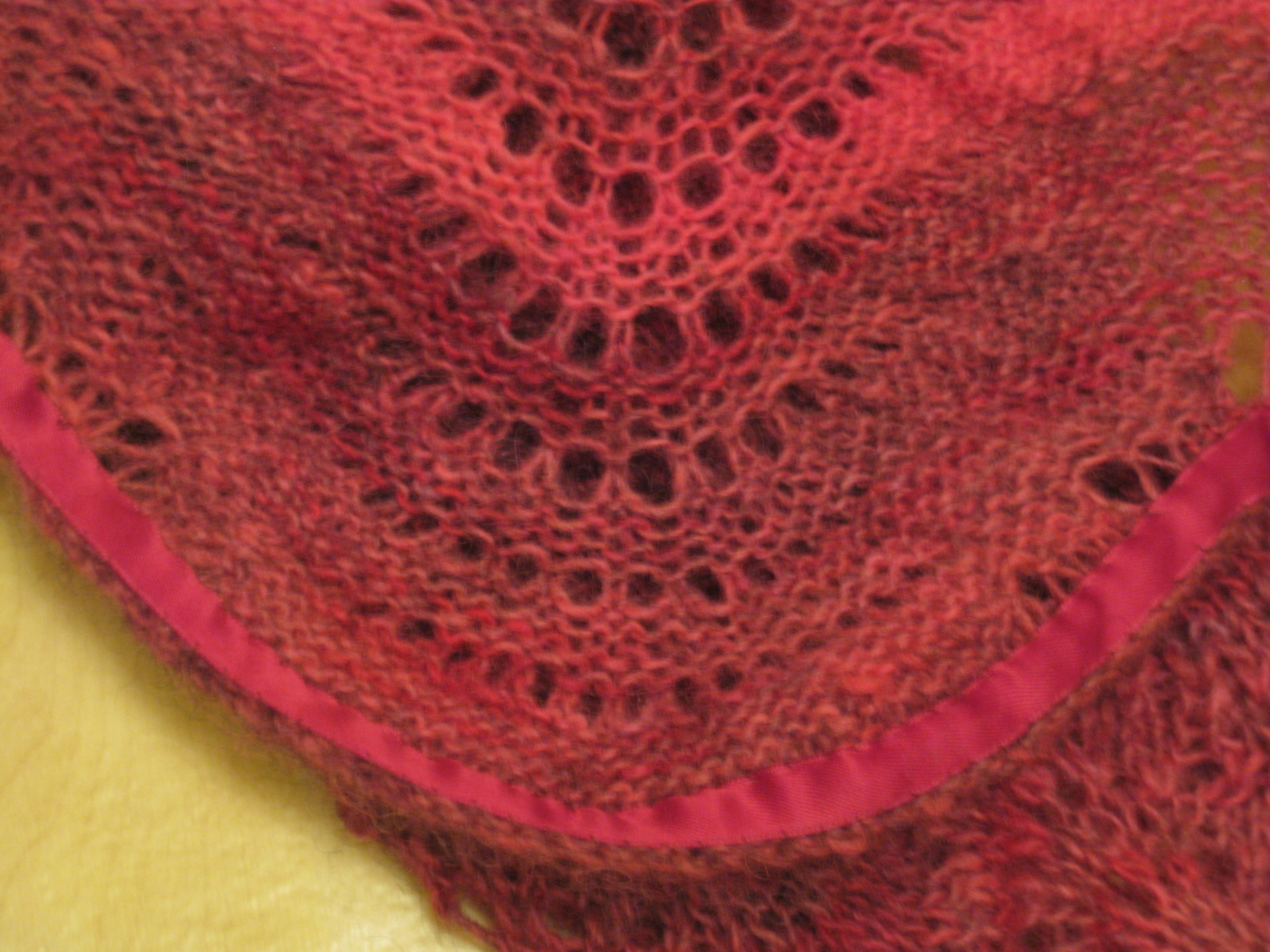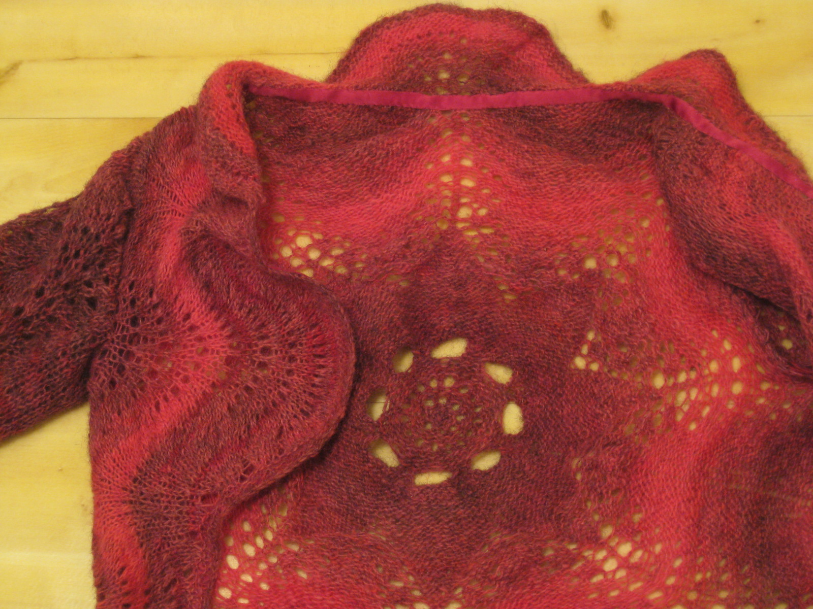 När jag tog på mig koftan satt den inte lika snyggt som på provdockan. Den ville inte ens stanna kvar på mig! Så jag sydde fast satinband på insidan, höll in vidden lite vid nacke och axlar samt vid de rundade partierna vid bysten.