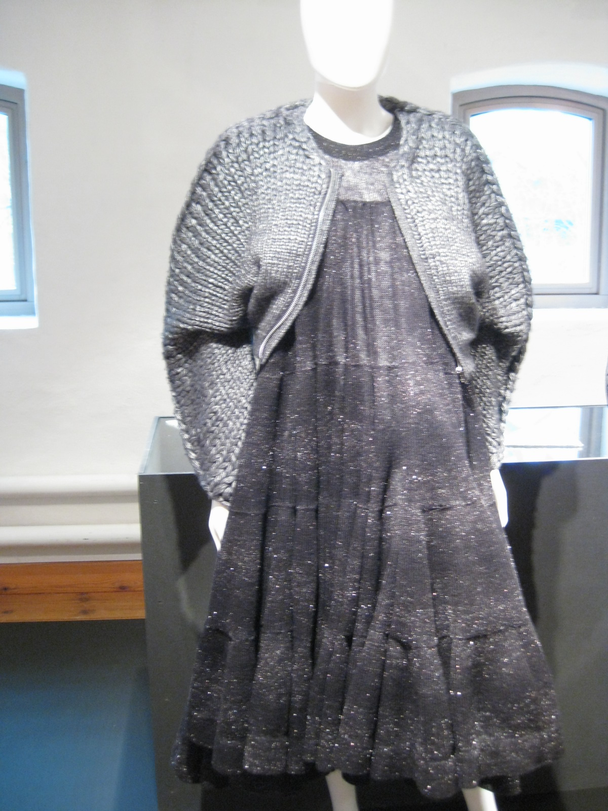 För en vecka sedan gjorde jag och kollegan Agneta en utflykt till Falkenberg. Vi tittade på två utställningar på temat stickat på Falkenbergs museum. Utställningen Knitwear Chanel till Westwood var klart sevärd med många fina stickade designerplagg från början på förra decenniet fram till idag. Men där fanns också exempel på hur vanliga husmödrar i slutet av 40-talet trots stor brist på material lyckats sticka väldesignade plagg. Det måste ha krävts mycket funderande för att få alla restgarner att räcka till regelbundet återkommande ränder och rutor i en hel kofta. Vi blev stående framför de stickade yllebaddräkterna en stund och funderade på hur de skulle se ut om man verkligen badade med dem på.