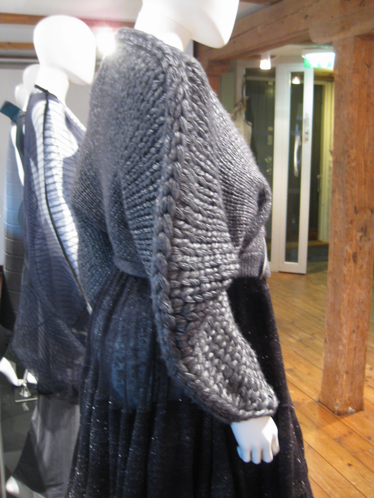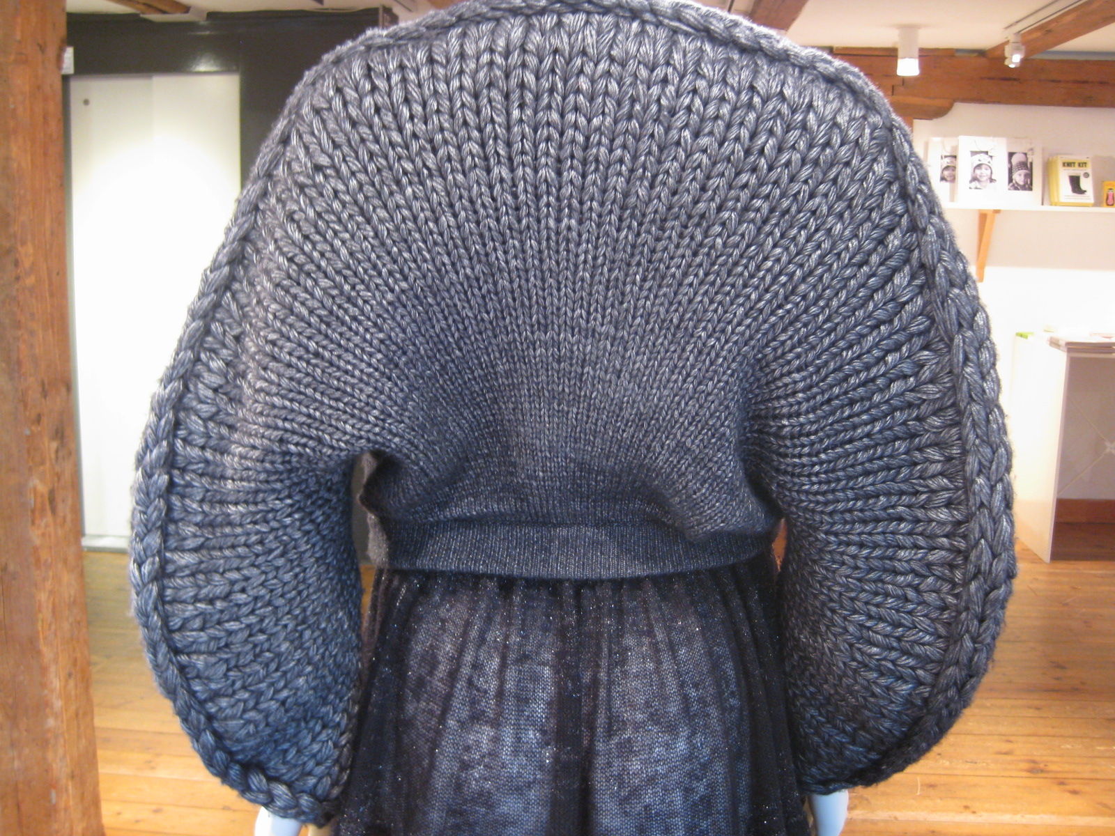 Matilda Norberg har studerat både på Handarbetets Vänner och Konstfack och arbetar både hantverksmässigt och industriellt. I den här koftan har hon jobbat med en teknik där man stickat med fler och fler trådar av garnet så att maskorna blivit grövre och grövre. Det syns allra bäst bakifrån: