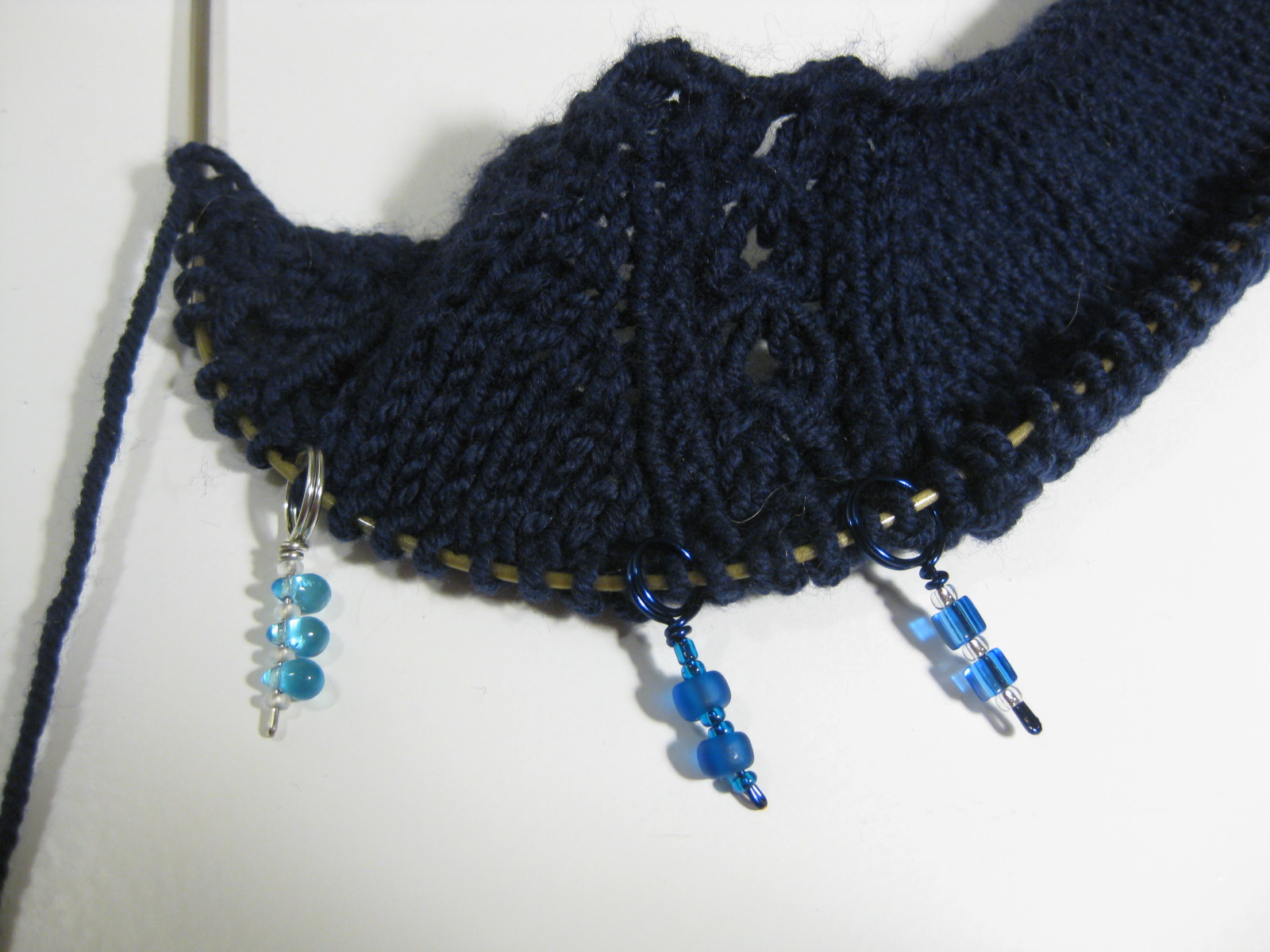 Det är inte så lätt att fotografera marinblått visade det sig, men här ser man i alla fall hur markörer sitter på var sida om en fläta – som en liten påminnelse om att här ska det stickas något annat än slätstickning. Key Note stickas uppifrån och ner. Flätorna markerar tänkta raglansömmar. Dessutom är det ett flätparti mitt fram.