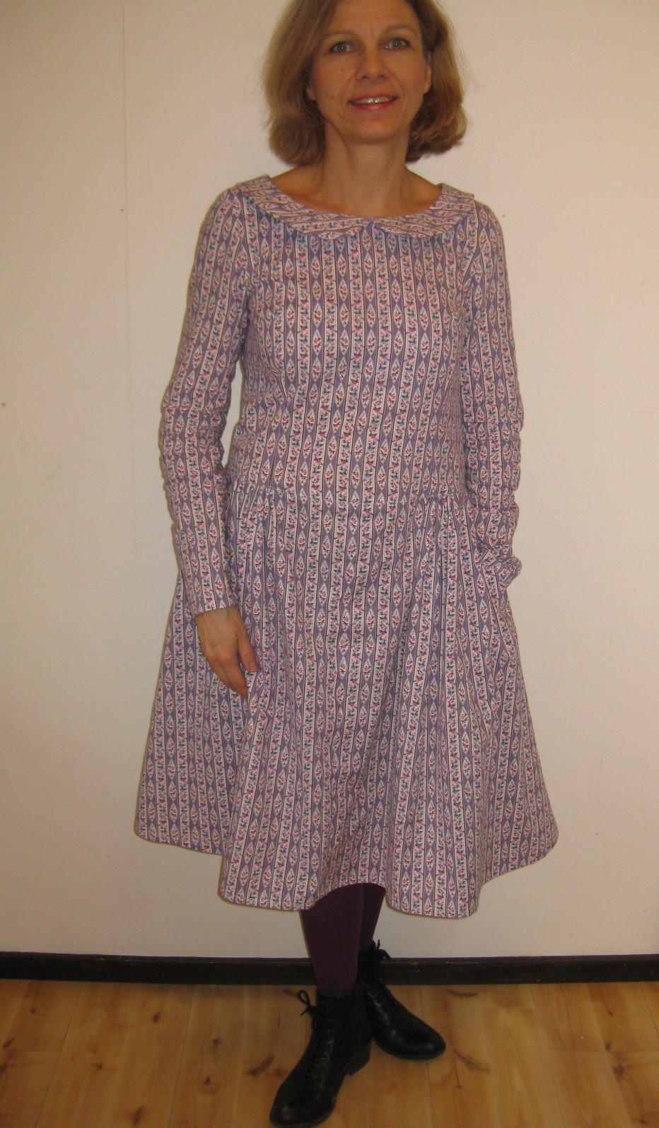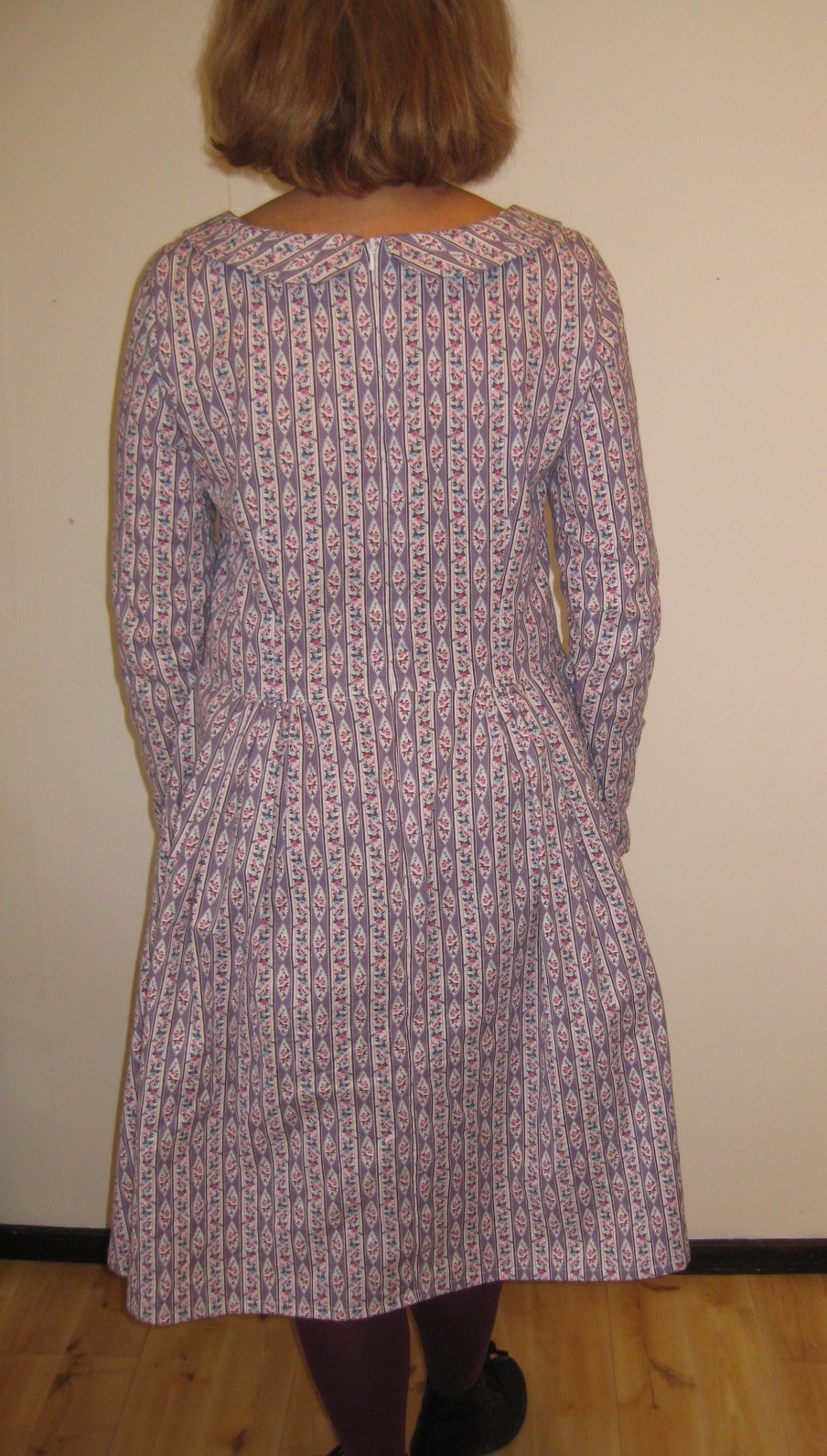 En annan sak jag klurade på var det här med mösterpassning. Eftersom tyget ligger på knappa 120 efter tvätt blev jag tvungen att skarva kjolen mitt fram. Hade jag tänkt ett varv till hade jag lagt skarven i en ljus rand istället för i den lila med vita medaljongmönster. Nu fick jag nåla jättenoga för att det inte skulle synas. Jag var noga med att mönstren skulle stämma vid axelsömmarna vilket ledde till två mörklila ränder intill varandra mitt bak på livdelen. Då fick jag fortsätta på samma sätt med kjoldelen och då kunde det inte stämma i sidsömmarna. Jag bestämde mig för att det syns mer om ränderna mitt bak inte är lika hela vägen än om färgerna i sidsömmarna inte möter varandra. Så här i efterhand tänker jag att axelsömmarna ju inte var så noga eftersom kragen ligger över …