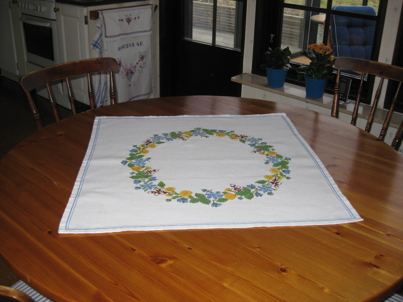 Häromåret började min mor sticka en kofta, men hon fick ont i sina händer och kunde inte sticka på ett bra tag. Hon frågade mig om jag kunde tänka mig att sticka den färdig, och det gjorde jag. Så blev hon bättre i sina händer och då erbjöd hon sig att brodera färdigt en korsstygnsduk som jag haft liggande påbörjad i flera år. Som tack för hjälpen med koftan, liksom. Idag fick jag duken, och se så fin den blevIMG_2841