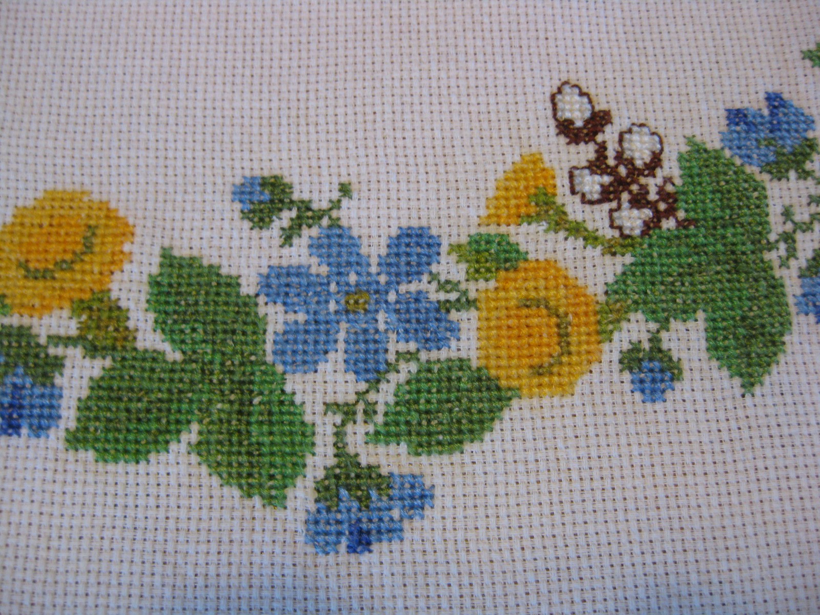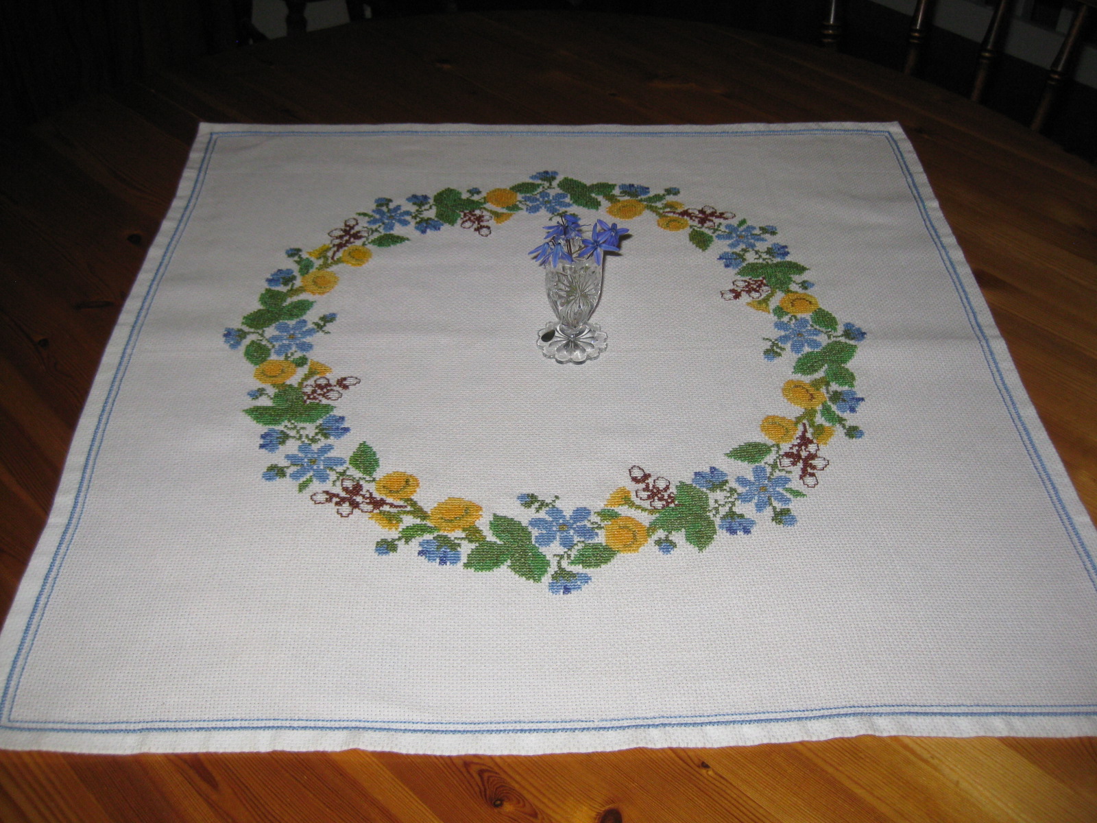 Jag tycker jättemycket om den här duken, lite för att det är min enda riktiga vårduk, men mest för att det är så roligt att vi broderat på den både mor och jag (mest mor).