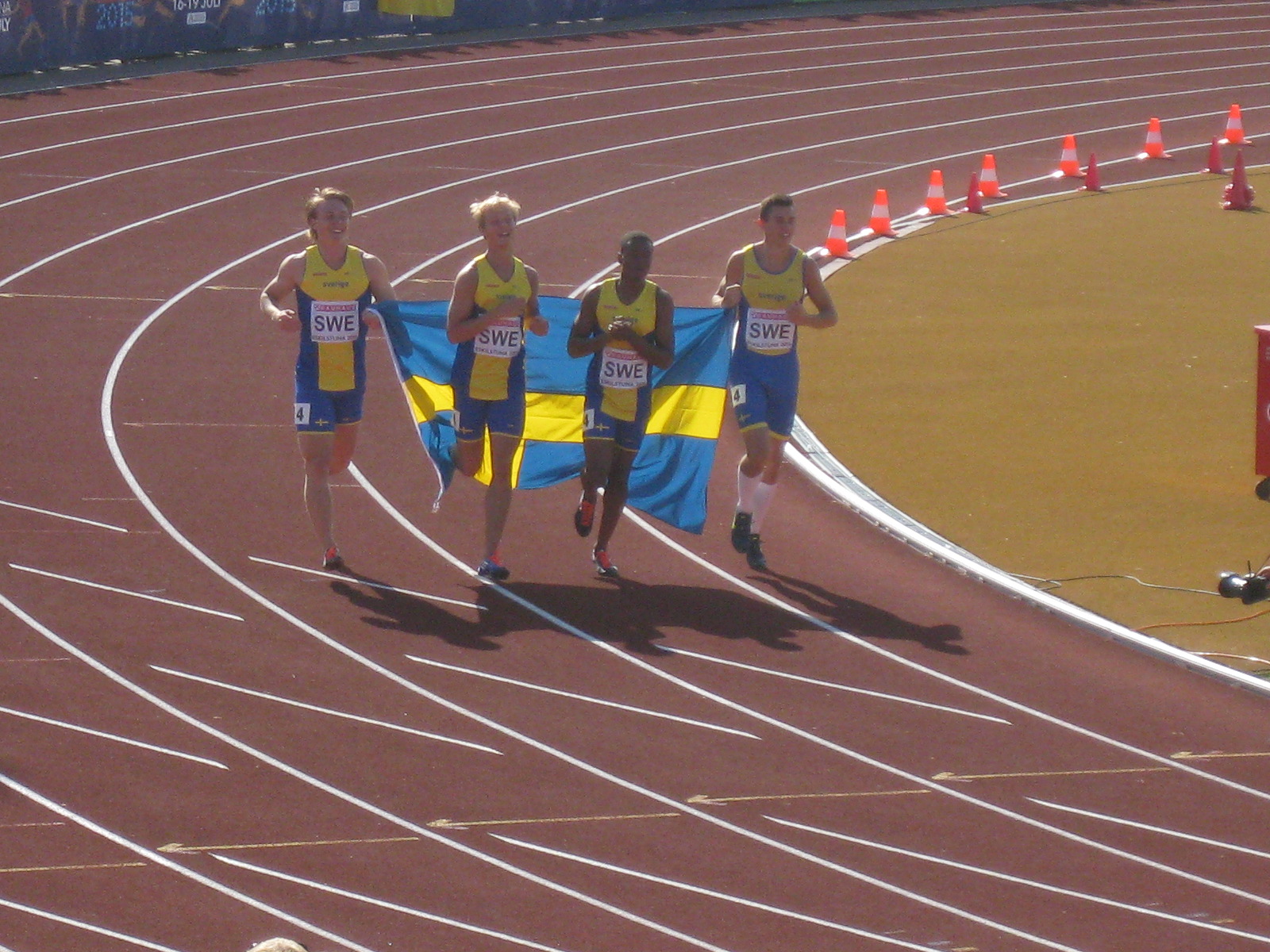 I helgen åkte vi med hem till My i Eskilstuna för att titta på JuniorEM i friidrott. Det var första gången ett så stort friidrottsevenemang arrangerades utanför ”storstäderna”. Och det var första gången jag tittade på friidrottstävlingar IRL. Det var riktigt roligt. Extra roligt för att vi fick se de här glada killarna ( Gustav Kjell, Emil Von Barth, Austin Hamilton och Thobias Nilsson Montler) vinna guld på 4 x 100 meter.