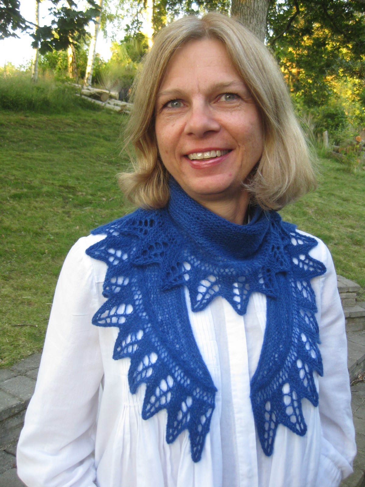 Tänk, jag som var orolig för att garnet inte skulle räcka – och så är det 20 gram kvar av min 50 gramshärva. Ska du sticka en sådan här sjal så råder jag dig att verkligen göra uddspetsen 2 m lång så som det står i beskrivningen. Sjalen blir nämligen inte lika lång som uddspetsen. Min sjal blev 140 cm lång (39 uddar). Den var 195 cm lång innan jag började plocka upp maskor till det rätstickade partiet. Garnet är Malabrigo lace och jag har stickat med stickor nr 4.