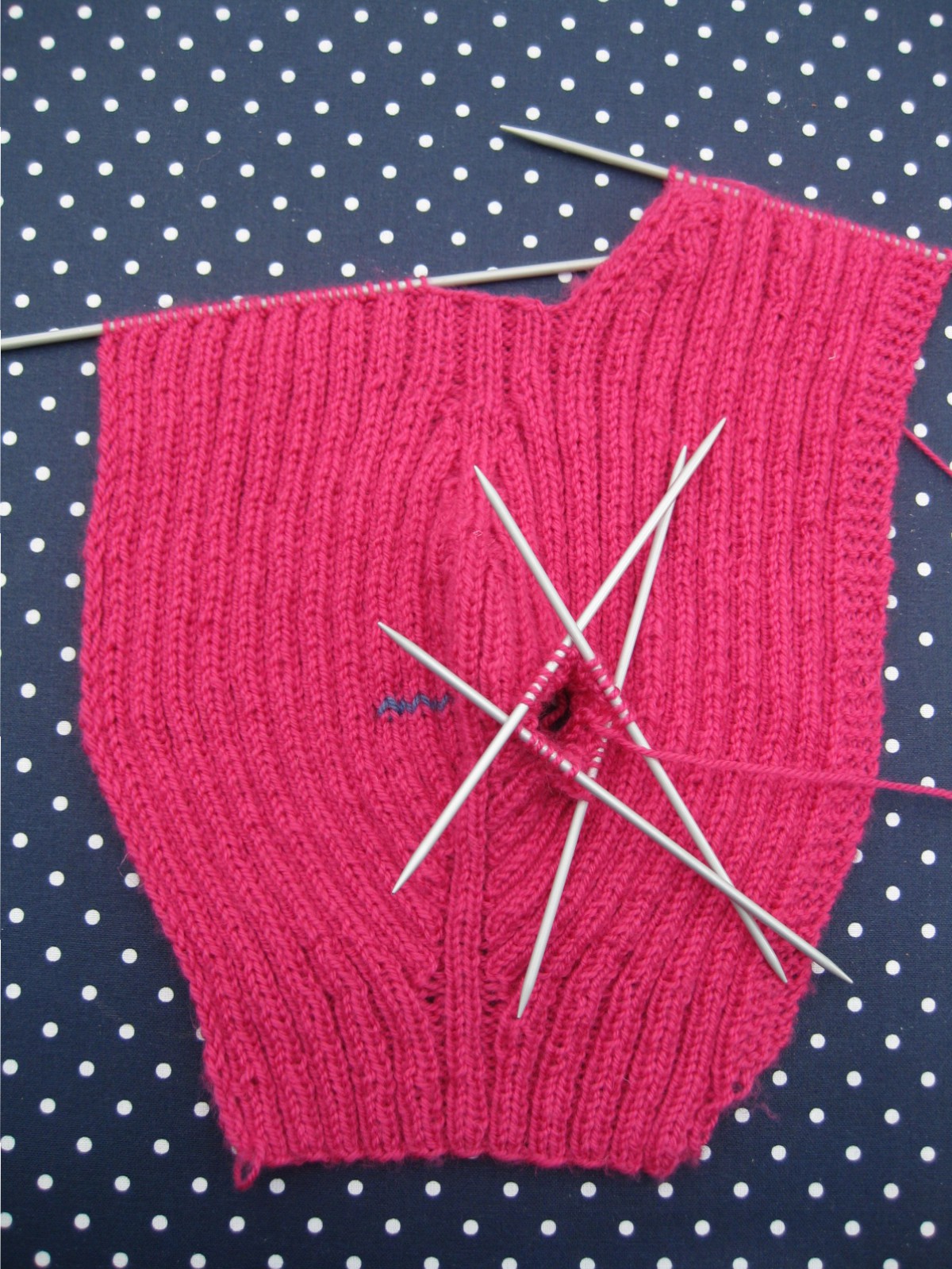 Min tanke har varit att försöka hålla mig konsekvent till ribbstickning och få ökningar och minskningar att passa in i mönstret. Det var det som krånglade till det vid bröstkorgen där jag behövde öka på avigsidan också. Att ”tänka spegelvänt” är inte min starkaste gren.