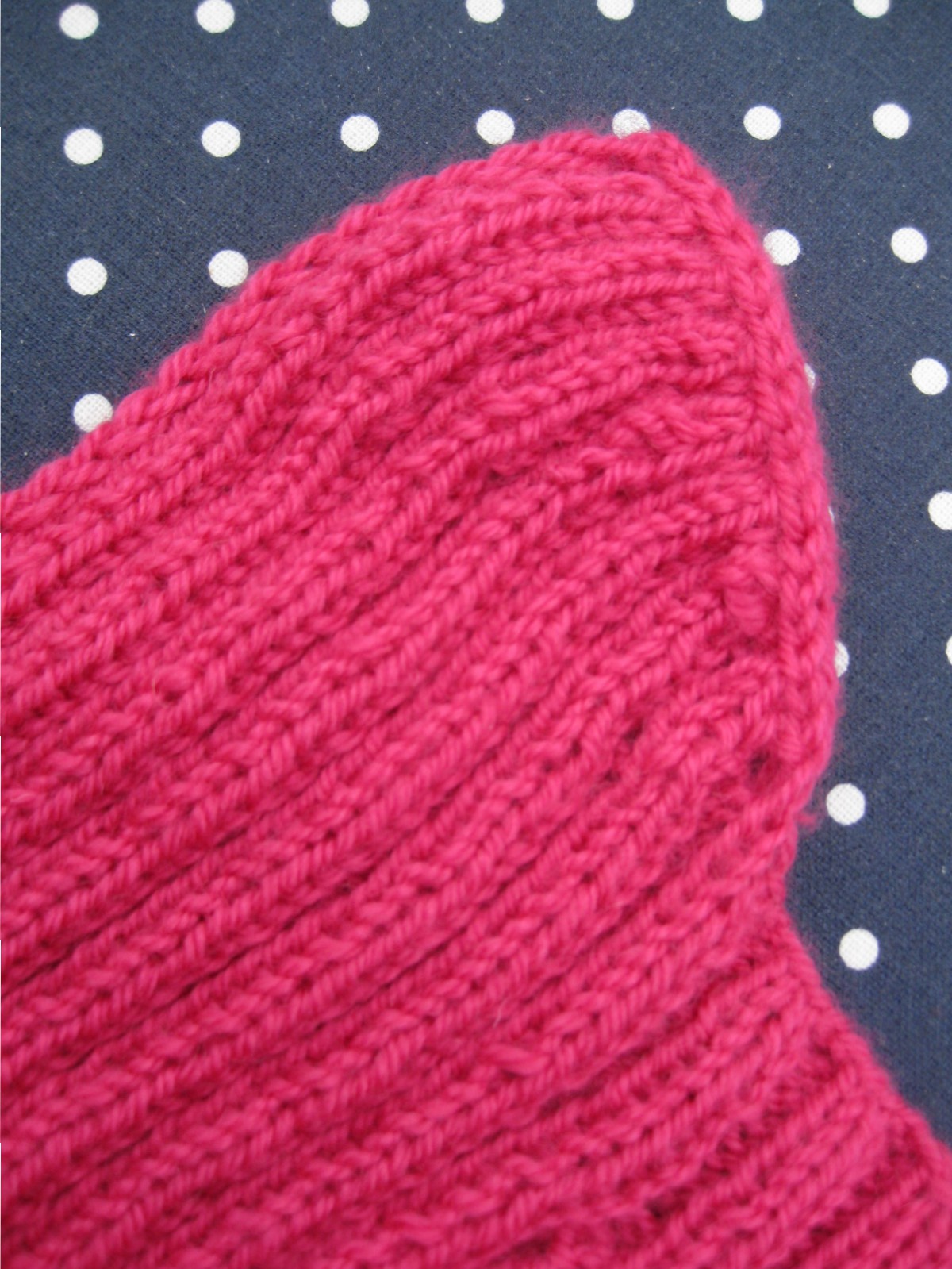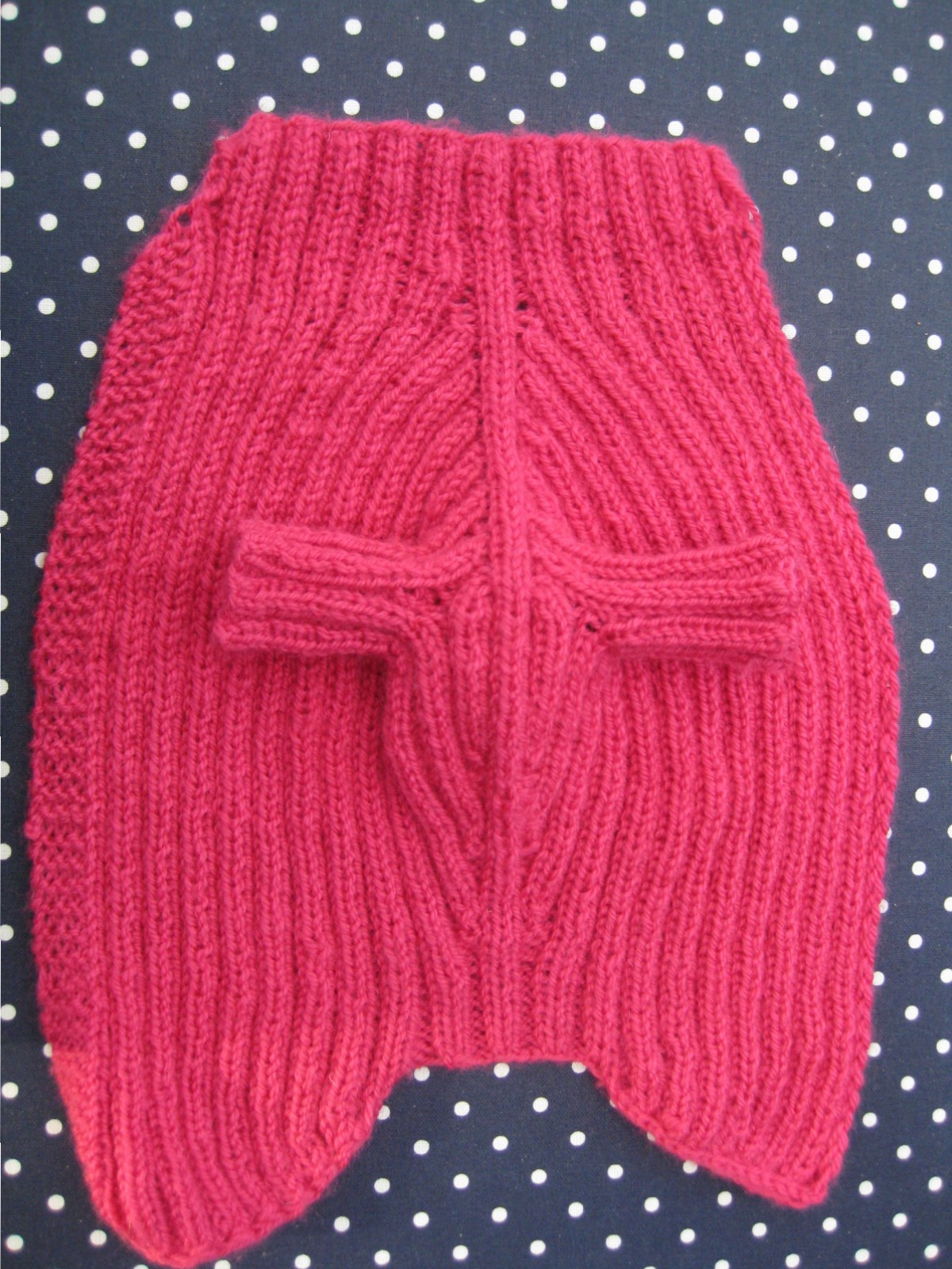 Jag stickade in garn i avvikande färg där benen skulle vara – som man gör med vant-tummar. Maskantalet bestämdes dels av Alice bens tjock(?)lek, dels av ribbstickningsmönstret.