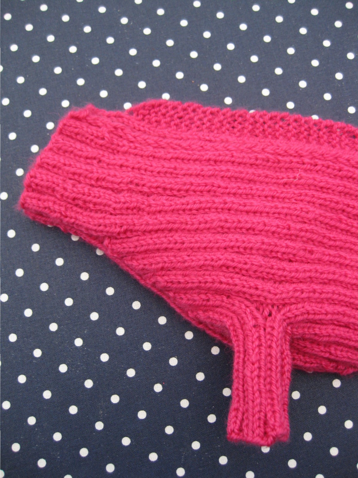 Jag gjorde ett par förkortade varv i nacken för att koftan inte ska vecka sig där, ser man på bilden kunde jag gjort några fler. Och så är det några förkortade varv där bak också för att koftan ska svänga ner runt baken. Eftersom jag inte precis bor ”next door to Alice” har jag fått titta på fotot av henne för att få rätt proportioner när inte mina måttanteckningar varit tillräckliga. Och så tittade jag lite på foton av andra vinthundar, och då insåg jag vad Alice matte menat med att det nog var lättare att sticka en kofta till en tik. Ett kroppsdel mindre att ta hänsyn till vid designen om man säger så. Tack och lov för det!