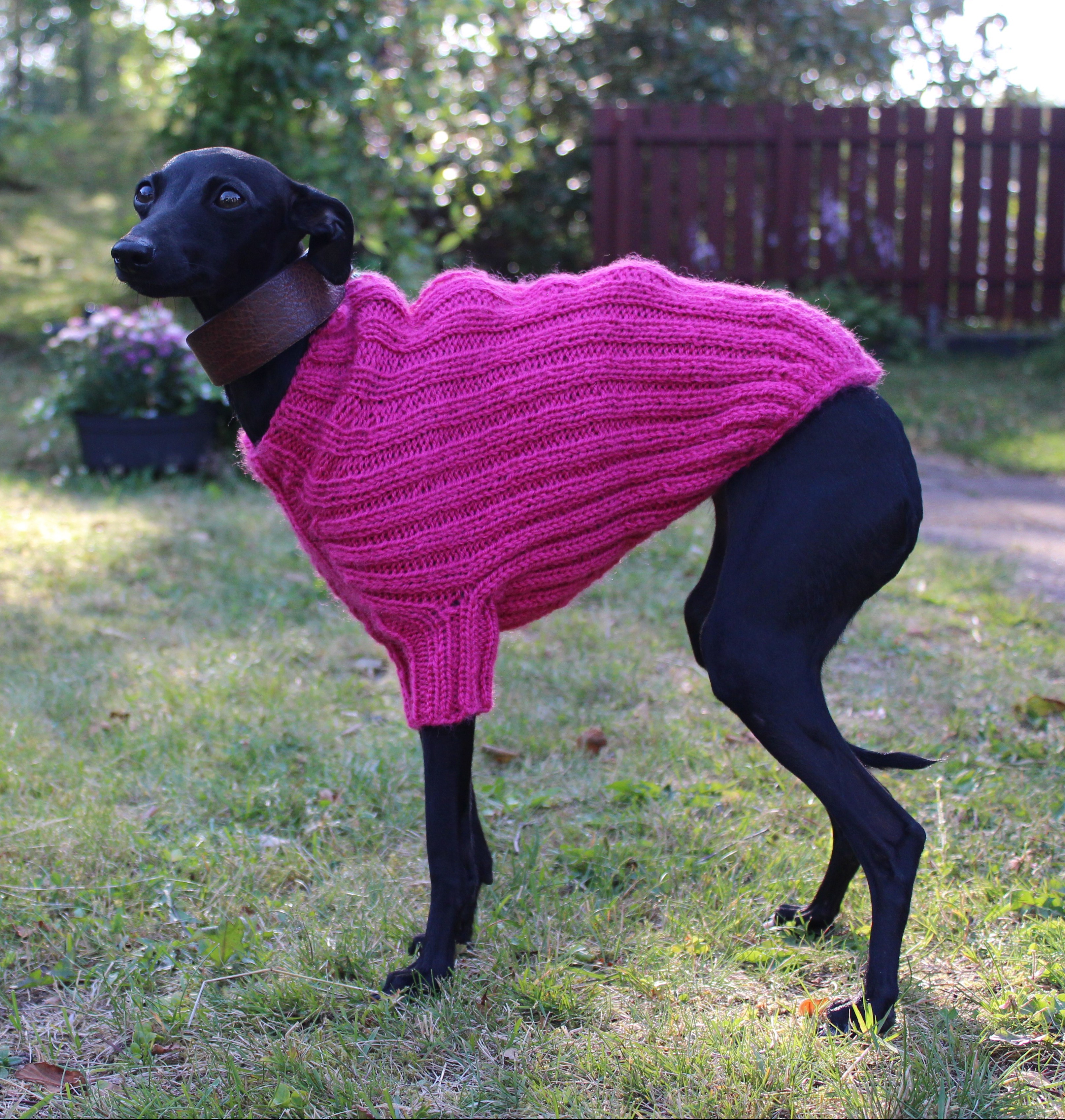 Alice behövde det i alla fall. Nu har hon fått en. Det har varit ett roligt projekt, bortsett från knåpandet med ökningar mitt fram. Jag har sett det som en utmaning att få fram en modell precis som jag (och Alice matte och husse) ville ha den. Önskemålen var knäppning med kardborrband på ryggen så att det ska vara lätt att ta på koftan, koftlängd till svansen ungefär och 4-5 cm ärmar, jag menar ben. Vi enades om ribbstickning för passformens skull.