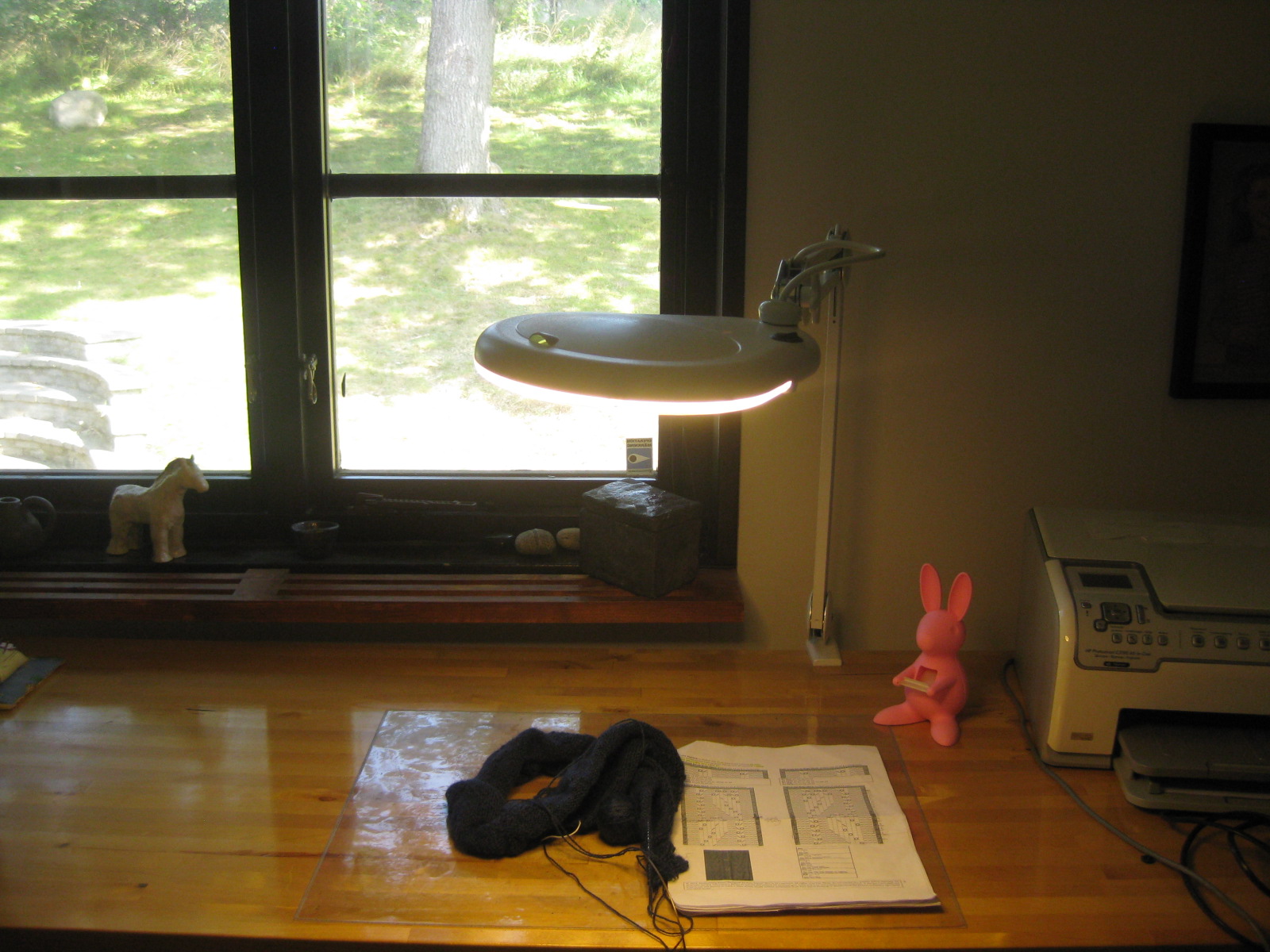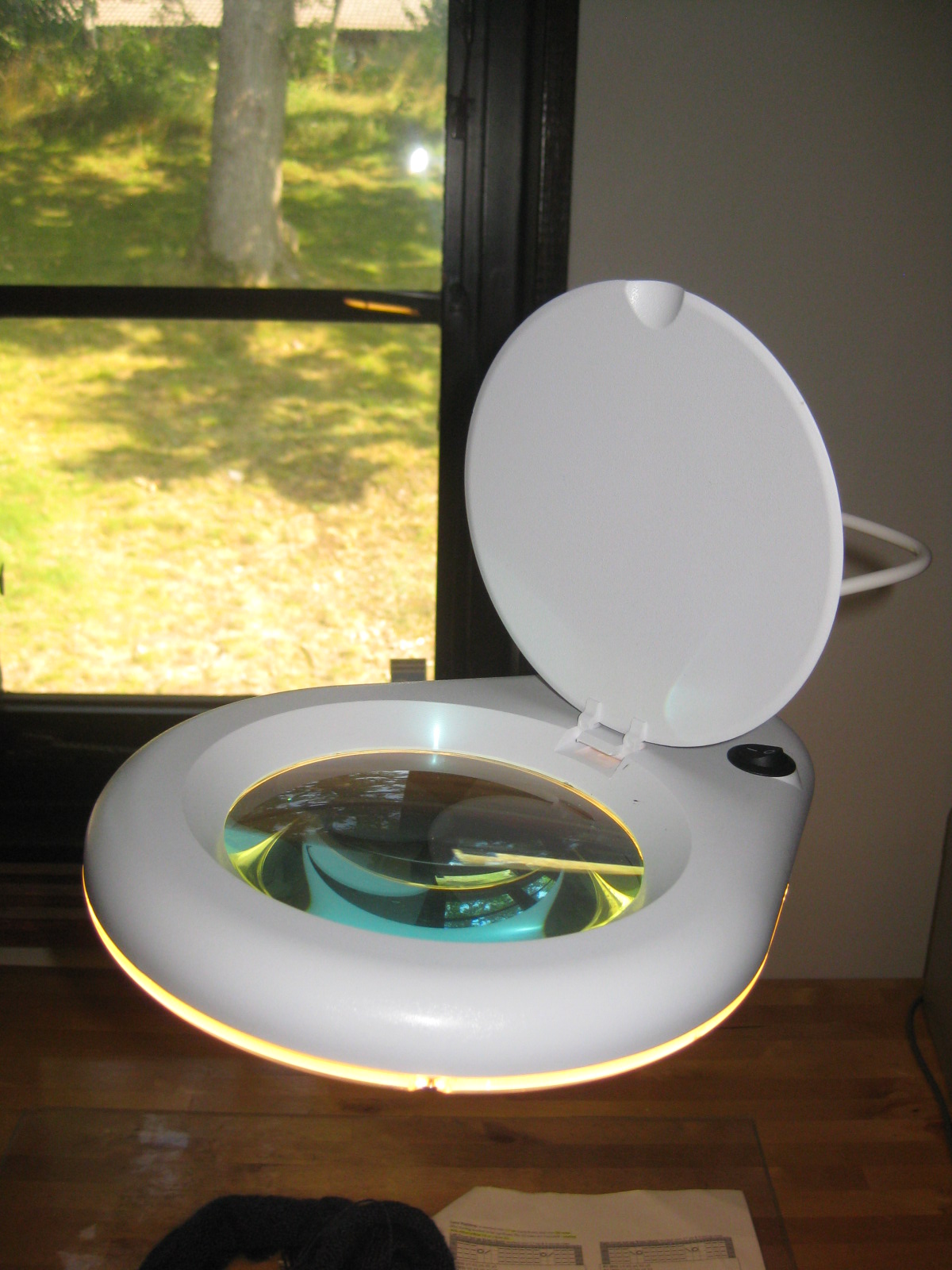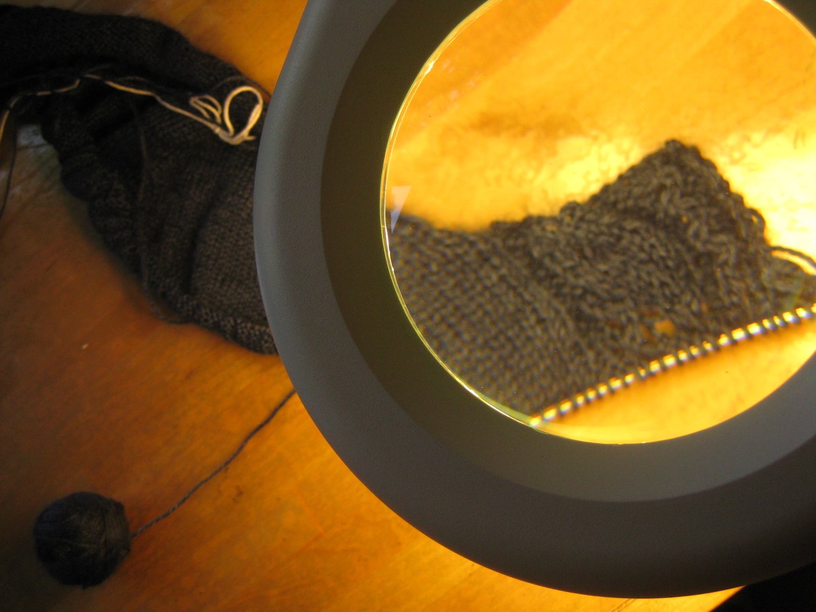 Jag har redan haft stor glädje av lampan. Som jag berättat i ett tidigare inlägg har jag börjat sticka en kofta i ett garn av alpacka och silke, ett ljuvligt garn men ack så halt. Vid några tillfällen har jag råkat tappa en maska och då har den här lampan varit till nytta. Maskorna kryper nämligen inte bara iväg. De tycks krympa ihop också, så förstoringsglaset har behövts för att jag överhuvudtaget skulle kunna se dem.