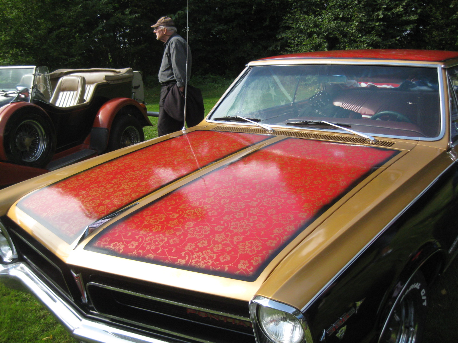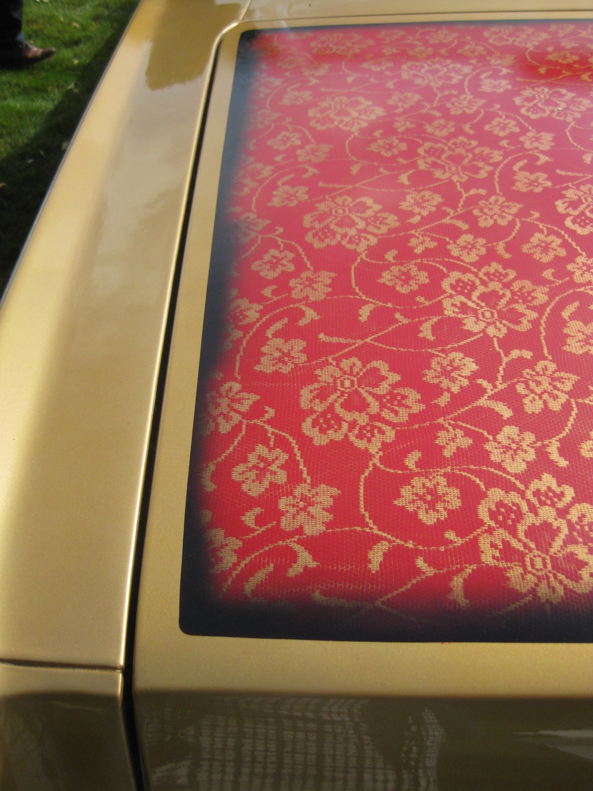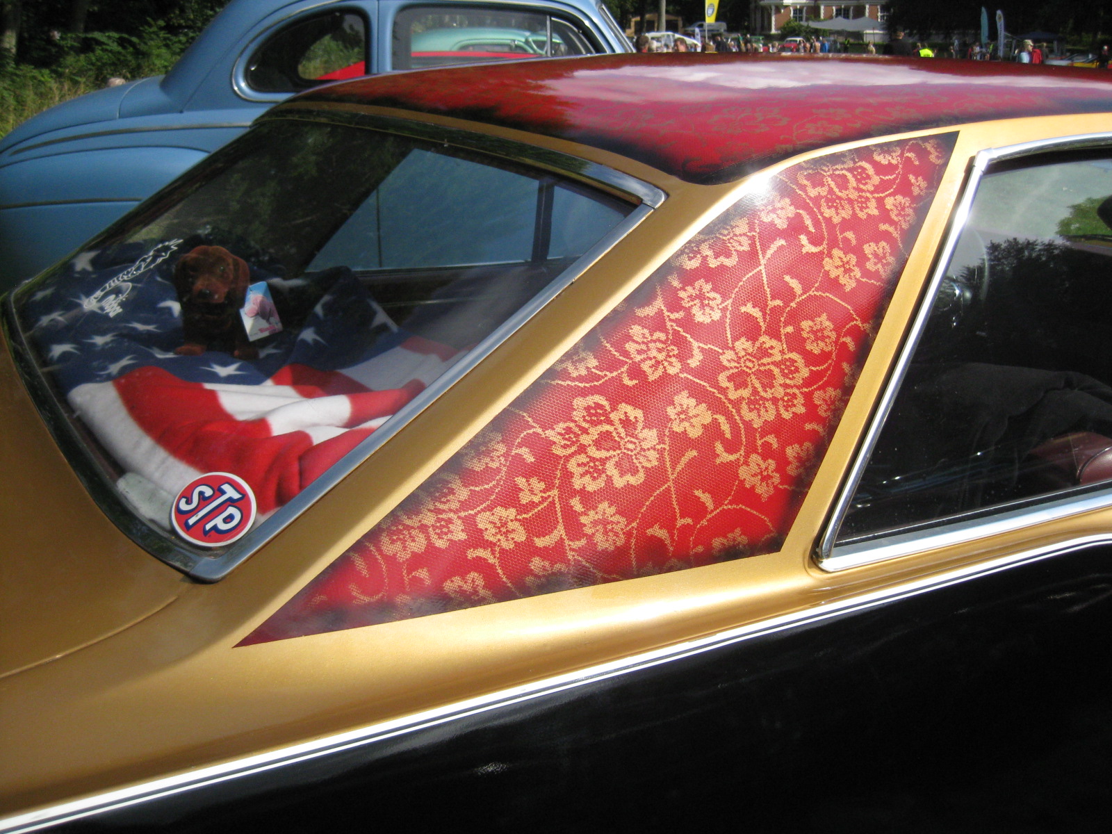 och till och med sidostolparna bak (eller vad de kallas) är schablonmålade med spetsgardin från IKEA som schablon och sedan lackade med fyra lager klarlack. Visst är det textilrelaterat, så säg?! Bilen är en Pontiac Le Mans från 1965.